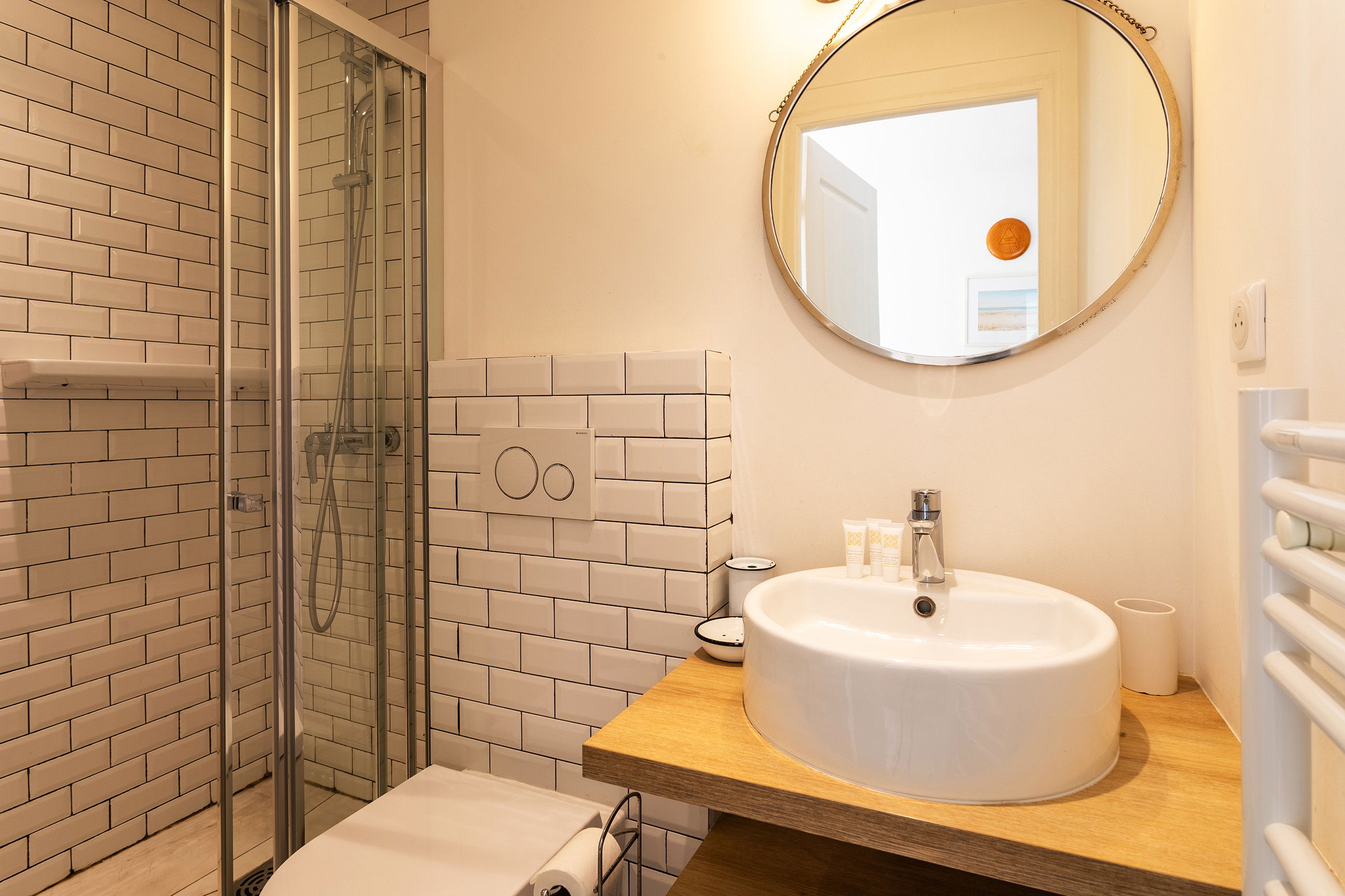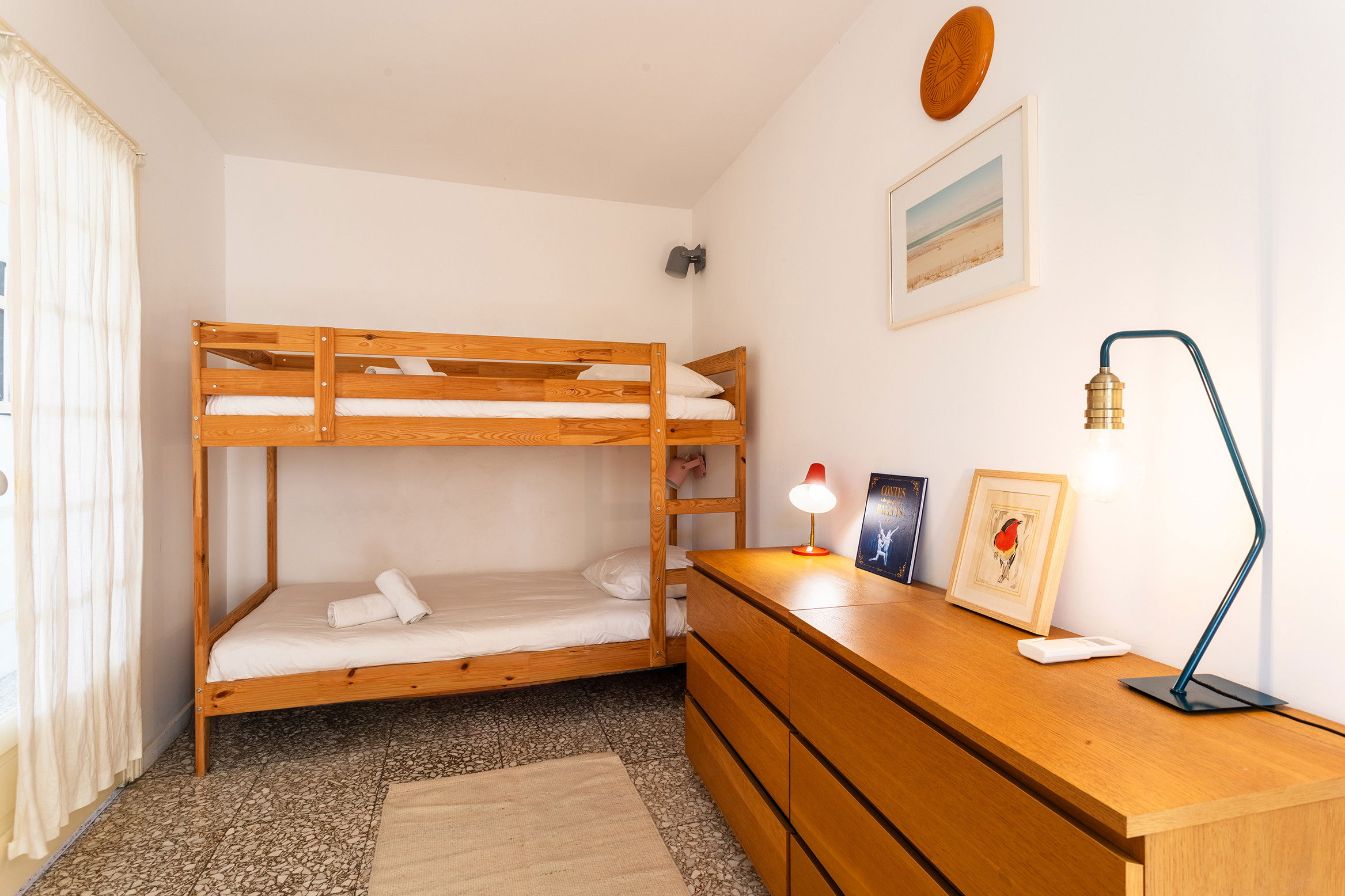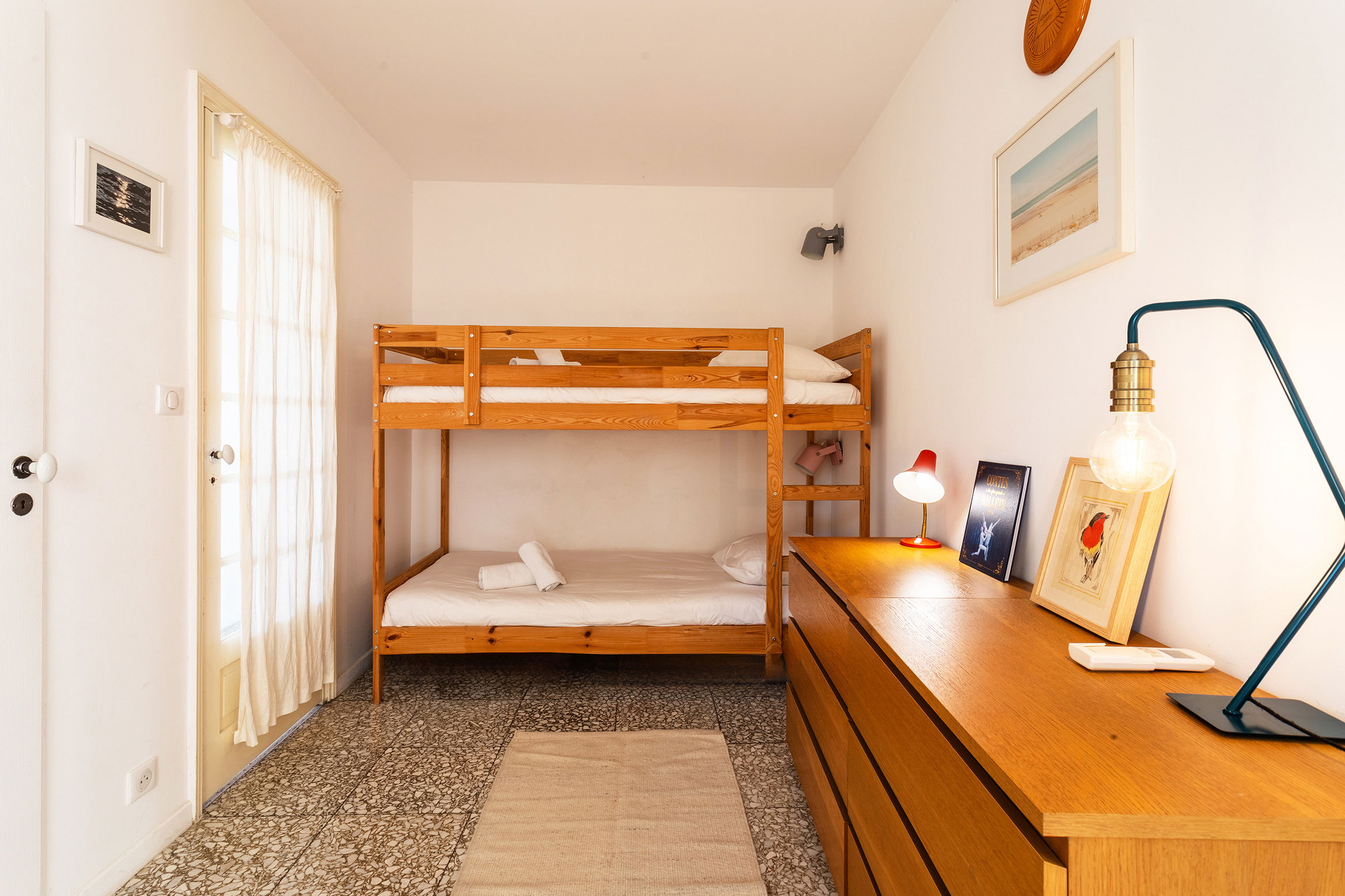 The second bedroom with bunk beds, sideboard and small wardrobe. French door opening onto the terrace. It has its shower room with shower, WC, washbasin and storage.