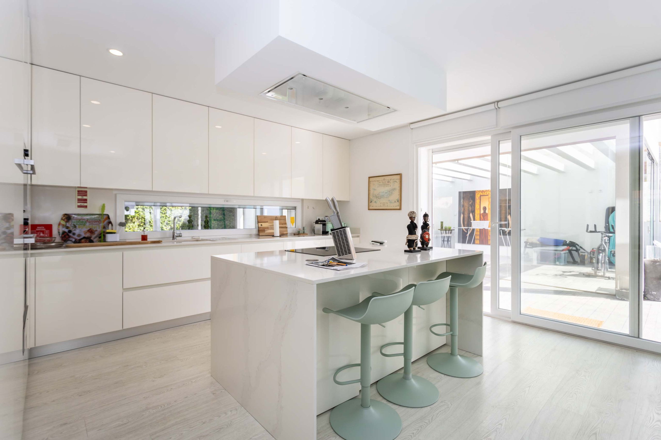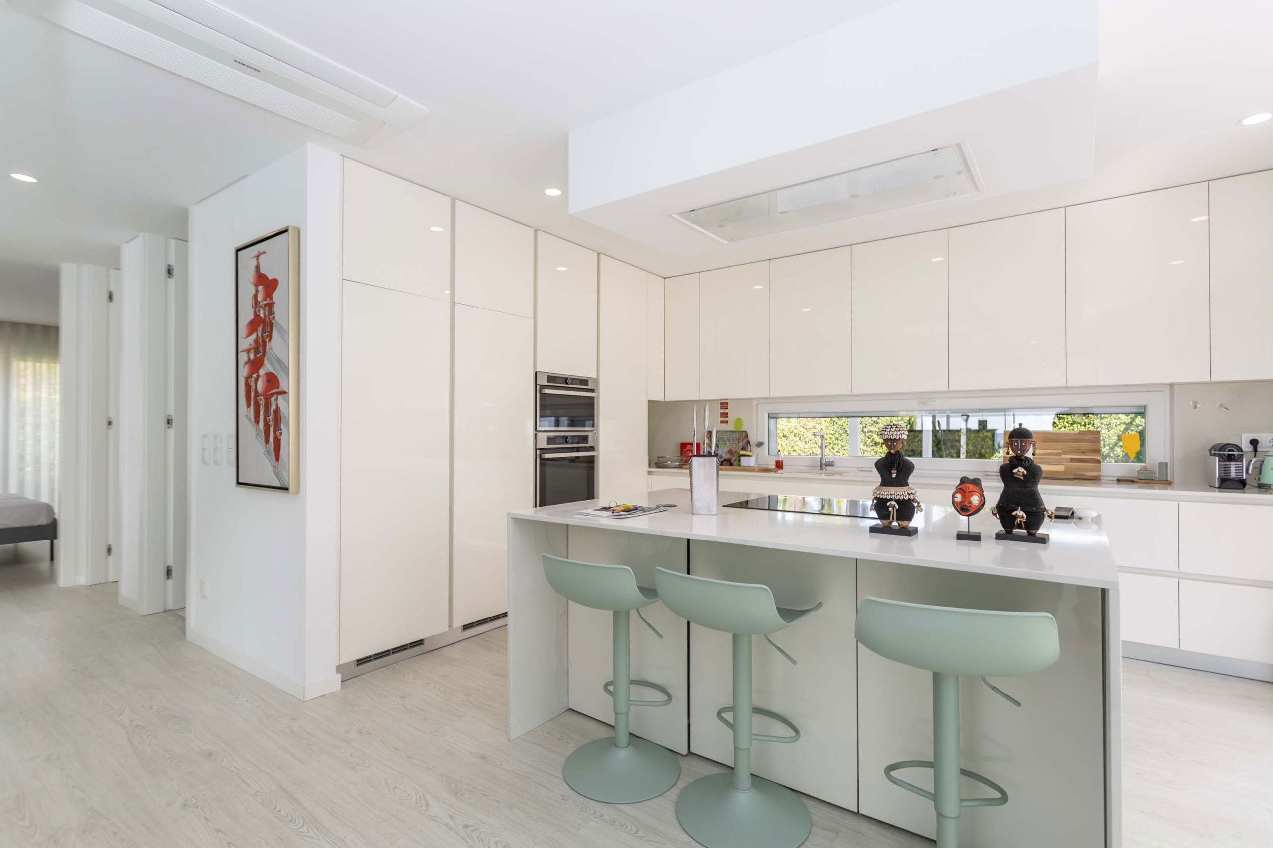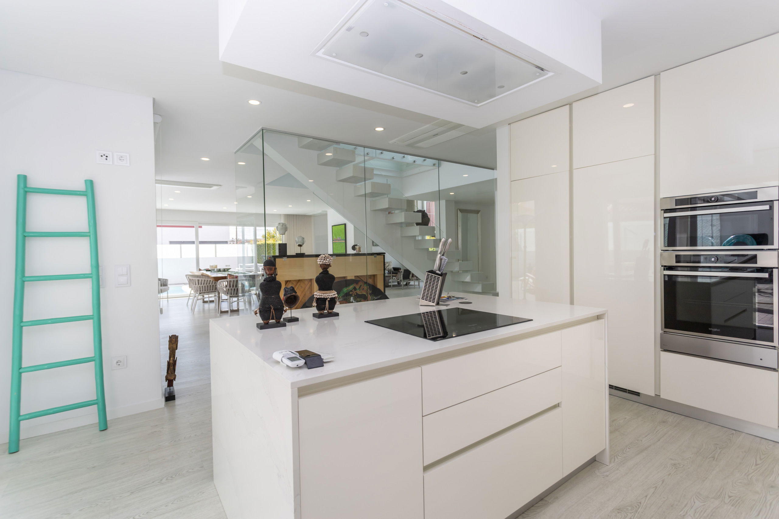 The open plan kitchen, of induction, is equipped with refrigerator, microwave, oven, freezer, dishwasher, dishes/cutlery, kitchen utensils, coffee machine, toaster, kettle and hob.