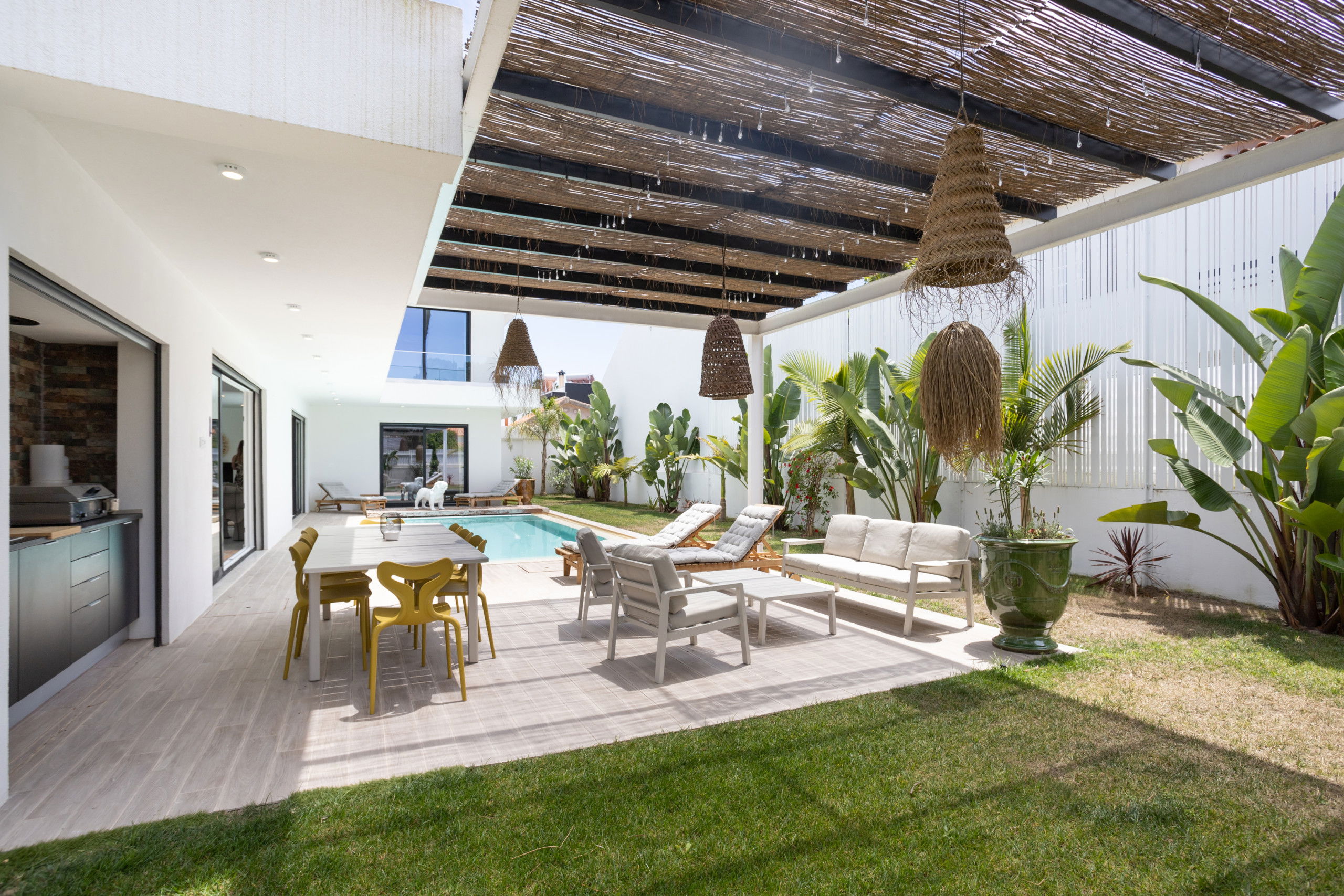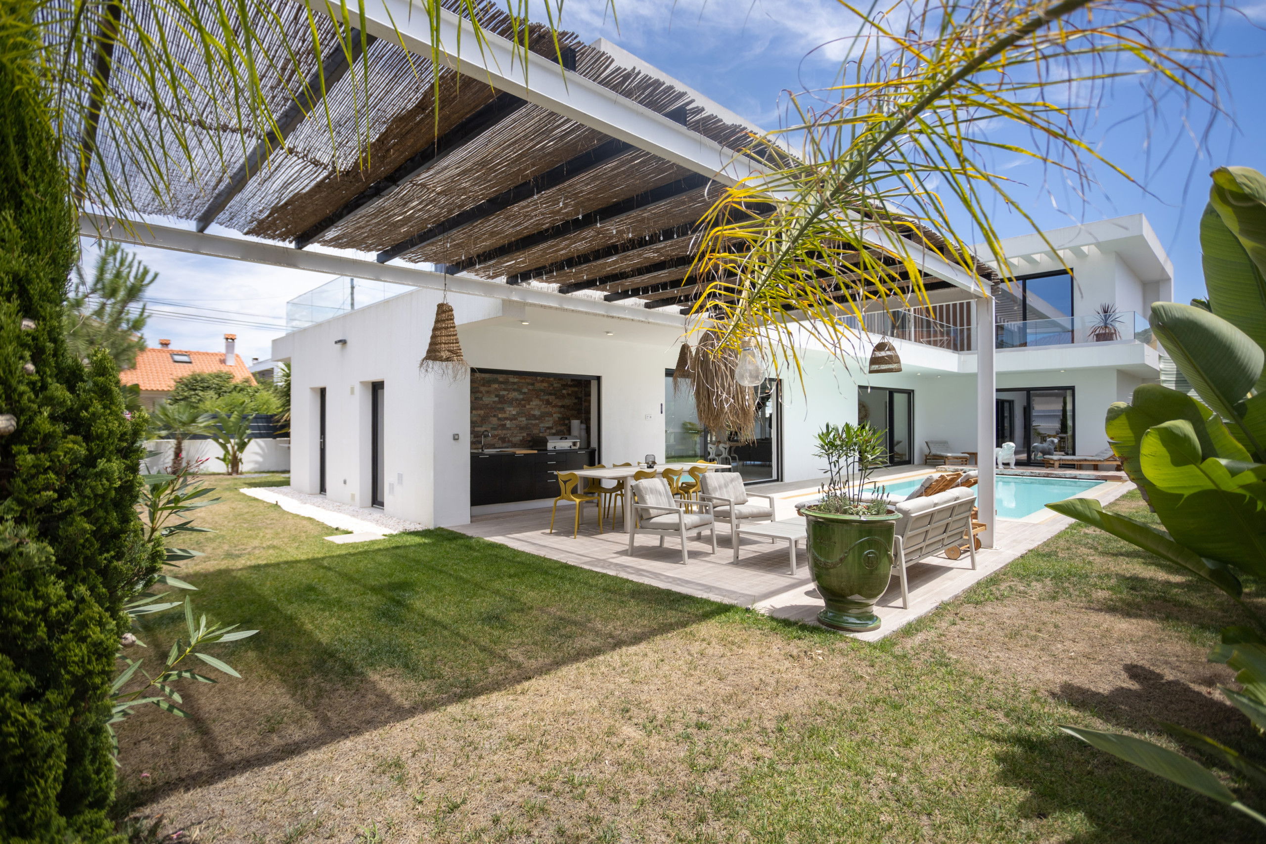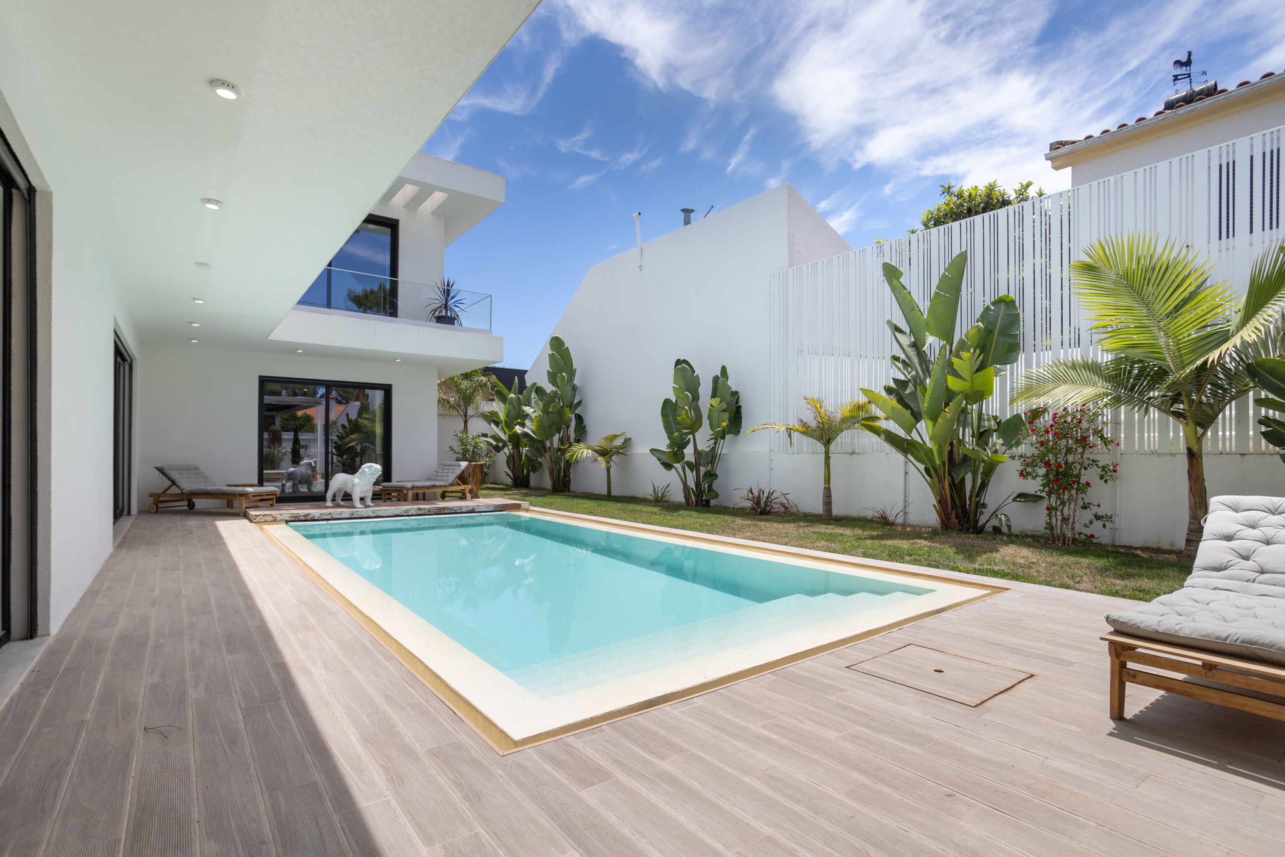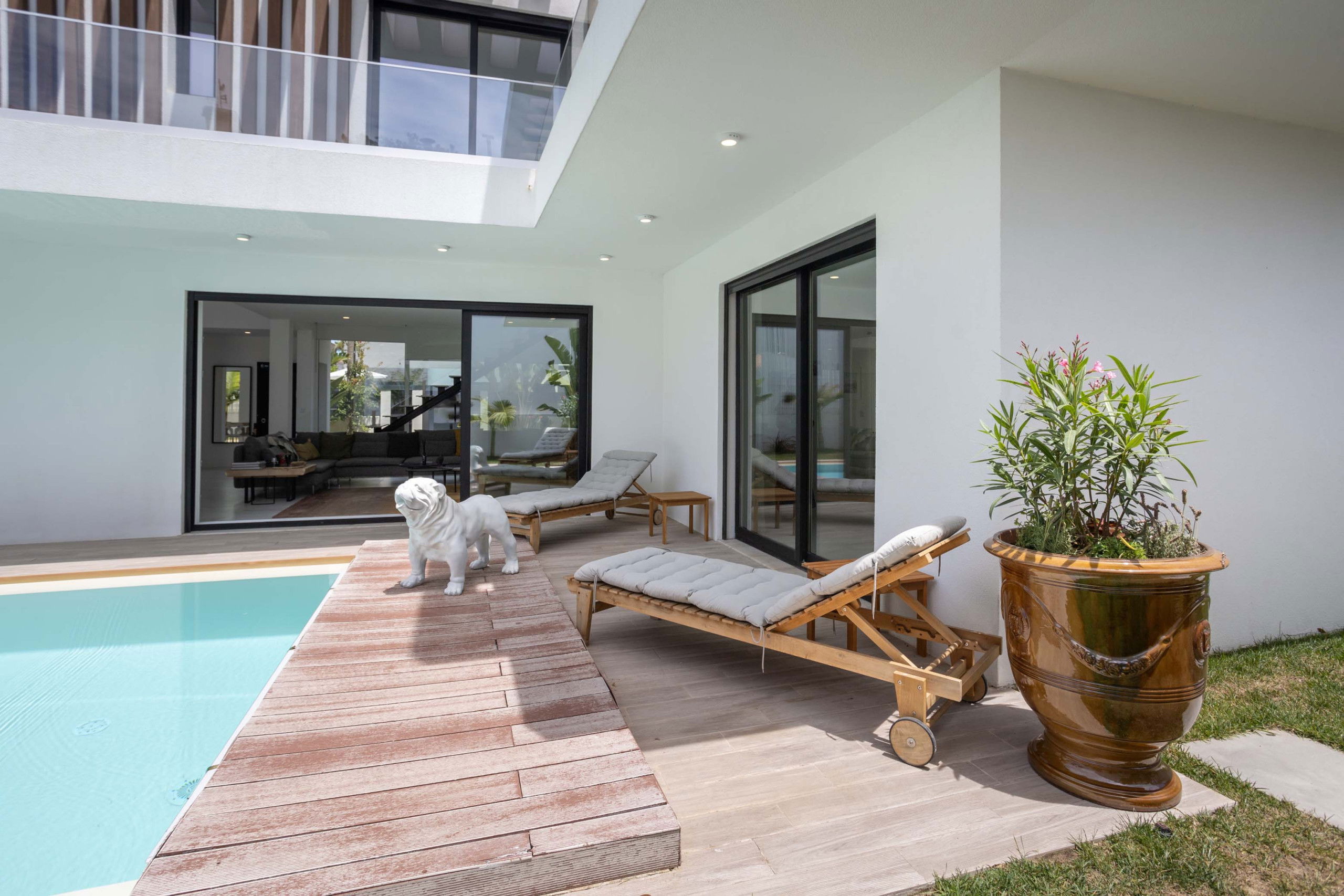 The villa features a superb private swimming pool, perfect for relaxing and enjoying the sun in complete privacy. Around the pool, sun loungers and a lounge area invite you to unwind and enjoy the tranquil setting.