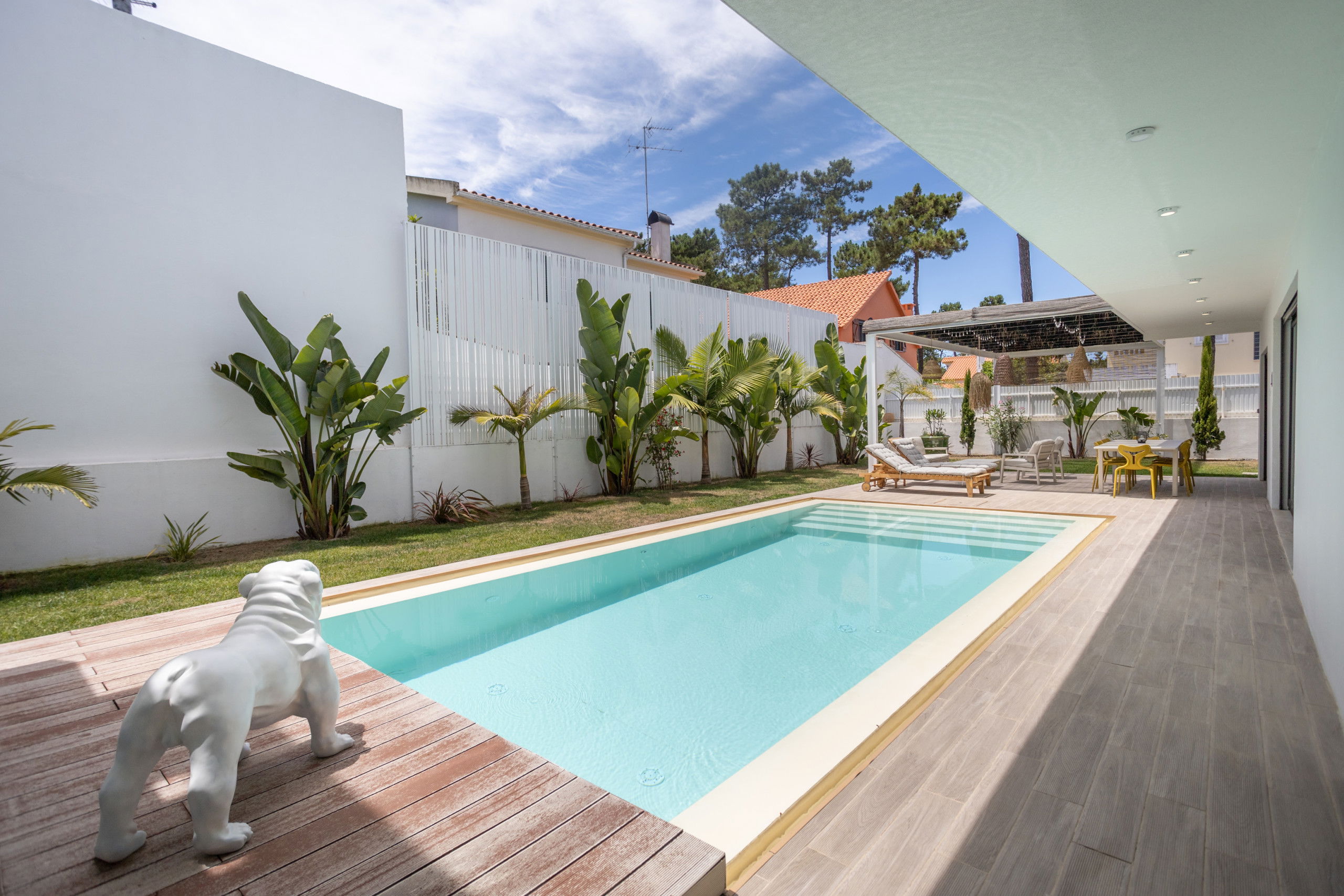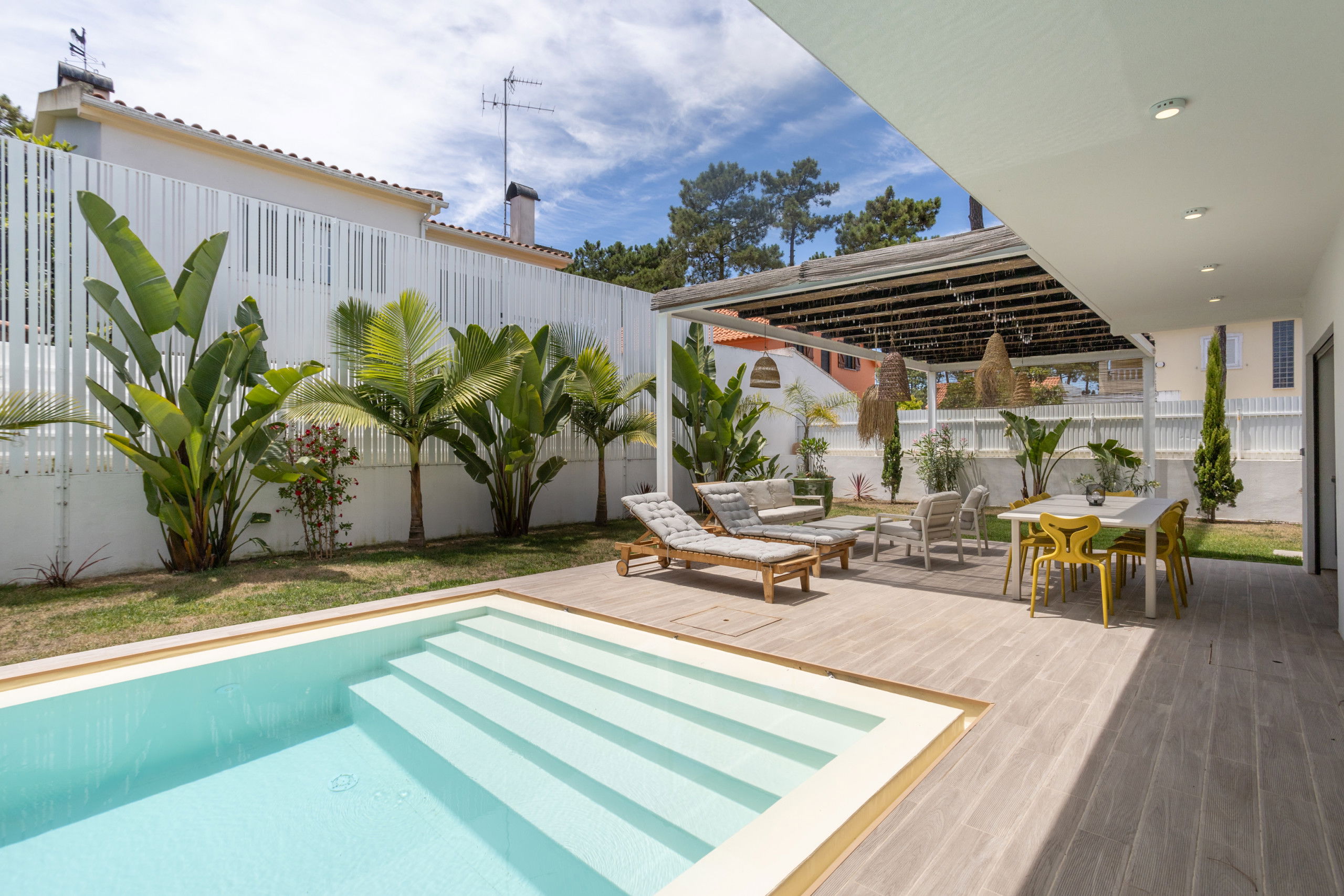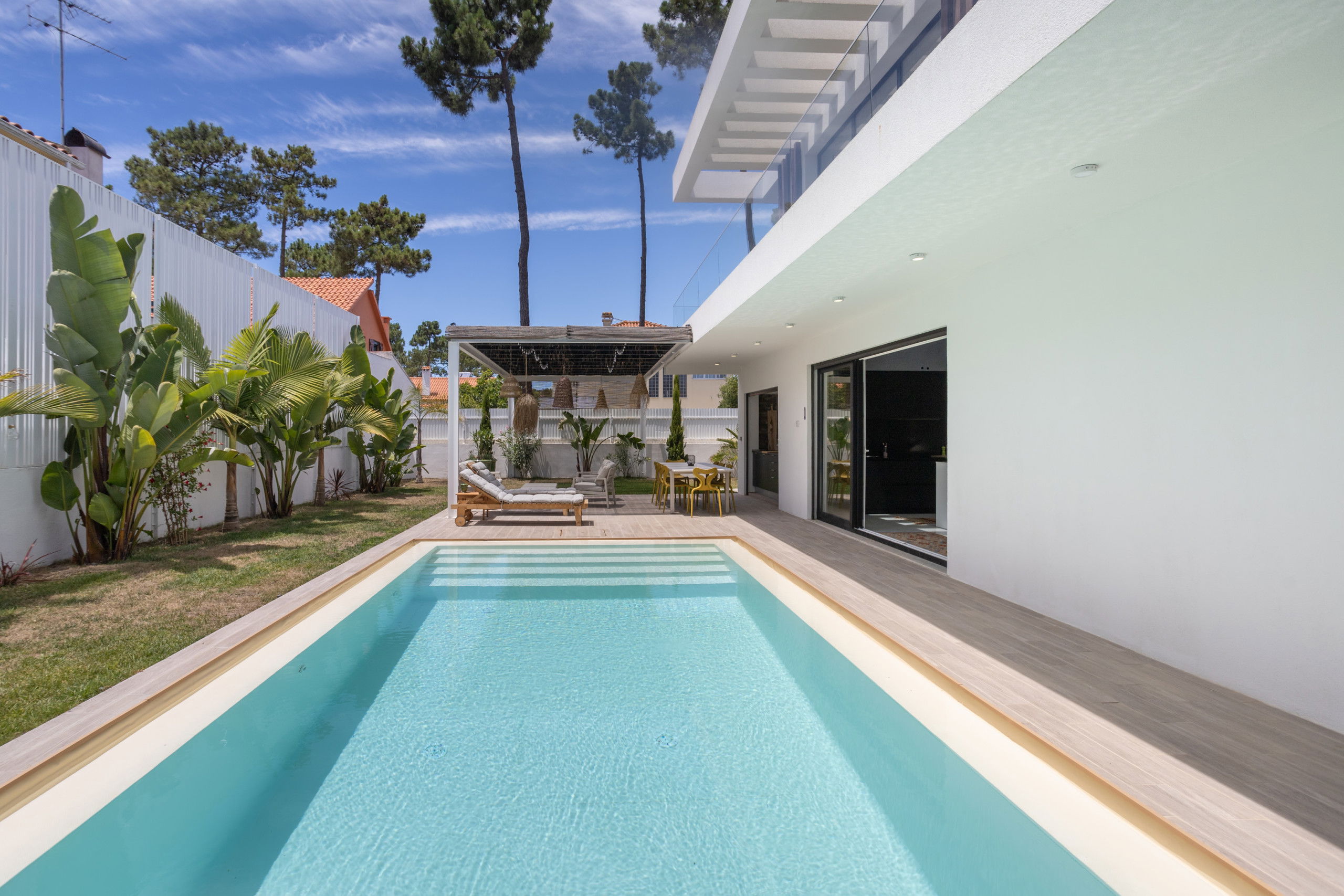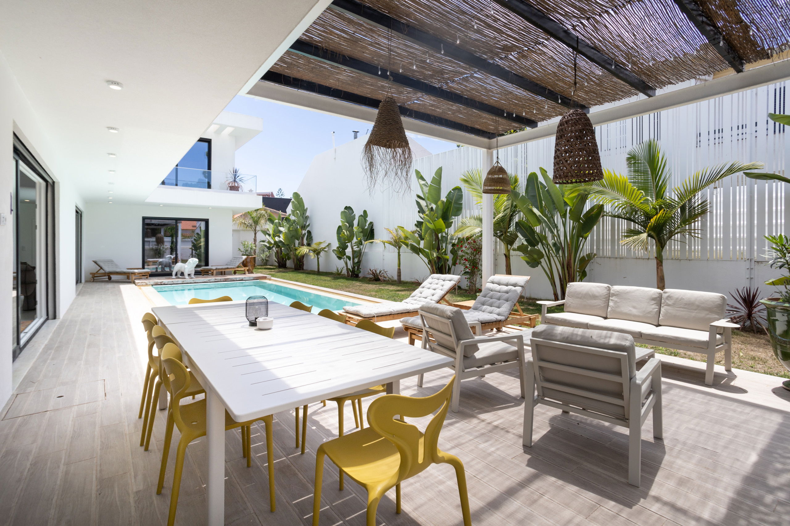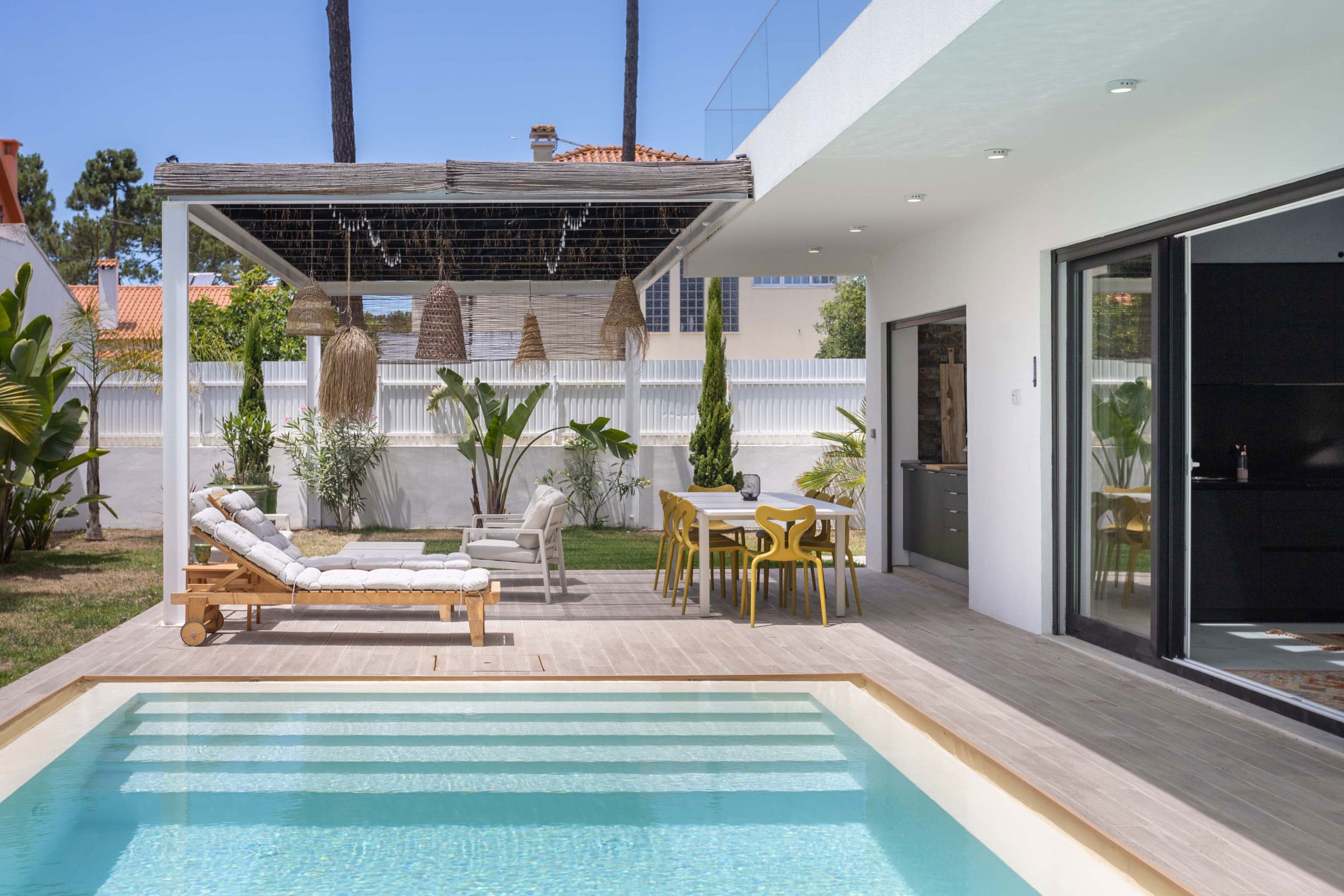 The villa features a superb private swimming pool, perfect for relaxing and enjoying the sun in complete privacy. Around the pool, sun loungers and a lounge area invite you to unwind and enjoy the tranquil setting.