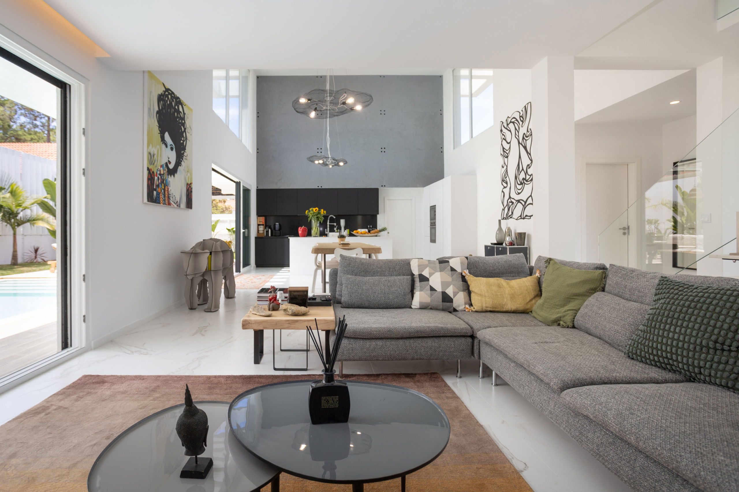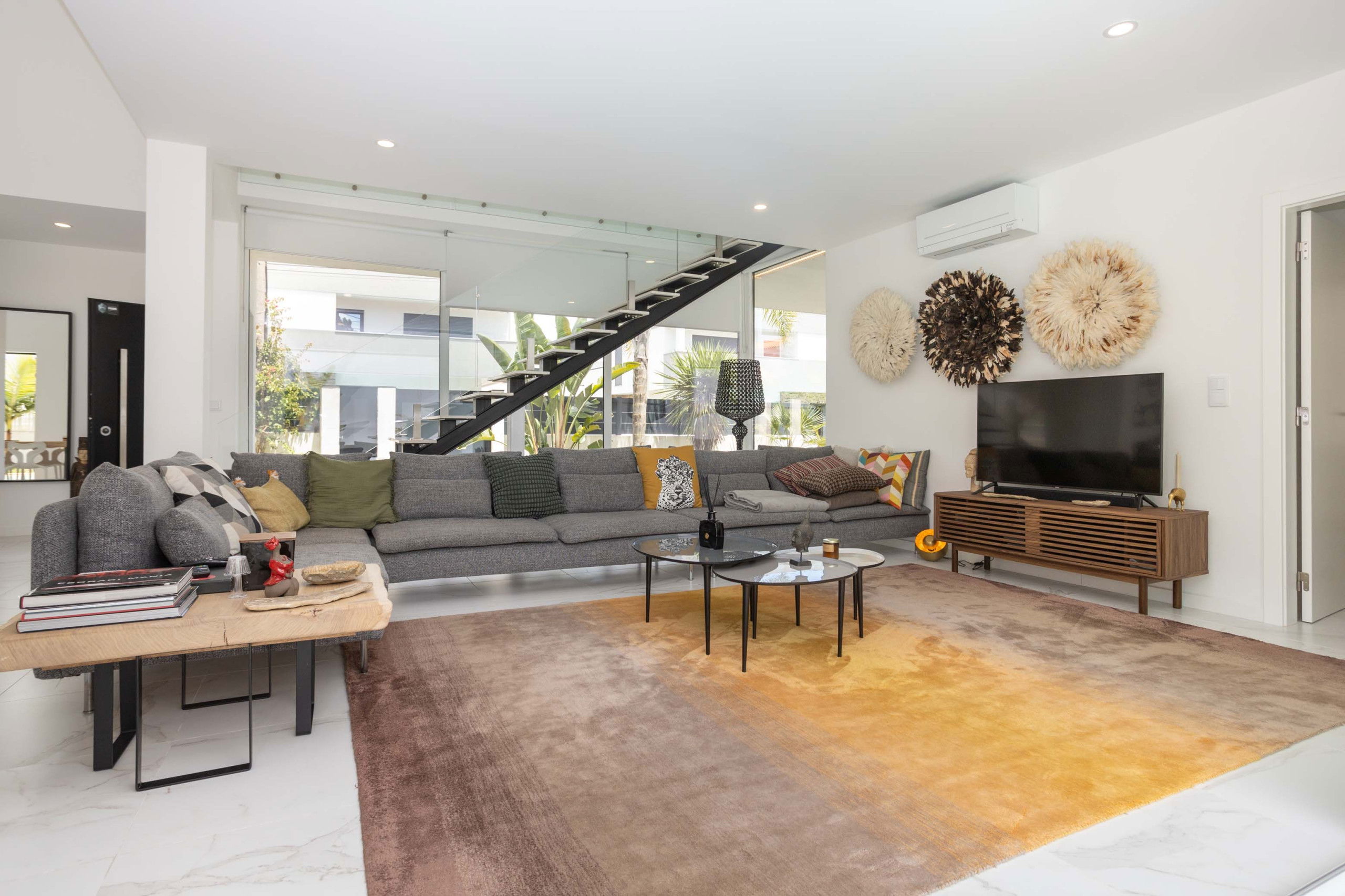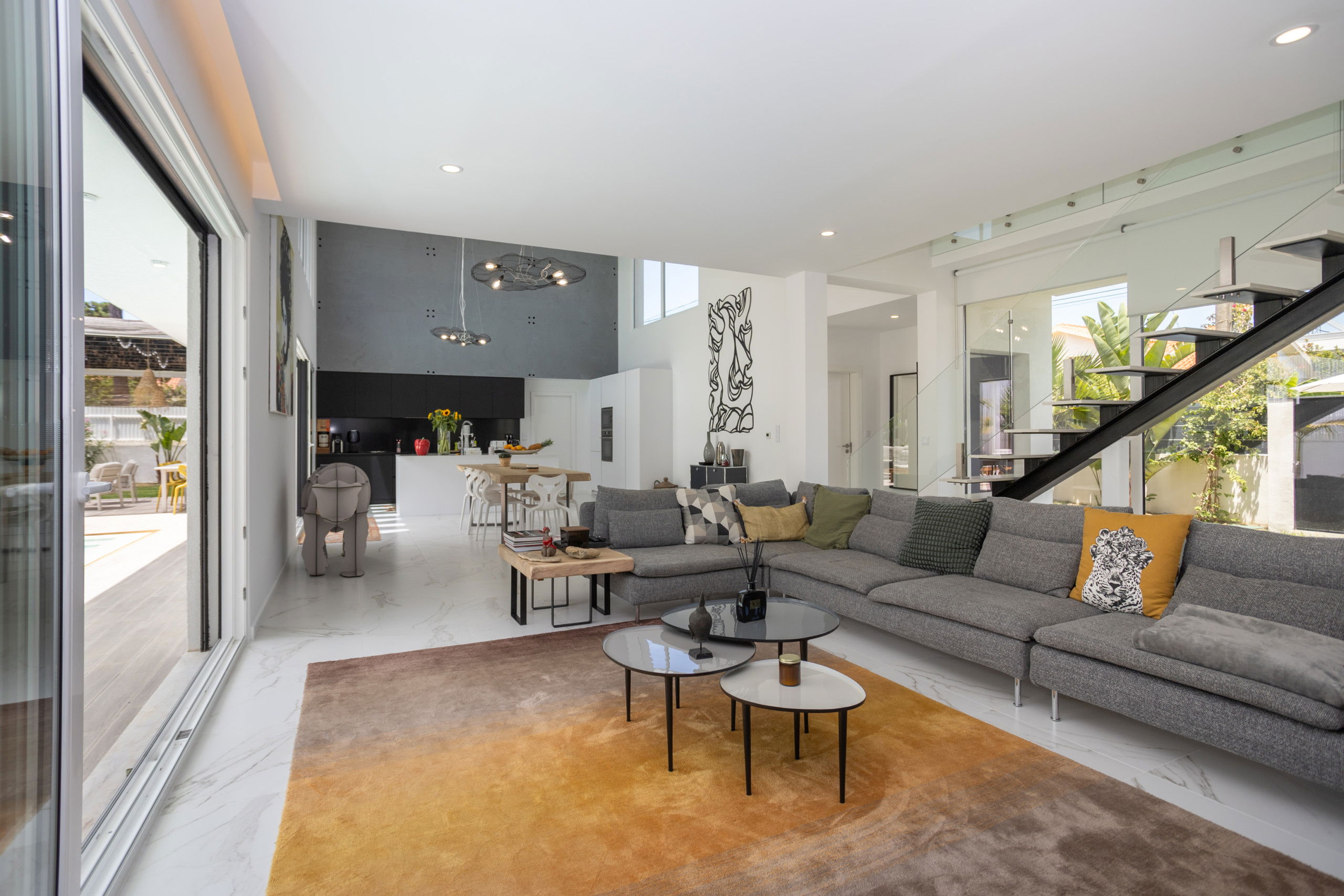 The interior of the villa is carefully designed with modern furniture and refined decorative touches. The spacious living room, with its comfortable sofas and large television, is perfect for relaxing moments with family or friends.