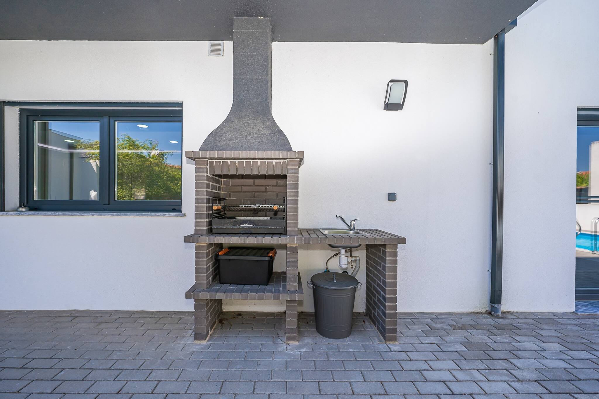 Outside, an inviting outdoor living area awaits, equipped with a barbecue for memorable al fresco meals, a dining table, a garden lounge, and sun loungers for relaxing by the pool.