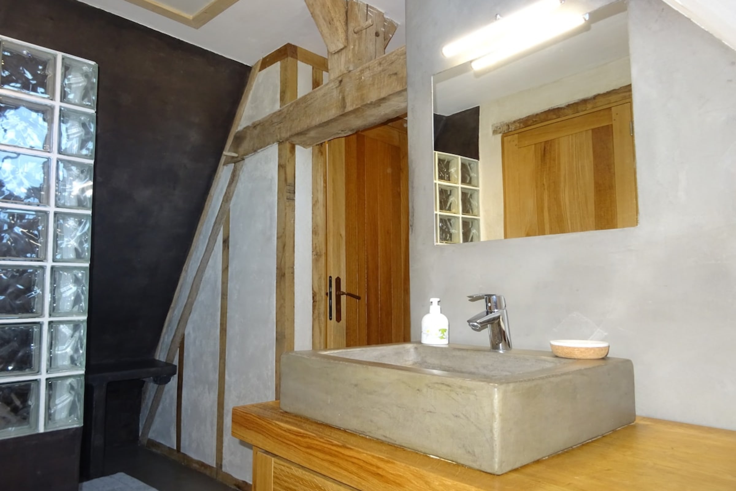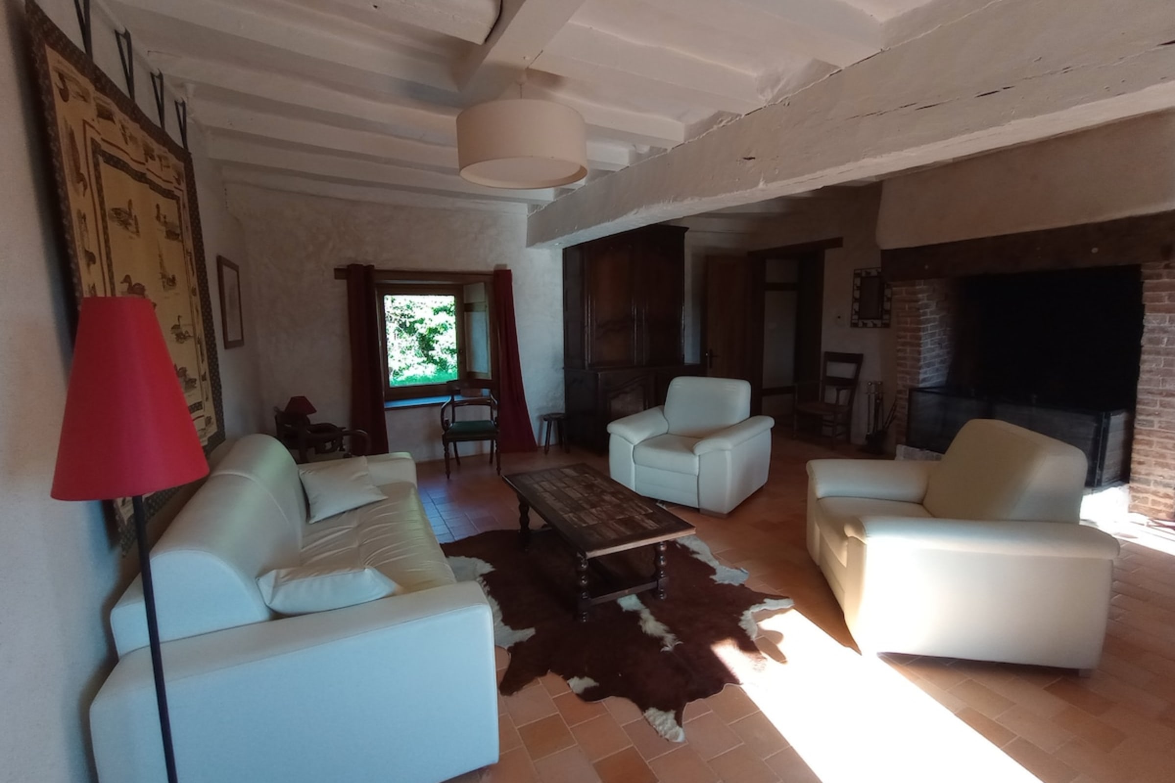 Cozy living room with exposed beams and large fireplace, perfect for convivial evenings. Comfortable sofas, cozy blankets, books, and board games available.