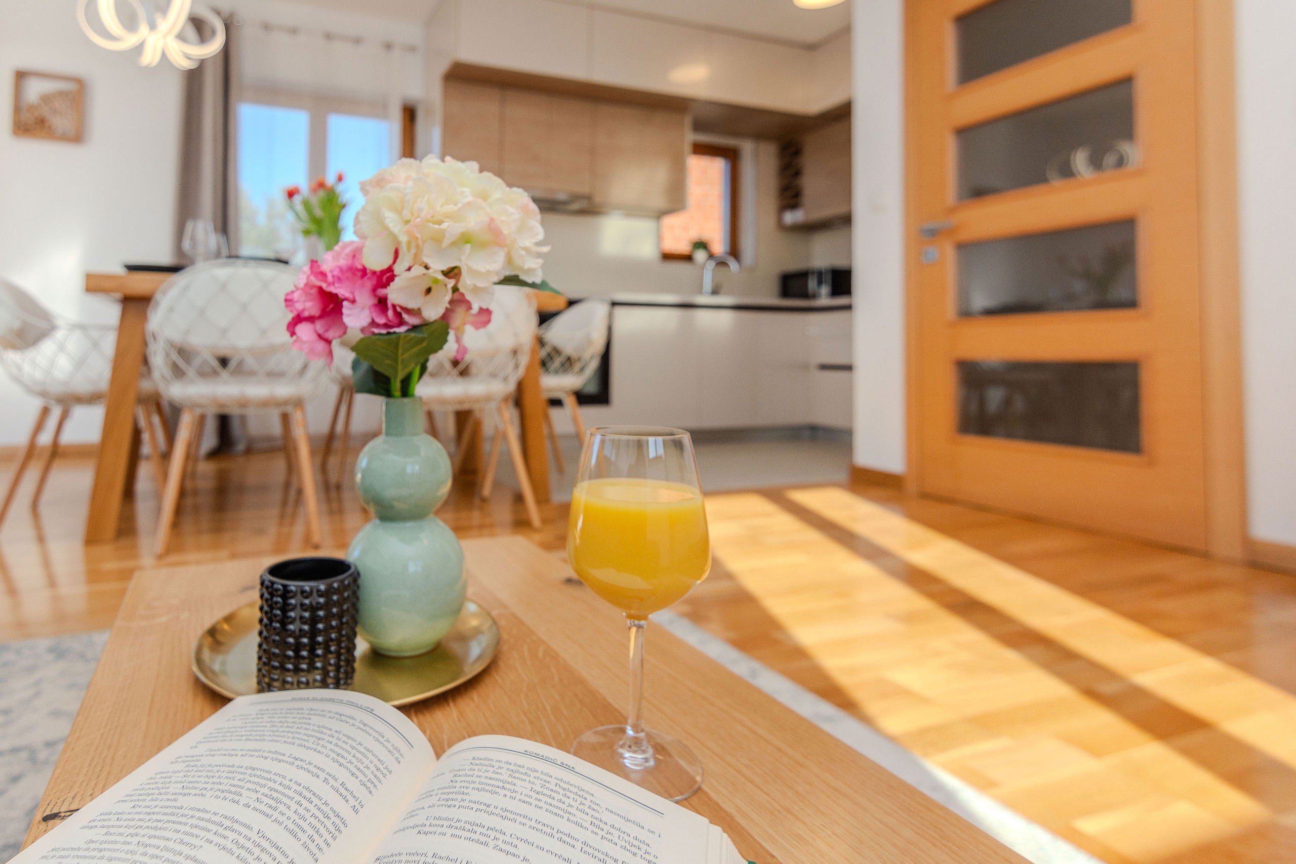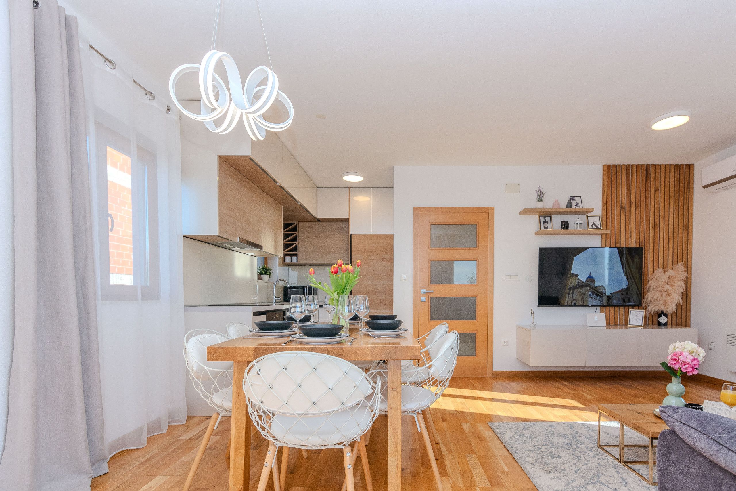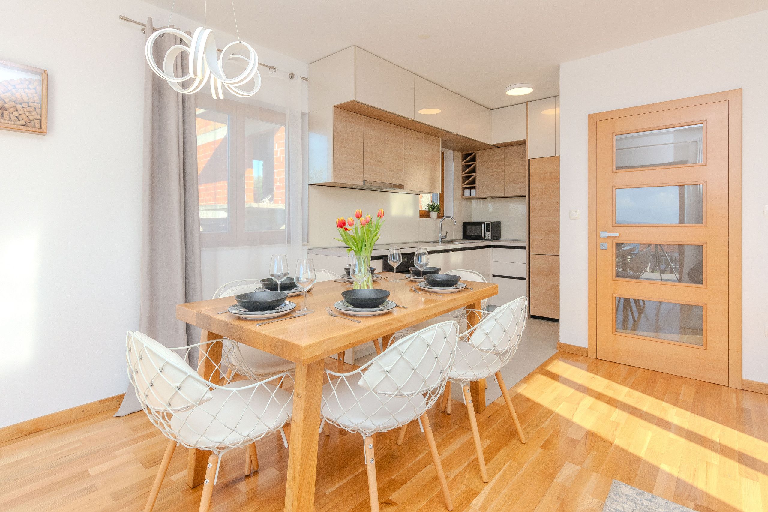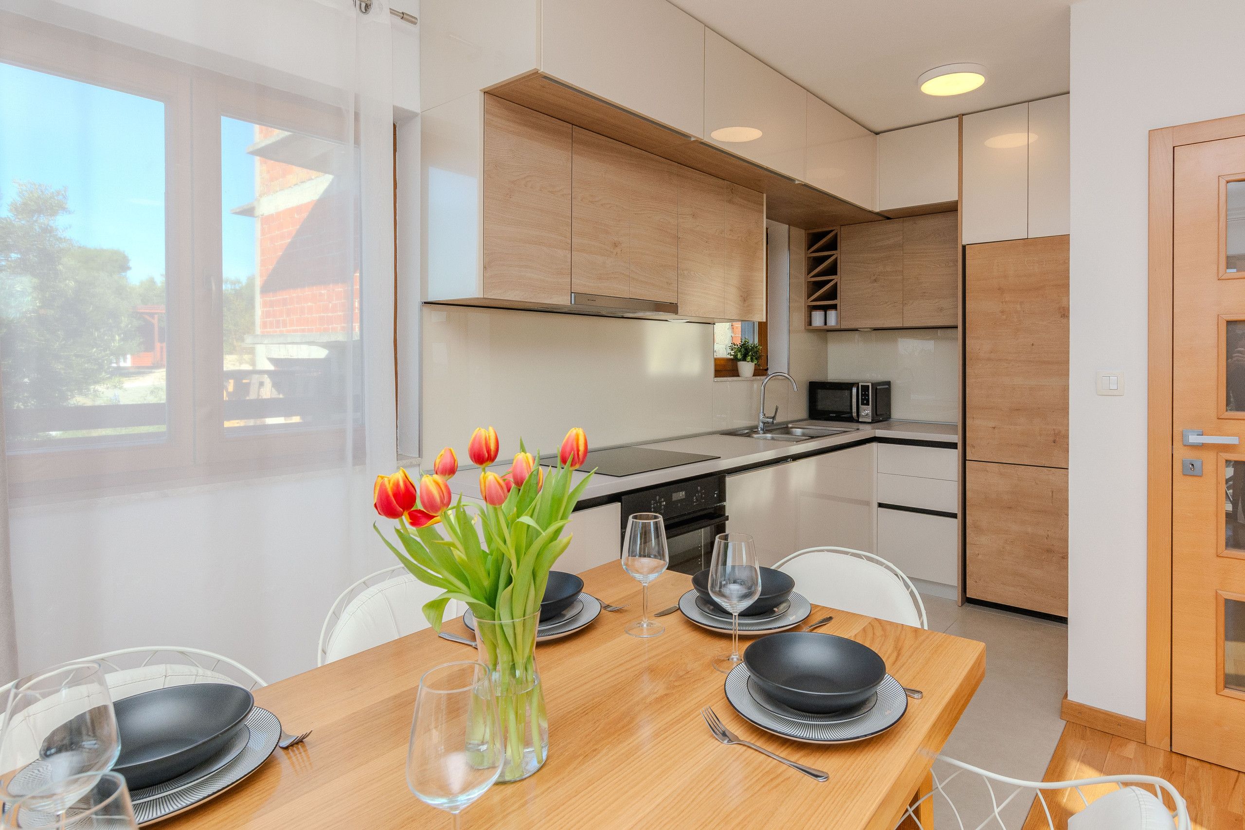 The heart of the home is its fully-equipped American-style kitchen, complete with modern amenities like an induction cook top, dishwasher, coffee machine, and all necessary kitchenware. The open living area includes a dining table and a comfortable sofa, creating an inviting space for meals and relaxation.