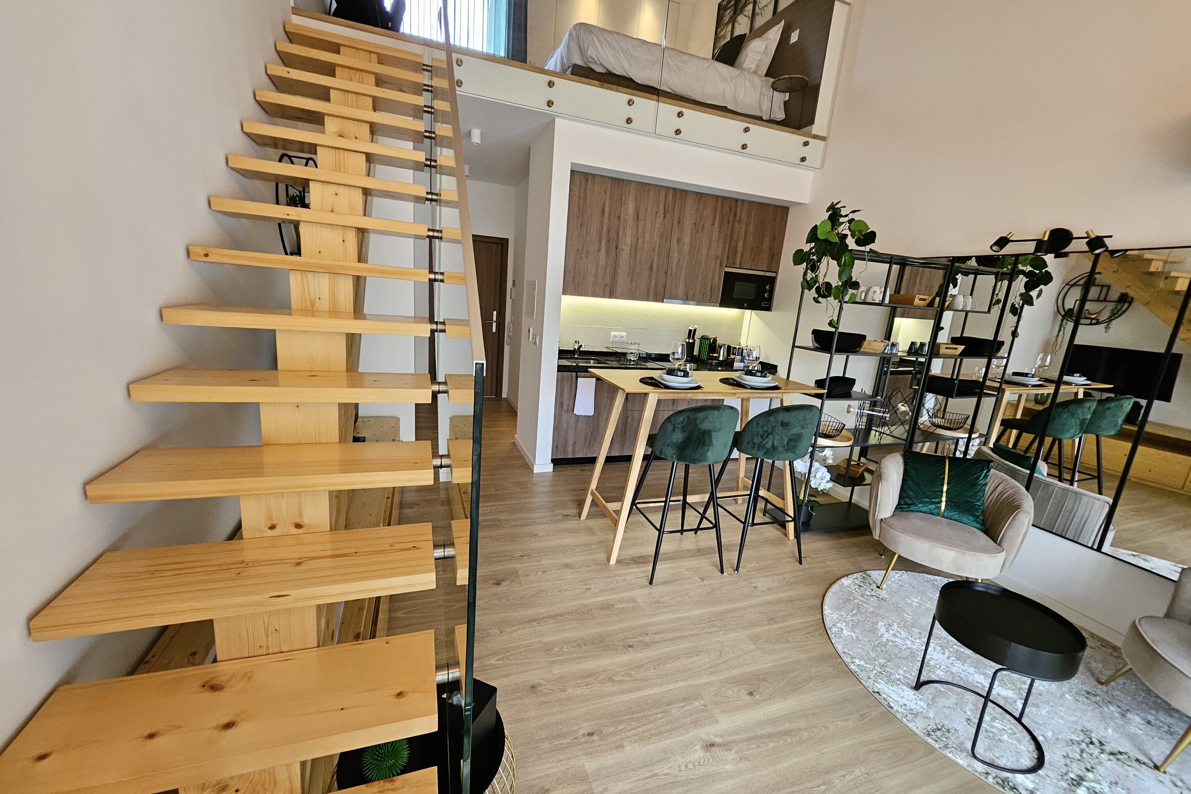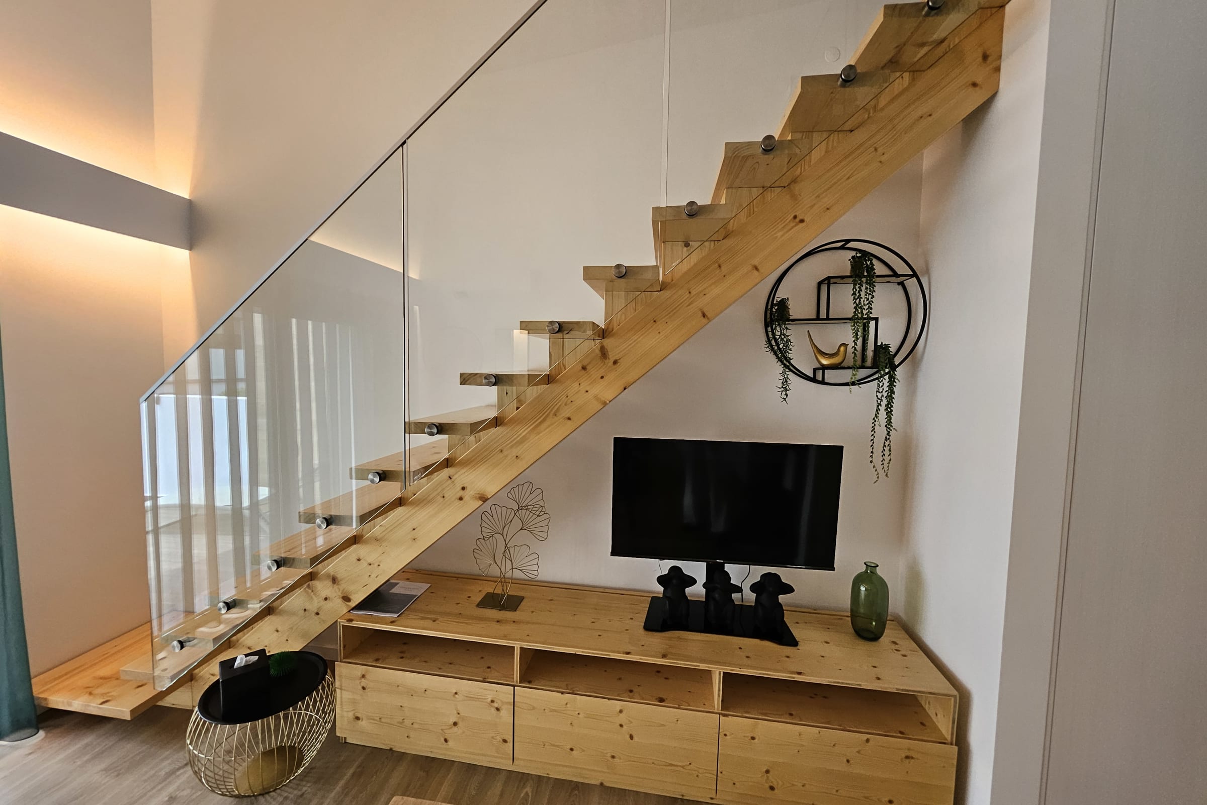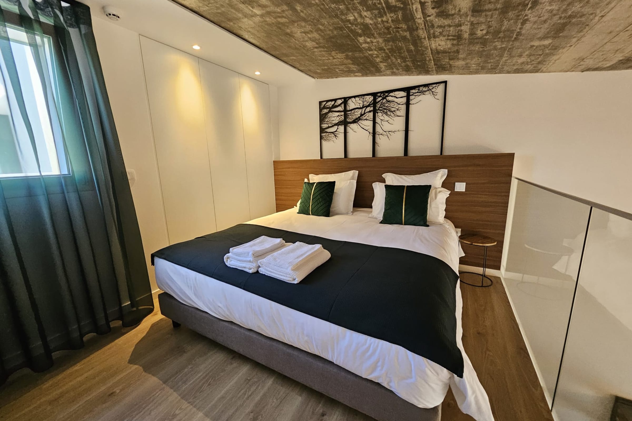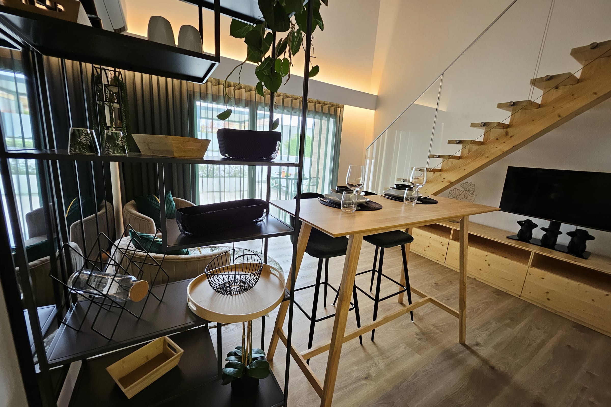 The apartment GREEN LOFT N°6 includes a terrace, an entrance hall with cupboard, a fully equipped kitchen (microwave, stove, hood, refrigerator-freezer, kettle, toaster, coffee maker and NESPRESSO machine), a living room with television , a dining area, upstairs a bedroom with desk, storage closets, a bathroom with shower, and toilet.