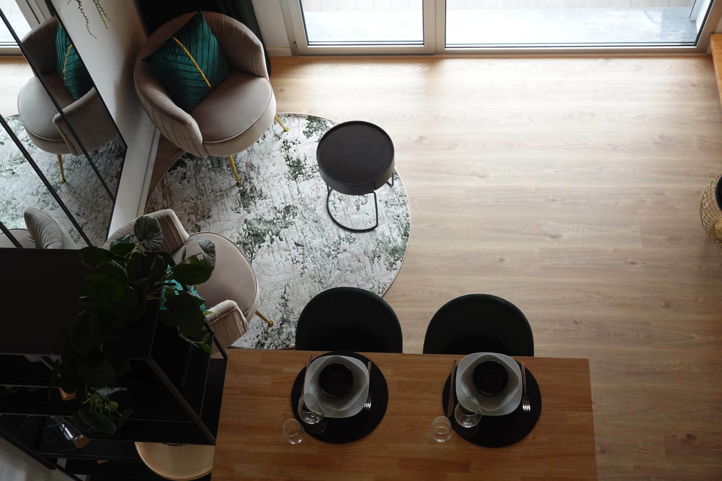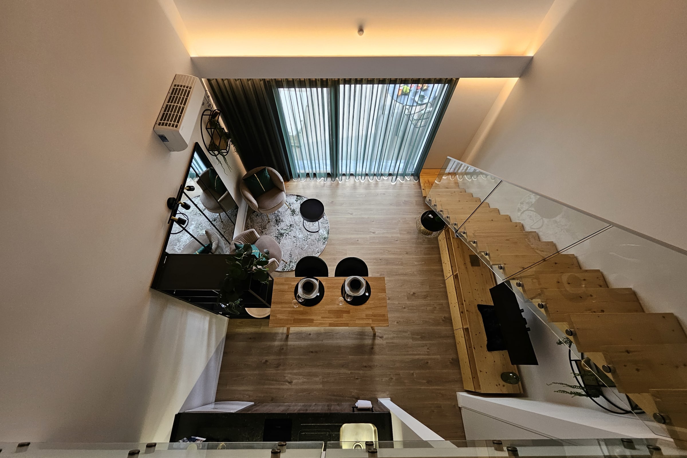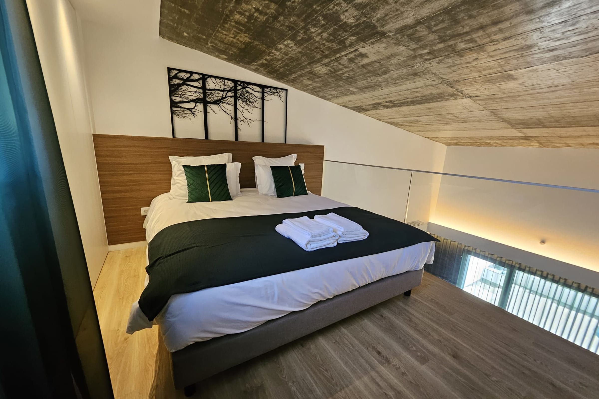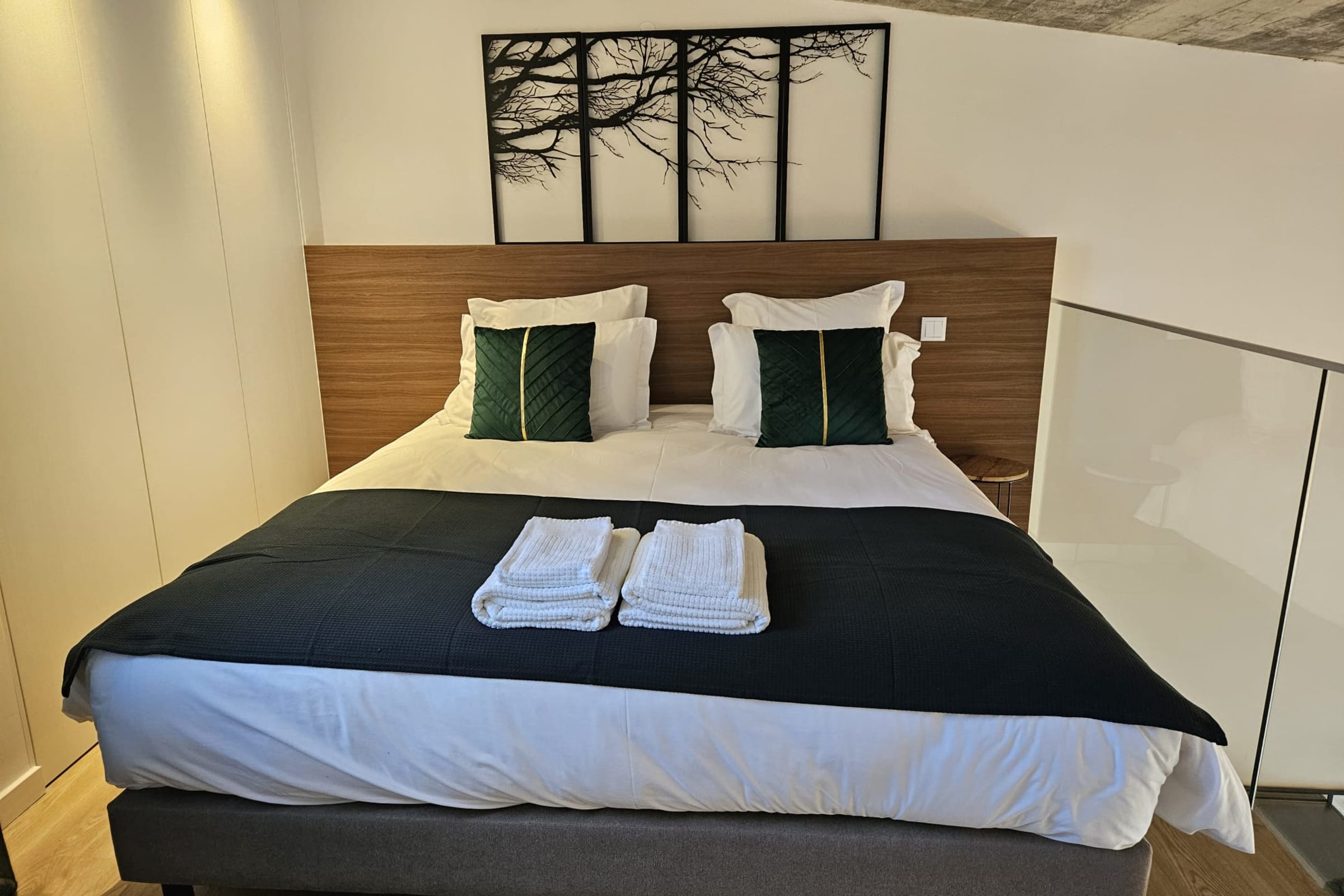 The apartment GREEN LOFT N°6 includes a terrace, an entrance hall with cupboard, a fully equipped kitchen (microwave, stove, hood, refrigerator-freezer, kettle, toaster, coffee maker and NESPRESSO machine), a living room with television , a dining area, upstairs a bedroom with desk, storage closets, a bathroom with shower, and toilet.