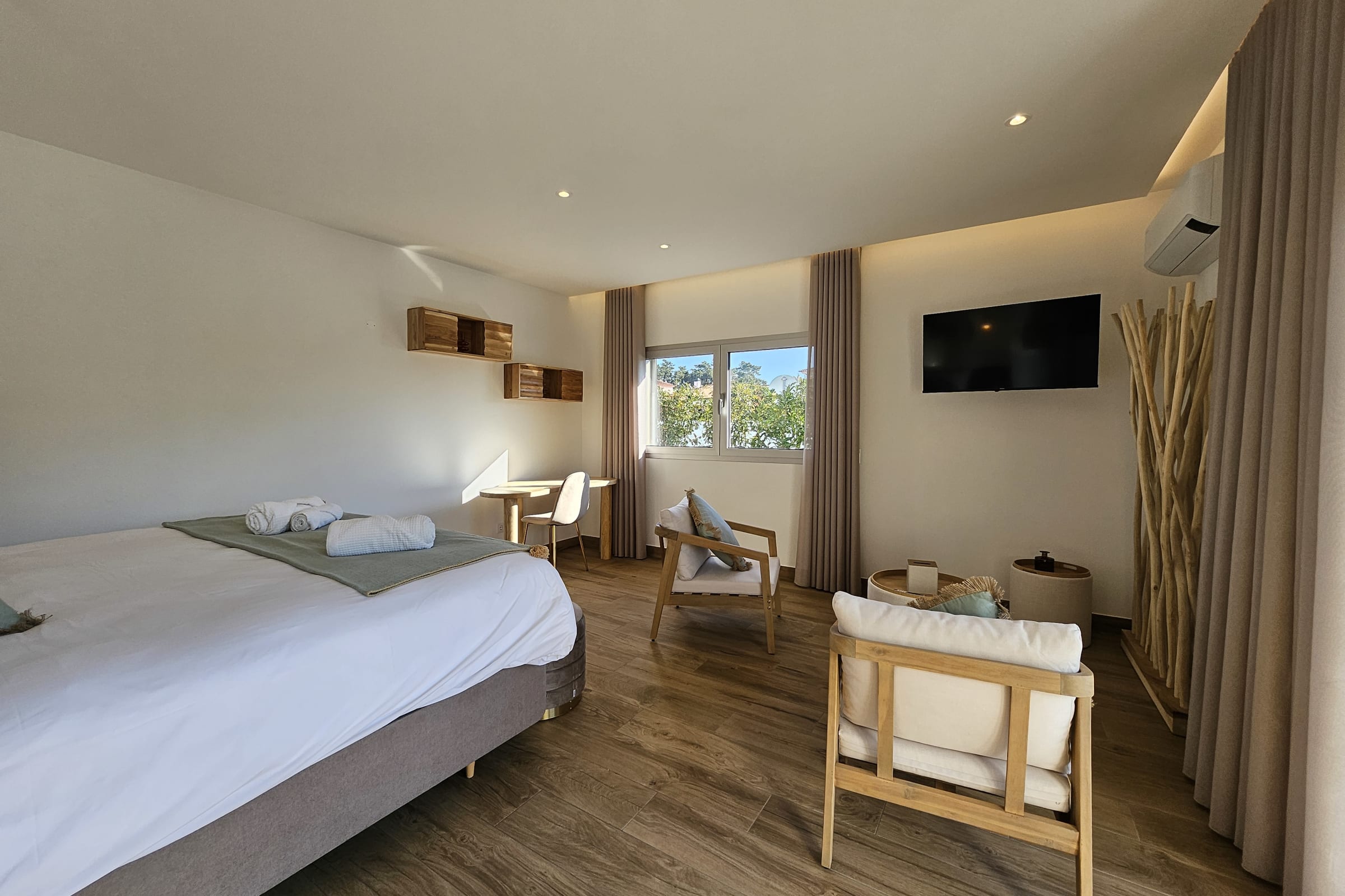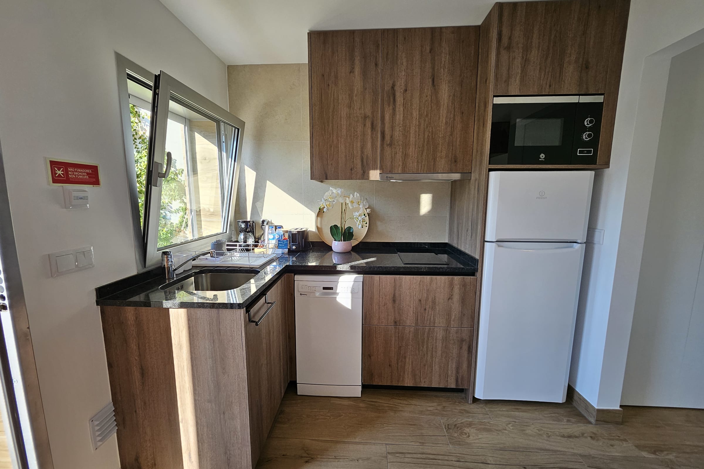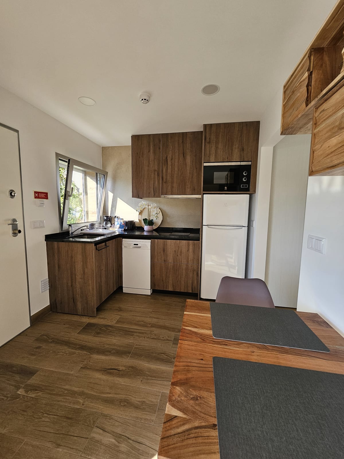 The apartment offers modern comfort with a private terrace, a fully equipped kitchen (microwave, stovetop, extractor fan, fridge-freezer, kettle, dishwasher, toaster, coffee maker), a living room with TV, a dining area, a sleeping space with TV and storage, a bathroom with shower, toilet, and washing machine, as well as a dedicated workspace. The king-size bed (180 cm) offers exceptional luxury comfort.