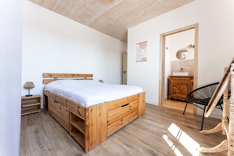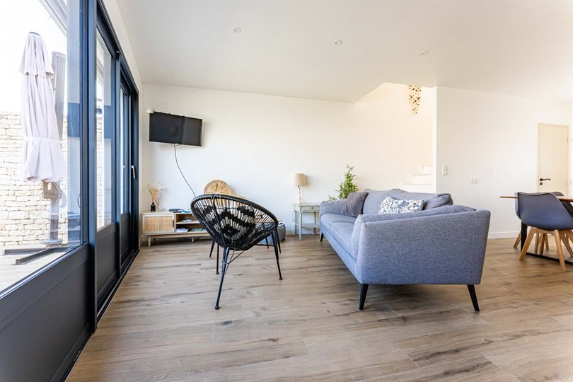 Villa consists of a bright living room opening onto a fully equipped kitchen and offers direct access to the garden and the swimming pool.