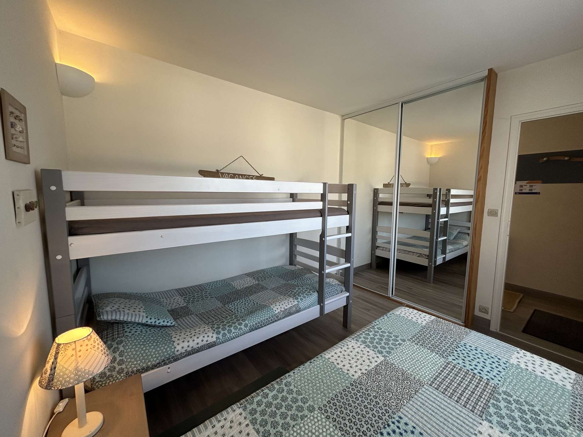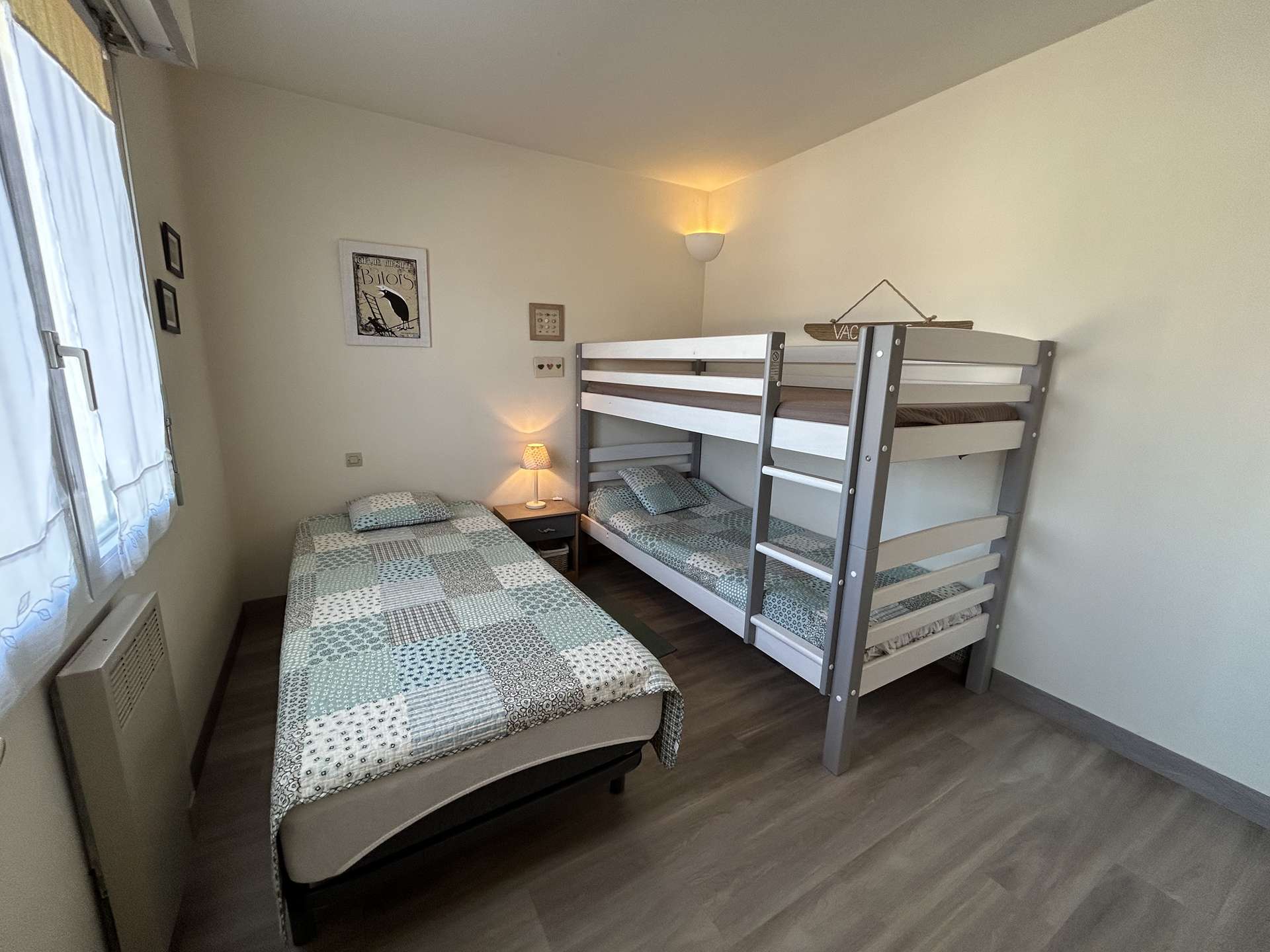 This vacation rental consists of a living room with a two-seater convertible sofa, a fitted and equipped kitchen (microwave, oven, refrigerator, dishwasher), a bedroom with three single beds (80) including two bunk beds, a bedroom with two single beds or 160 cm bed, a bathroom, a toilet.