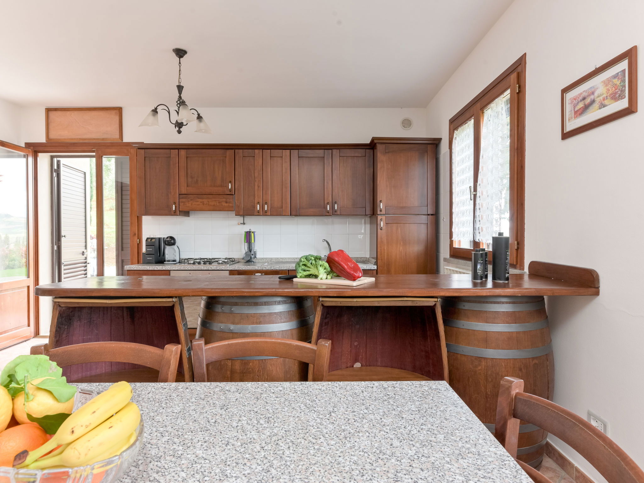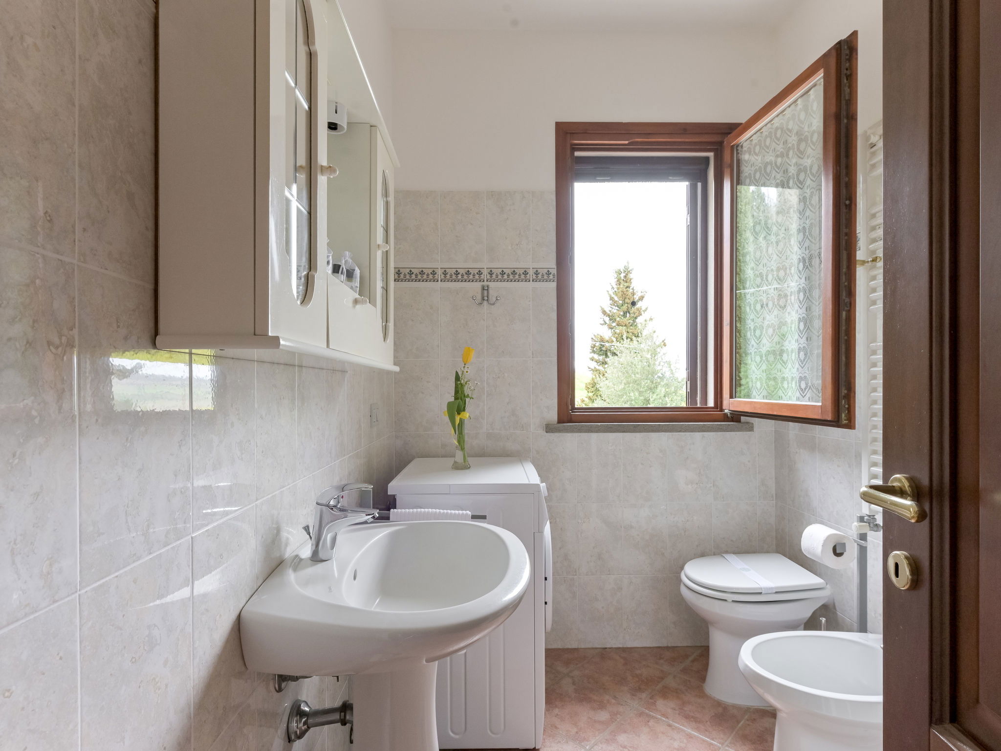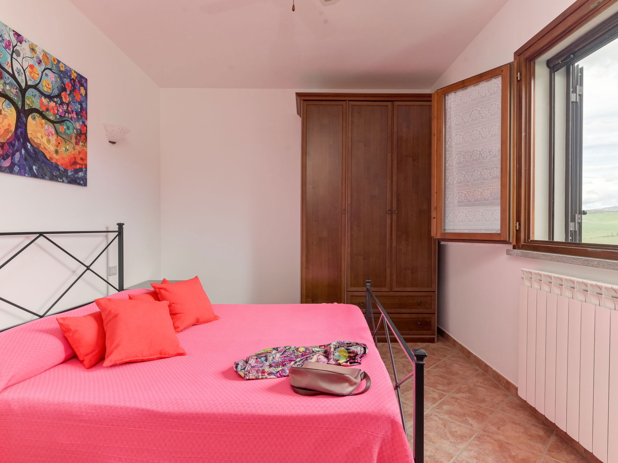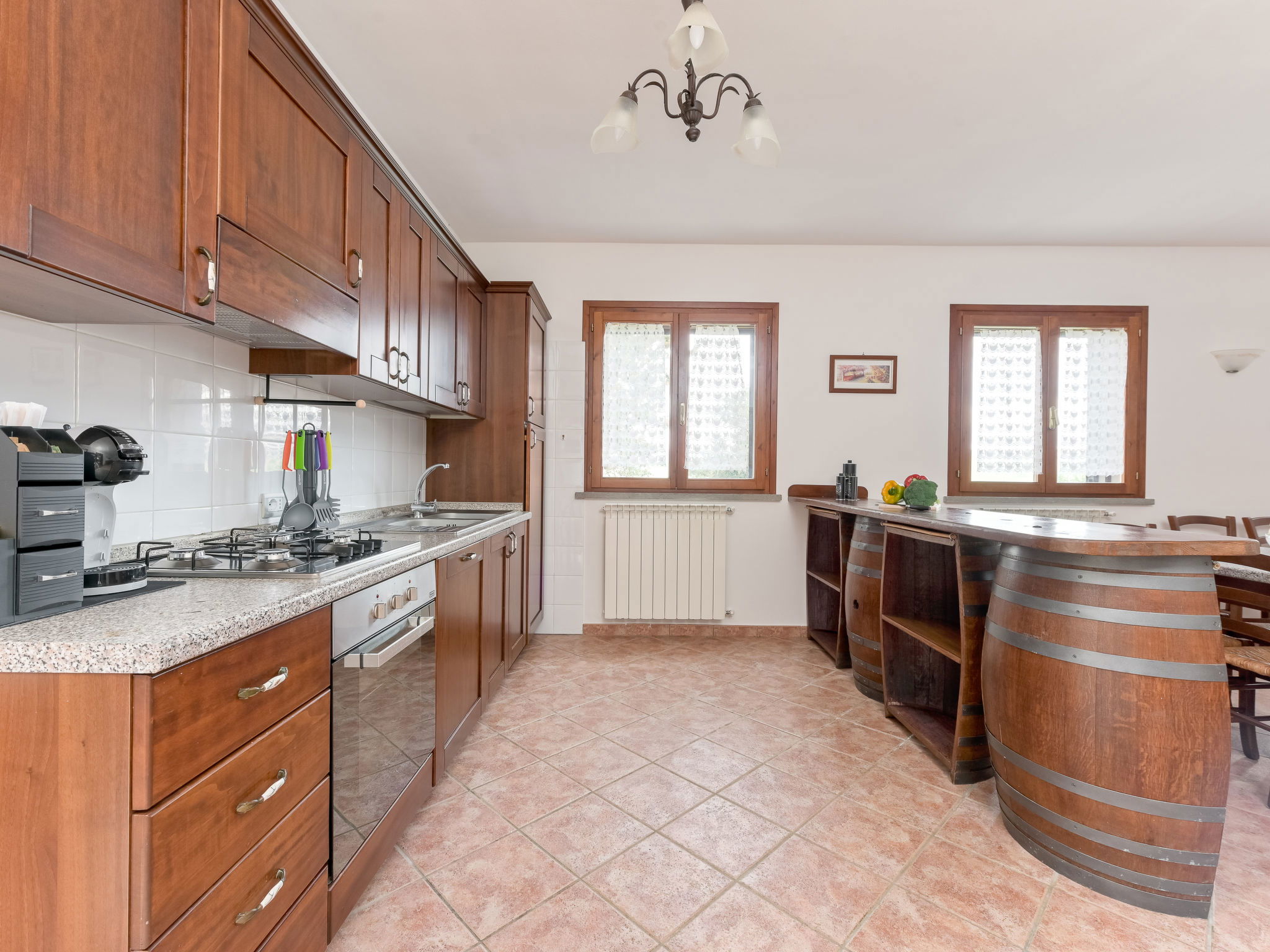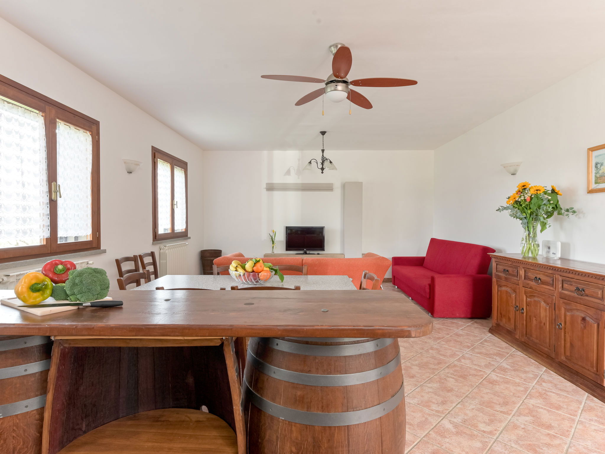 6-room house 160 m2 on 2 levels. Spacious, practical furnishings: large living/dining room with dining table and TV. Exit to the garden. 1 large double bedroom. 1 room with 2 beds. Open kitchen (oven, dishwasher, 4 gas rings, kettle, electric coffee machine). Exit to the garden. Shower/bidet/WC. Upper floor: 3 double bedrooms. 2 showers/bidet/WC. Gas heating. Heating available only from 15.10. to 15.04. Large balcony, large patio, garden, lawn, porch. Terrace furniture, balcony furniture, barbecue, deck chairs. Beautiful panoramic view of the countryside. Facilities: washing machine, mosquito net, baby cot for up to 2 year olds, hair dryer. Internet (WiFi, free). Please note: maximum 2 pets/ dogs allowed. Private entrance, smoke alarm, fire extinguisher. No internal connecting door between the floors. IT053004B5564DLFYO