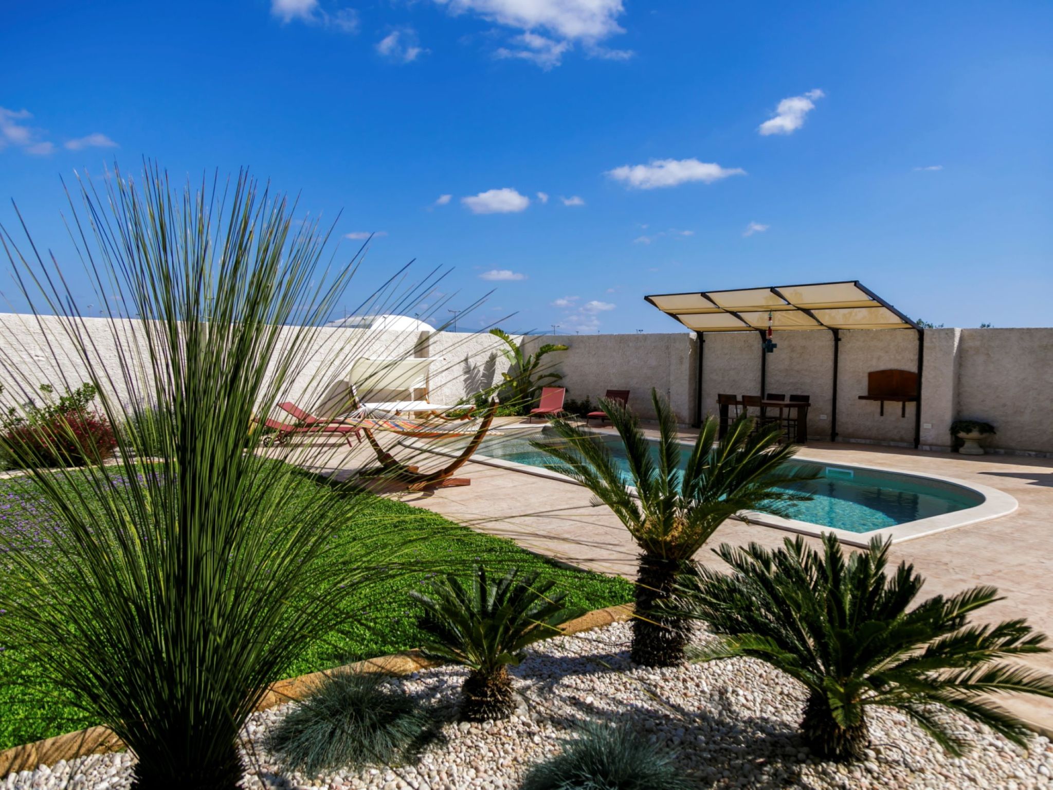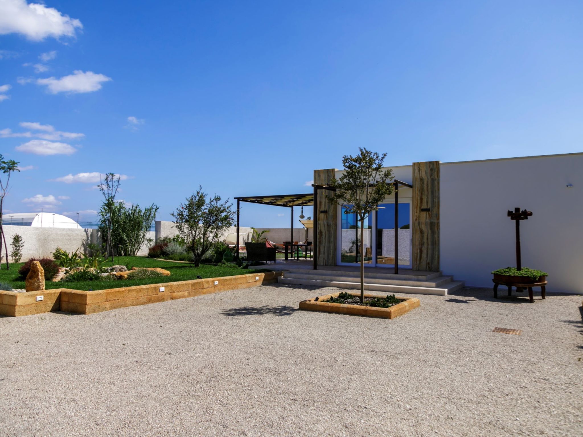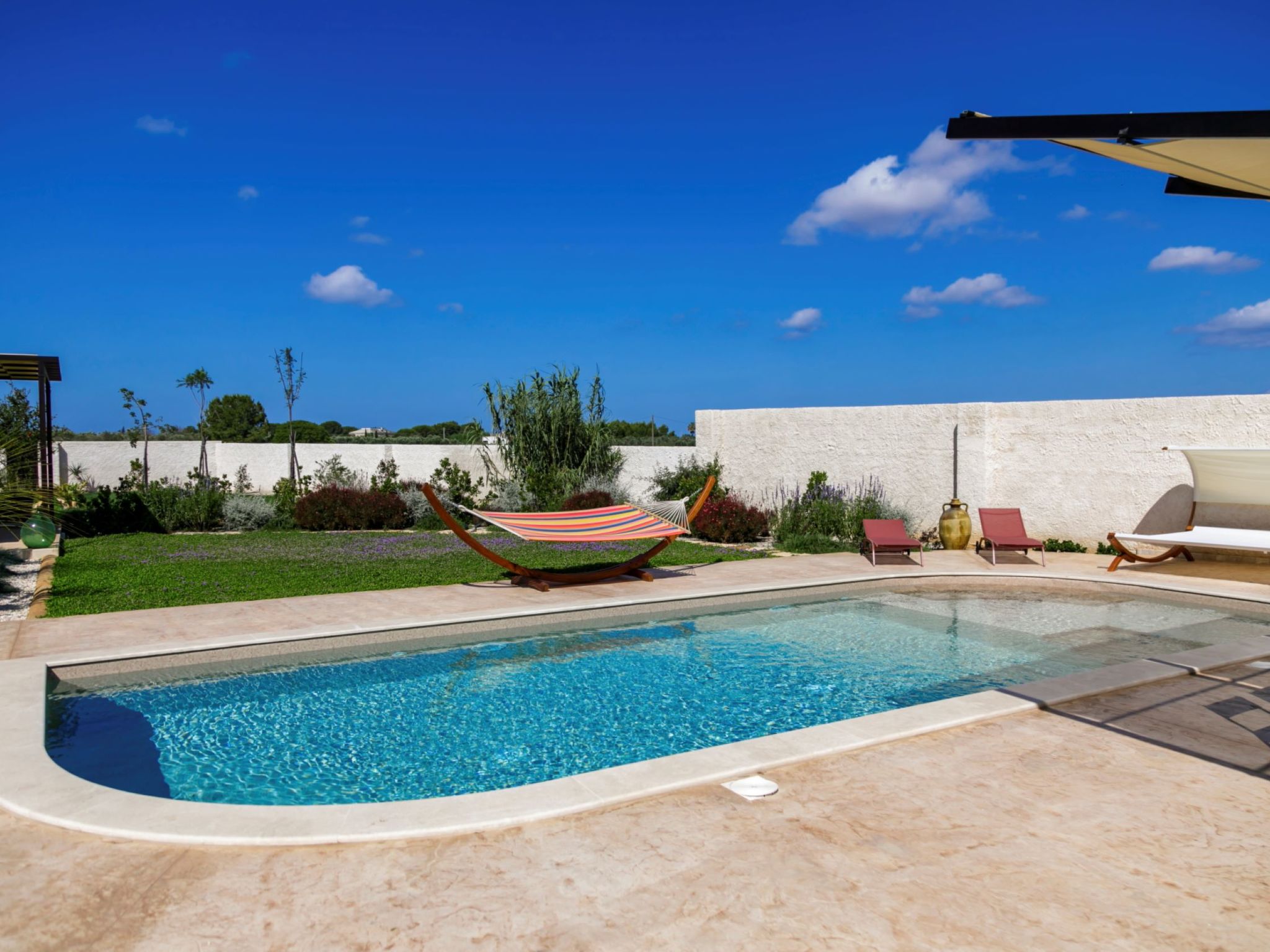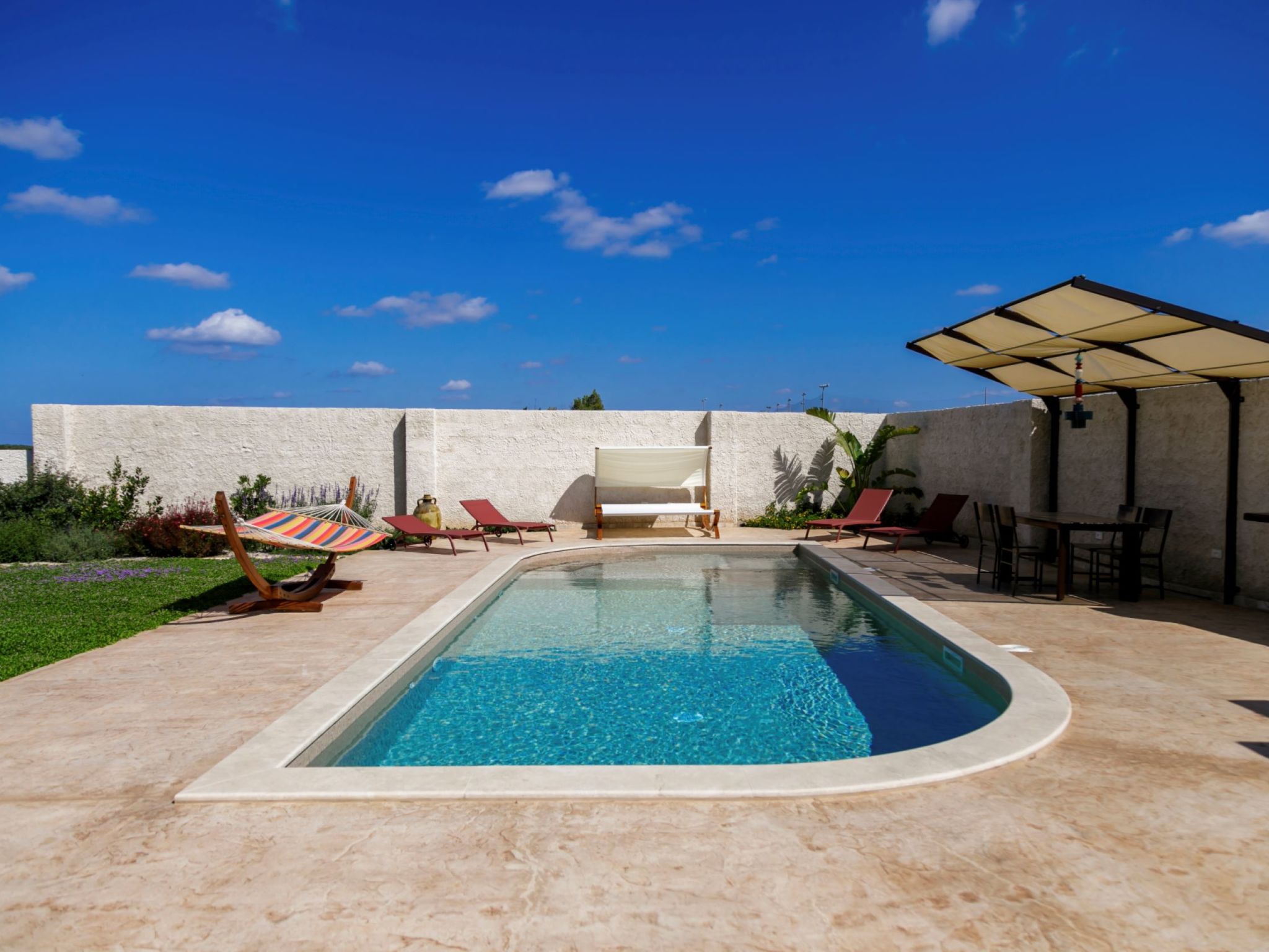 Modern, luxurious villa "Incoronata New Dependance", built in 2024, surrounded by trees and fields. 1 km from the centre of Nardò-Città del Barocco Leccese, 15 km from the centre of Gallipoli, 24 km from the centre of Lecce, in a quiet, sunny position, 3 km from the sea, 3 km from the beach, in the countryside. Private: property (fenced), large, beautiful, well-kept garden 1'200 m2 (fenced) with flowers and trees, lawn for sunbathing, swimming pool with privacy (4 x 10 m, depth 50 - 140 cm, seasonal availability: 01.Apr. - 30.Oct.). WC in the pool area, outdoor shower, pergola, garden furniture, barbecue, pool maintenance by the owner/gardener. In the house: burglar alarm system. Linen change (suppl. charge extra). Towel change (suppl. charge extra). Parking at the house. Grocery, supermarket 700 m, restaurant 3 km, bar 3 km, bakery 3 km, bus stop 700 m, railway station "Nardò" 3 km, sandy beach "Santa Caterina" 3 km, rocky beach "Porto Selvaggio" 3 km. Tennis, sports centre 350 m. Nearby attractions: Melpignano - Città della Taranta 40 km, Otranto 60 km, Santa Maria di Leuca-Punta Sud Puglia 60 km, Alberobello 143 km, Polignano a Mare 149 km, Matera 162 km. Hiking paths: Parco Naturale Porto Selvaggio 25 km, Parco Naturale Terra delle Gravine 119 km, Grotte carsiche di Castellana 155 km. Please note: car recommended. Property ref. IT6770.810.1 is situated on the same property.