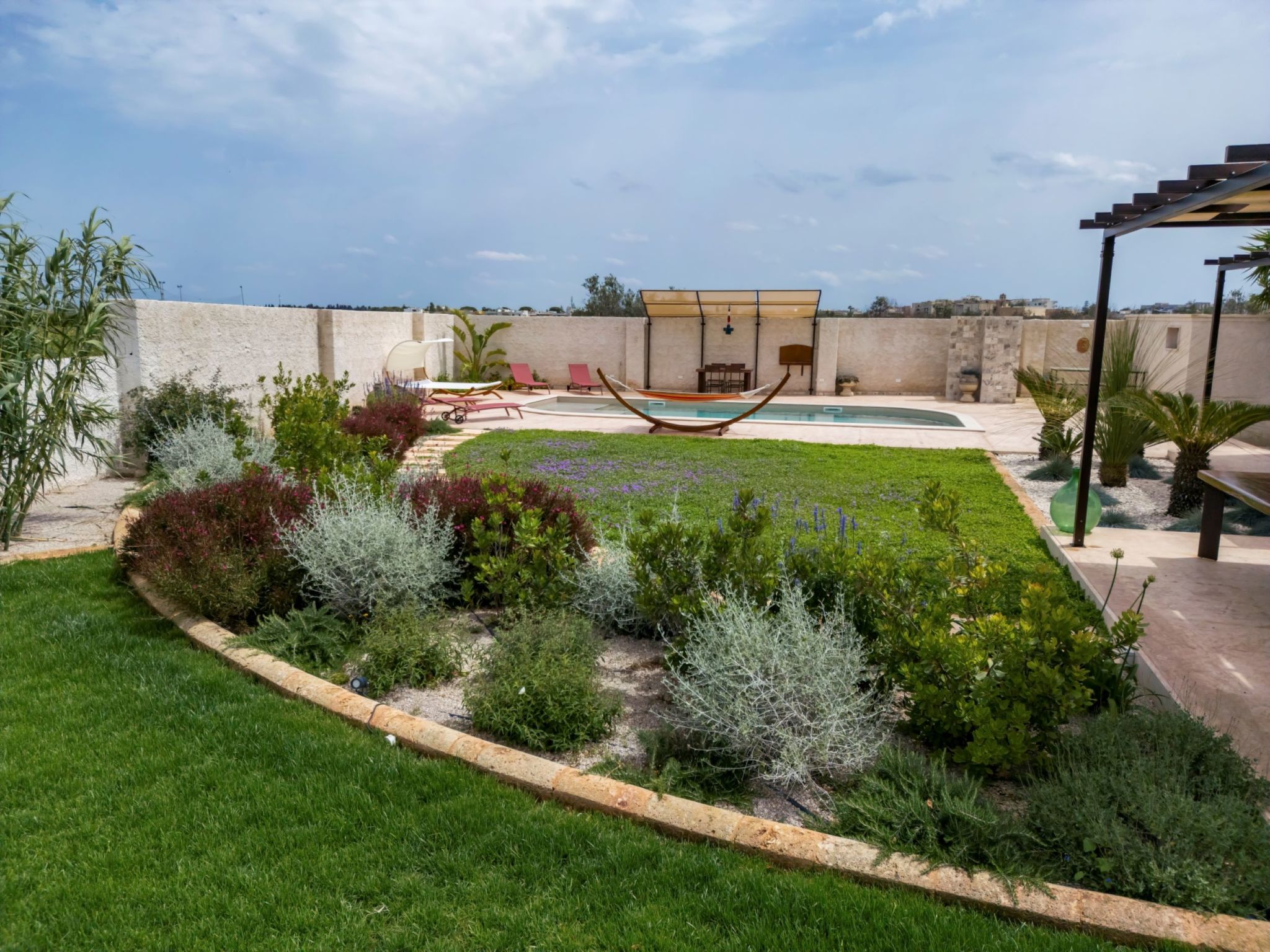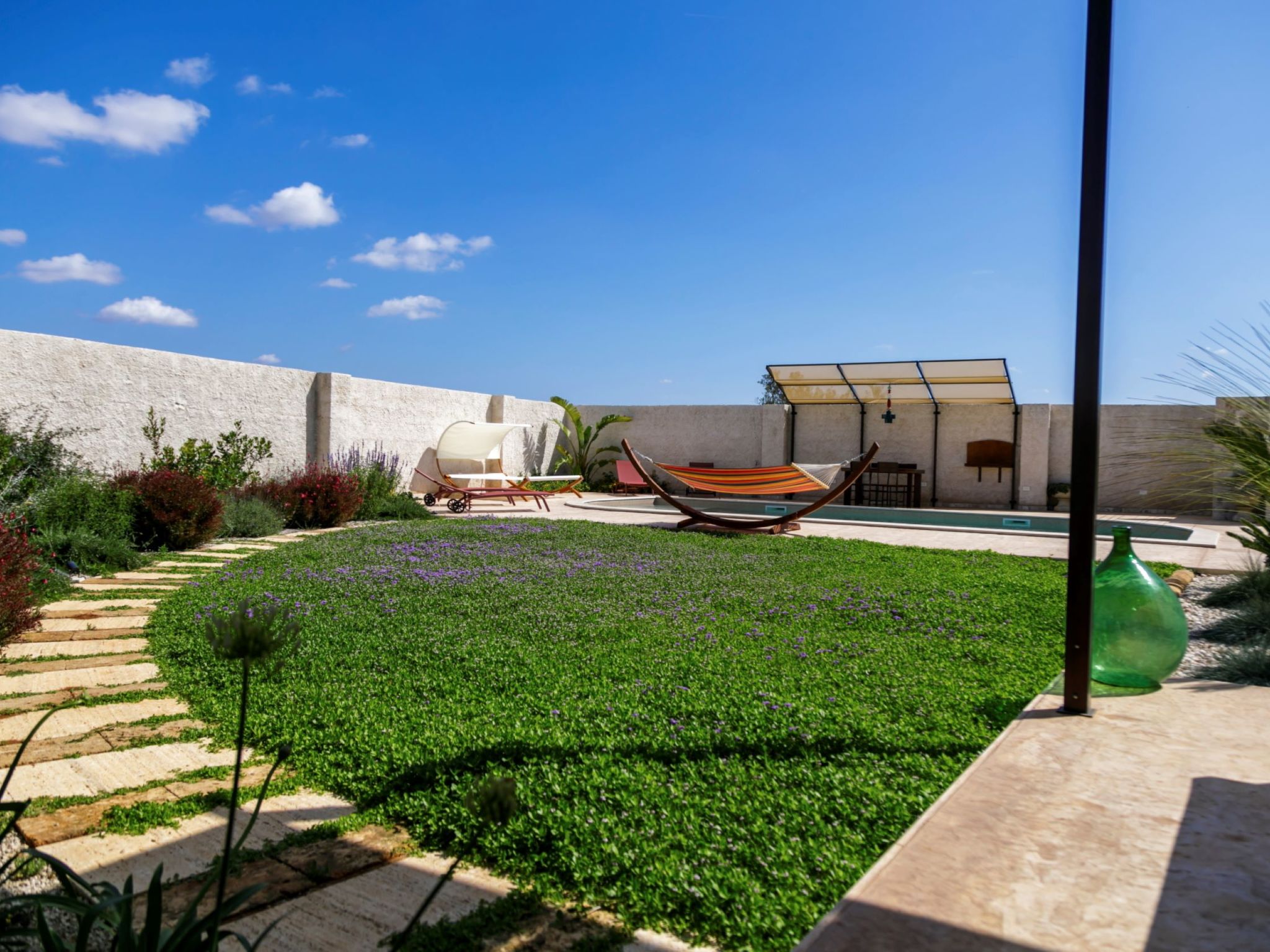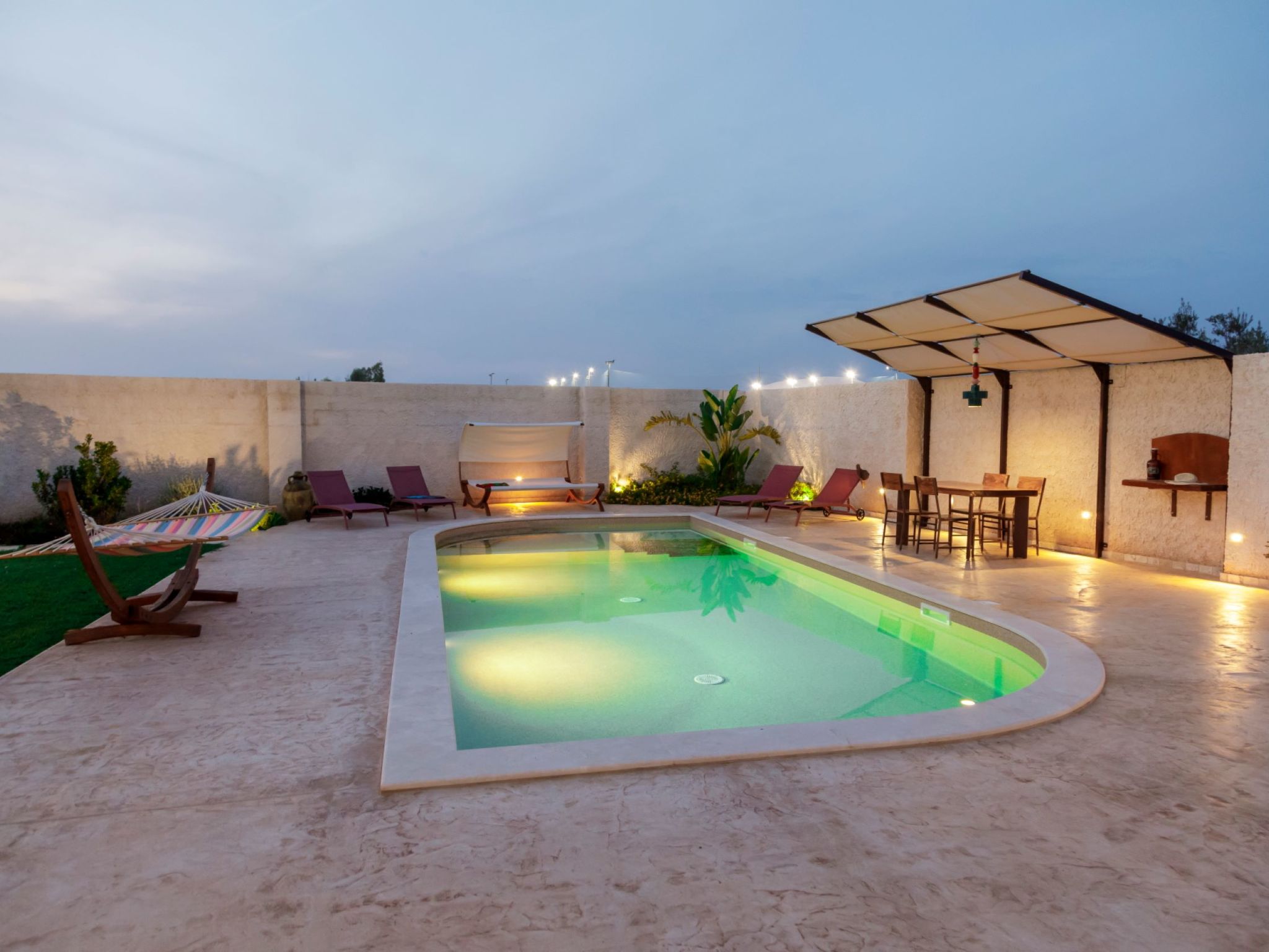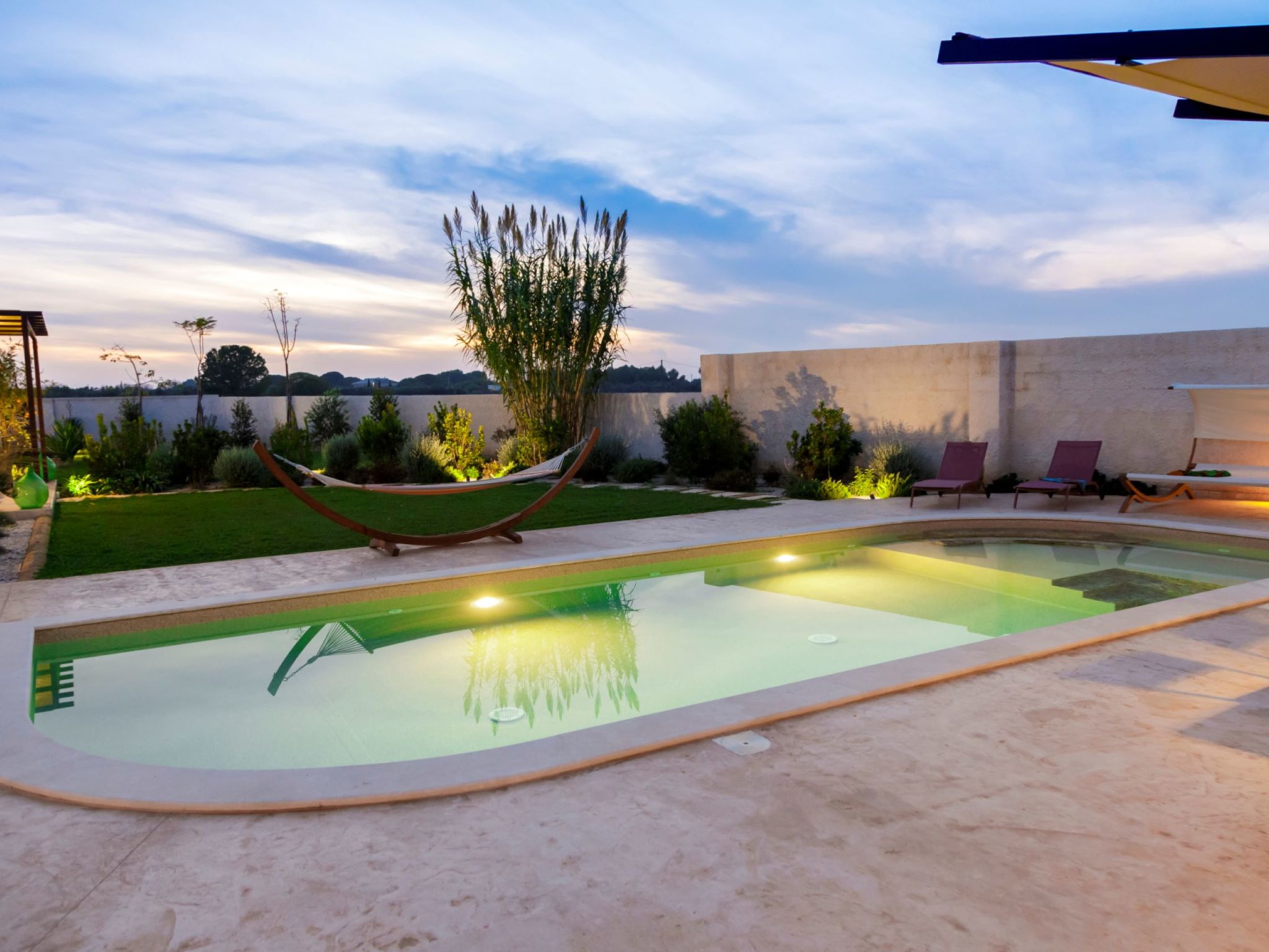 Modern, luxurious villa "Incoronata New Dependance", built in 2024, surrounded by trees and fields. 1 km from the centre of Nardò-Città del Barocco Leccese, 15 km from the centre of Gallipoli, 24 km from the centre of Lecce, in a quiet, sunny position, 3 km from the sea, 3 km from the beach, in the countryside. Private: property (fenced), large, beautiful, well-kept garden 1'200 m2 (fenced) with flowers and trees, lawn for sunbathing, swimming pool with privacy (4 x 10 m, depth 50 - 140 cm, seasonal availability: 01.Apr. - 30.Oct.). WC in the pool area, outdoor shower, pergola, garden furniture, barbecue, pool maintenance by the owner/gardener. In the house: burglar alarm system. Linen change (suppl. charge extra). Towel change (suppl. charge extra). Parking at the house. Grocery, supermarket 700 m, restaurant 3 km, bar 3 km, bakery 3 km, bus stop 700 m, railway station "Nardò" 3 km, sandy beach "Santa Caterina" 3 km, rocky beach "Porto Selvaggio" 3 km. Tennis, sports centre 350 m. Nearby attractions: Melpignano - Città della Taranta 40 km, Otranto 60 km, Santa Maria di Leuca-Punta Sud Puglia 60 km, Alberobello 143 km, Polignano a Mare 149 km, Matera 162 km. Hiking paths: Parco Naturale Porto Selvaggio 25 km, Parco Naturale Terra delle Gravine 119 km, Grotte carsiche di Castellana 155 km. Please note: car recommended. Property ref. IT6770.810.1 is situated on the same property.