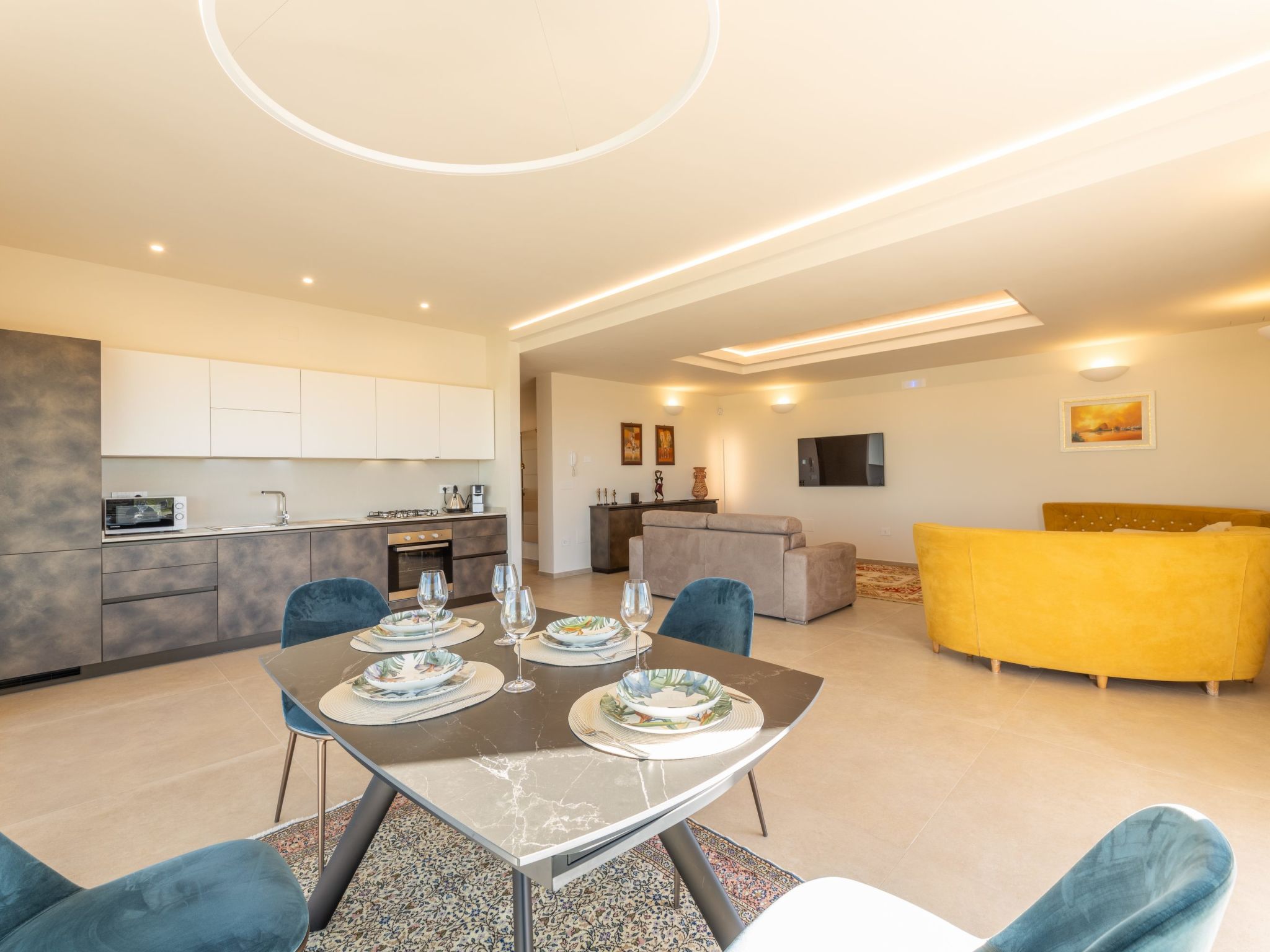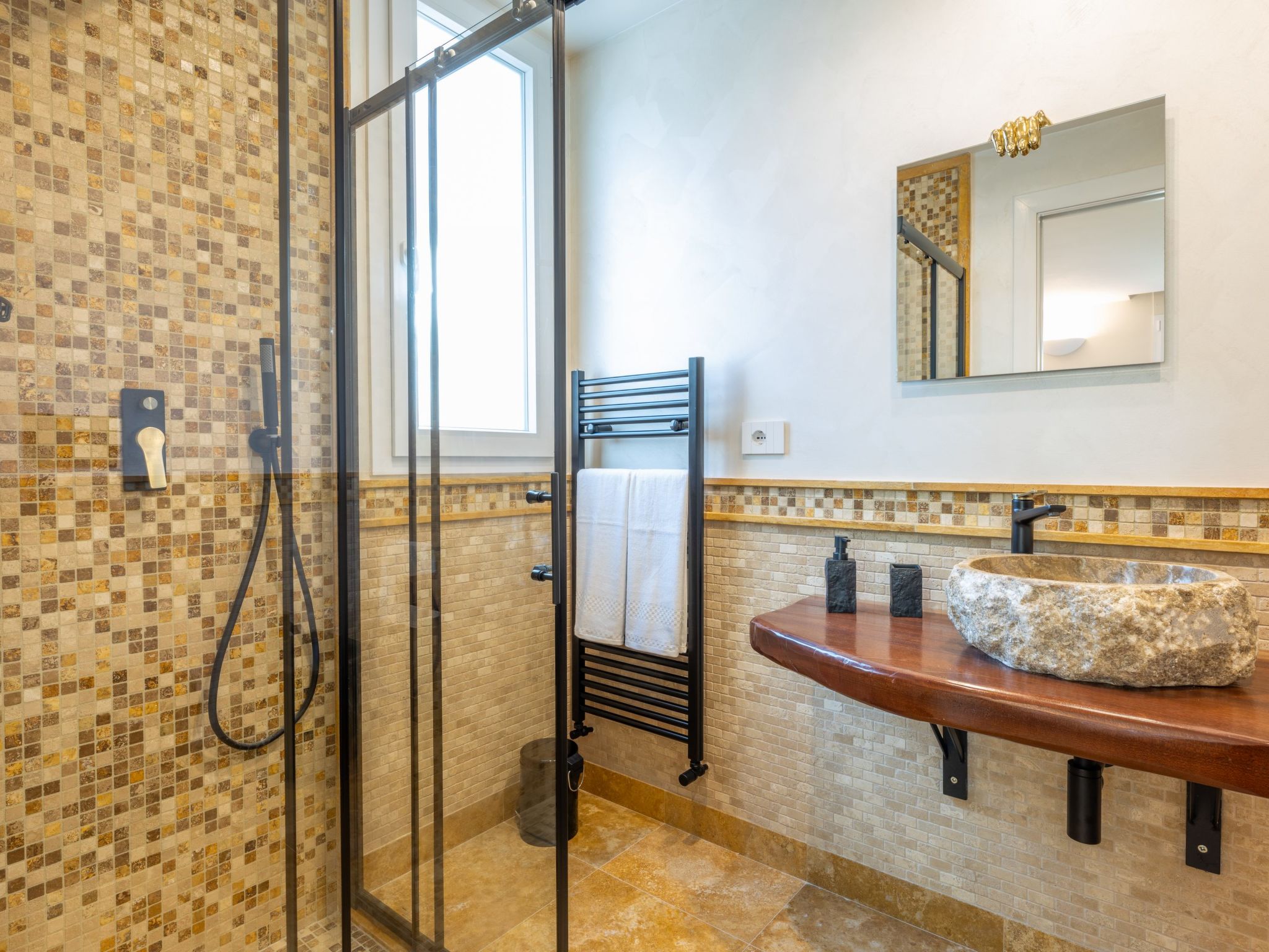 3-room villa 120 m2. Bright, modern and luxurious furnishings: living/dining room with panoramic window with 1 double sofabed (140 cm), TV, air conditioning and forced-air heating. Exit to the garden, to the swimming pool. 2 double bedrooms, each room with shower/bidet/WC, air conditioning and forced-air heating. Exit to the garden, to the swimming pool. Kitchenette (oven, dishwasher, Gas stove, 4 gas rings, toaster, kettle, microwave, electric coffee machine). Heating, air-conditioning, forced-air heating. Heating available only from 01.11. to 31.03. 3 terraces 13 m2 partly covered, patio 9 m2, roofed. Terrace furniture, barbecue, deck chairs (6). View of the swimming pool and the garden. Facilities: washing machine, iron, children's high chair, baby cot for up to 2 year olds, hair dryer. Internet (WiFi, free). Parking (4 cars). Please note: maximum 1 small pet/ dog allowed. Smoke alarm, fire extinguisher. IT075052C200114673