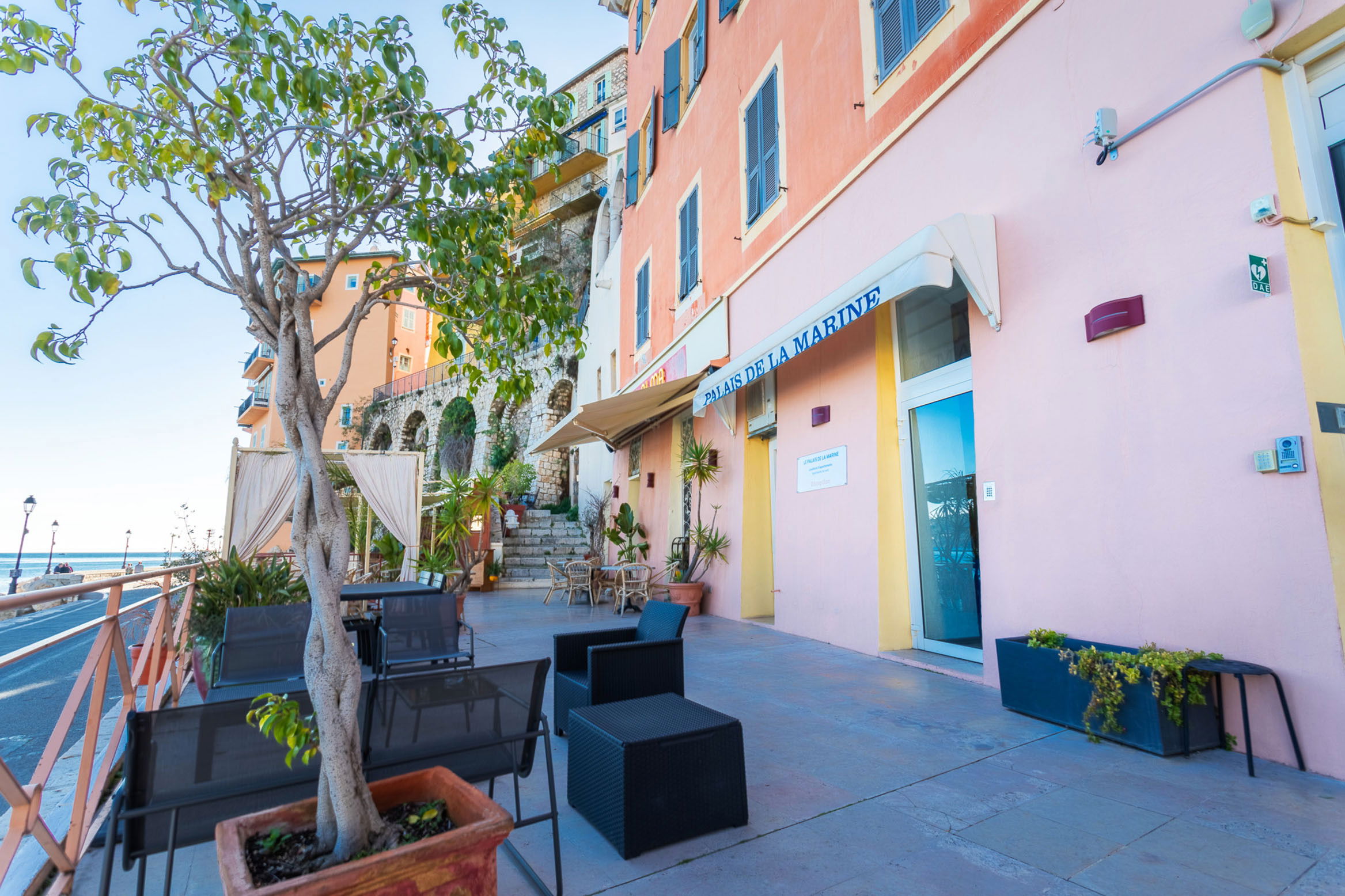 The large shared terrace of the residence, located on the seafront, offering dining tables and an outdoor lounge. It can be used to share a drink and snacks for an aperitif or pastries for breakfast, but it is not possible to have a full meal there.
