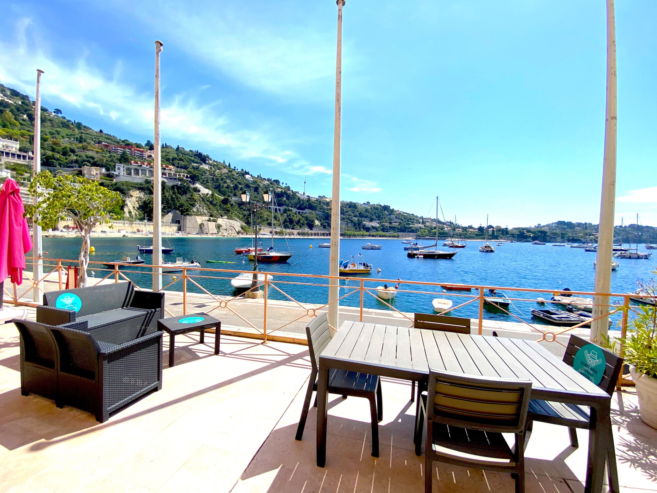 The functional kitchen, open to the living room, with refrigerator, cooking plates, microwave, extractor hood, kettle, toaster, coffee maker, and all necessary utensils for cooking and dining — all offering a superb view of the sea and Cap Ferrat.