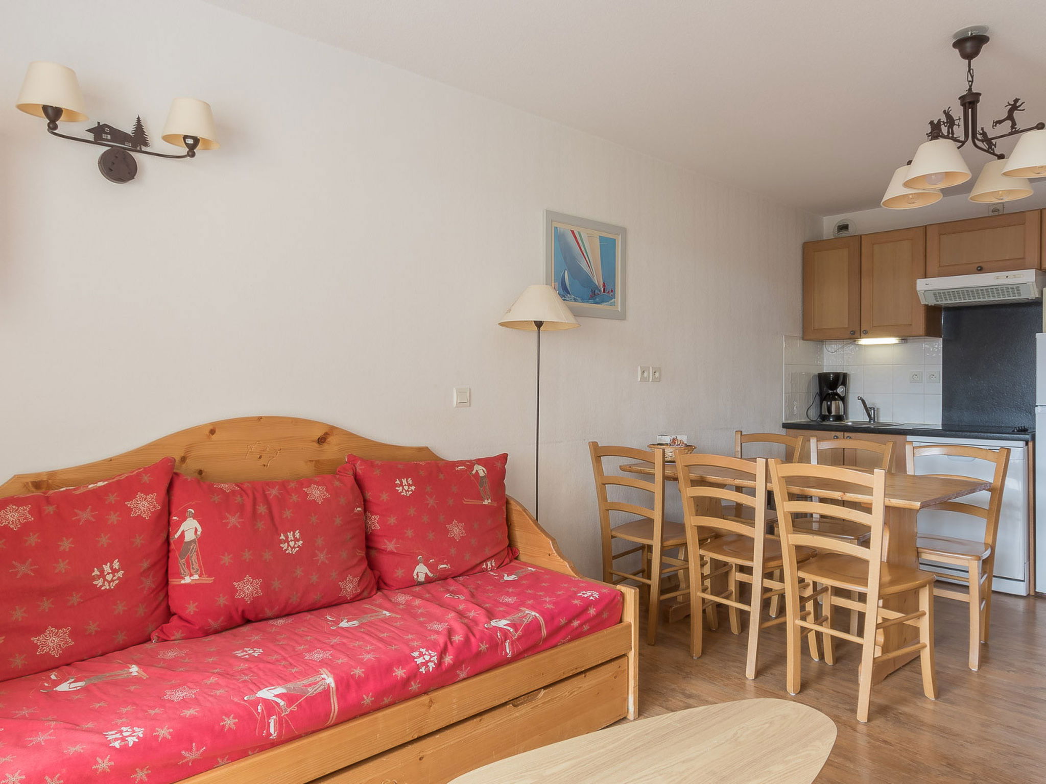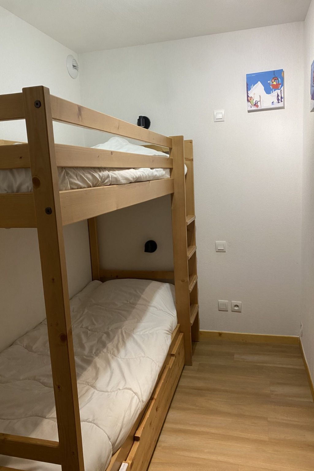 "T. Bergerie", 2-room apartment 36 m2. Object suitable for 6 adults. 1 room with 1 double bed and TV. Living room with 1 sofabed and 1 x 2 bunk beds, 1 pull-out bed. Kitchen (dishwasher, 4 ceramic glass hob hotplates, toaster, kettle, microwave, freezer, electric coffee machine). Bath/WC, sep. WC. Balcony. View of the mountains. Facilities: Internet (WiFi, free). Garage (1 car) at the house. Please note: non-smokers only. Smoke alarm. Offer by a commercial proprietor according to Art. 155, IV, CGI
