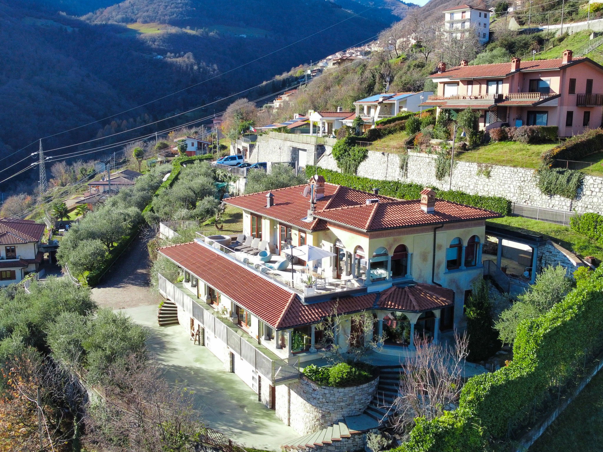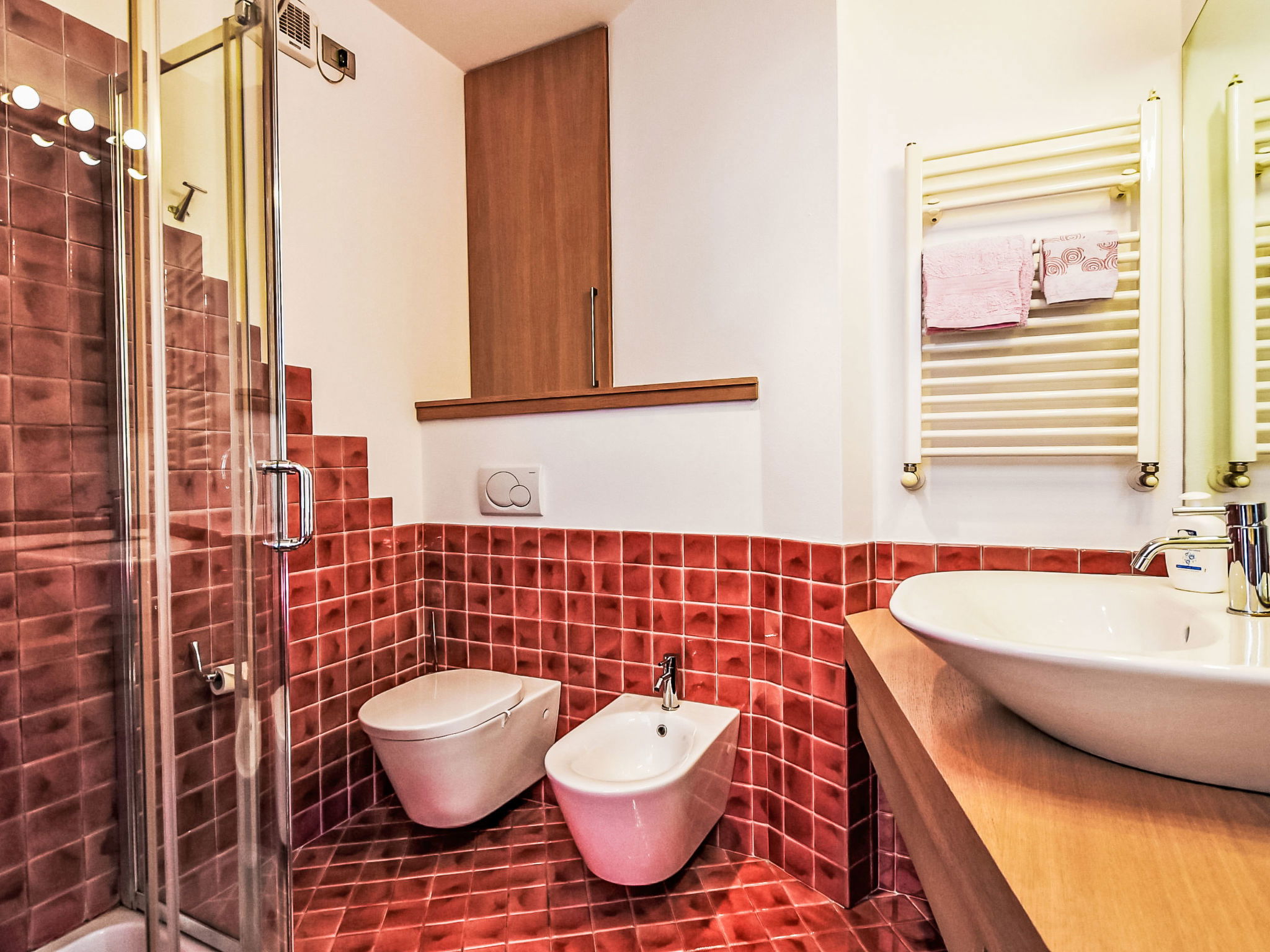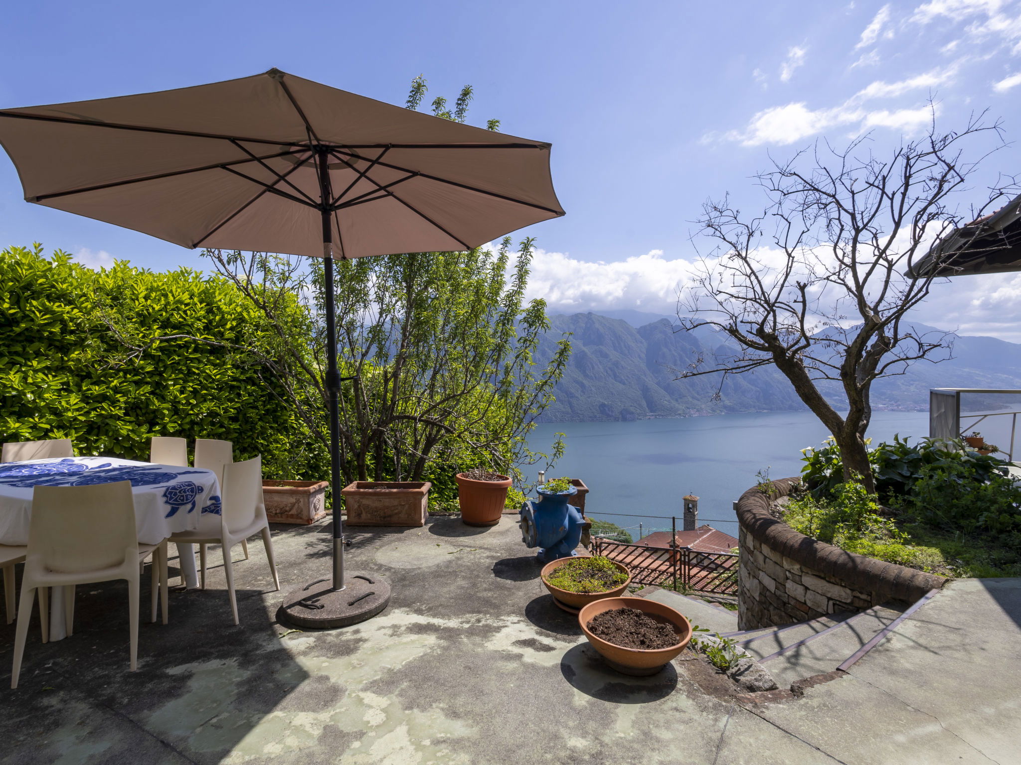 Beautiful, comfortable 2-family house "Xino Terrace View", 600 m a.s.l., 2 storeys, detached, surrounded by trees. In the hamlet Xino 2 km from the centre of Fonteno, 6 km from the centre of Riva di Solto, in a quiet, sunny position on a slope, residential area (villas), 6 km from the lake, east facing position. Private: terraced garden (fenced) with trees, lawn for sunbathing. In the house: storage room for bicycles. Parking (for 2 cars) at the house, public parking on the road. Supermarket 2 km, restaurant, bar 500 m, bus stop 1 km, ferry "Riva di Solto" 6 km, thermal baths "Boario Terme" 28 km. Nearby attractions: Lovere 11 km, Sarnico 25 km, Franciacorta (DOCG wine region) 30 km, Iseo 35 km, Bergamo 41 km, Milano 90 km. Please note: car recommended.
