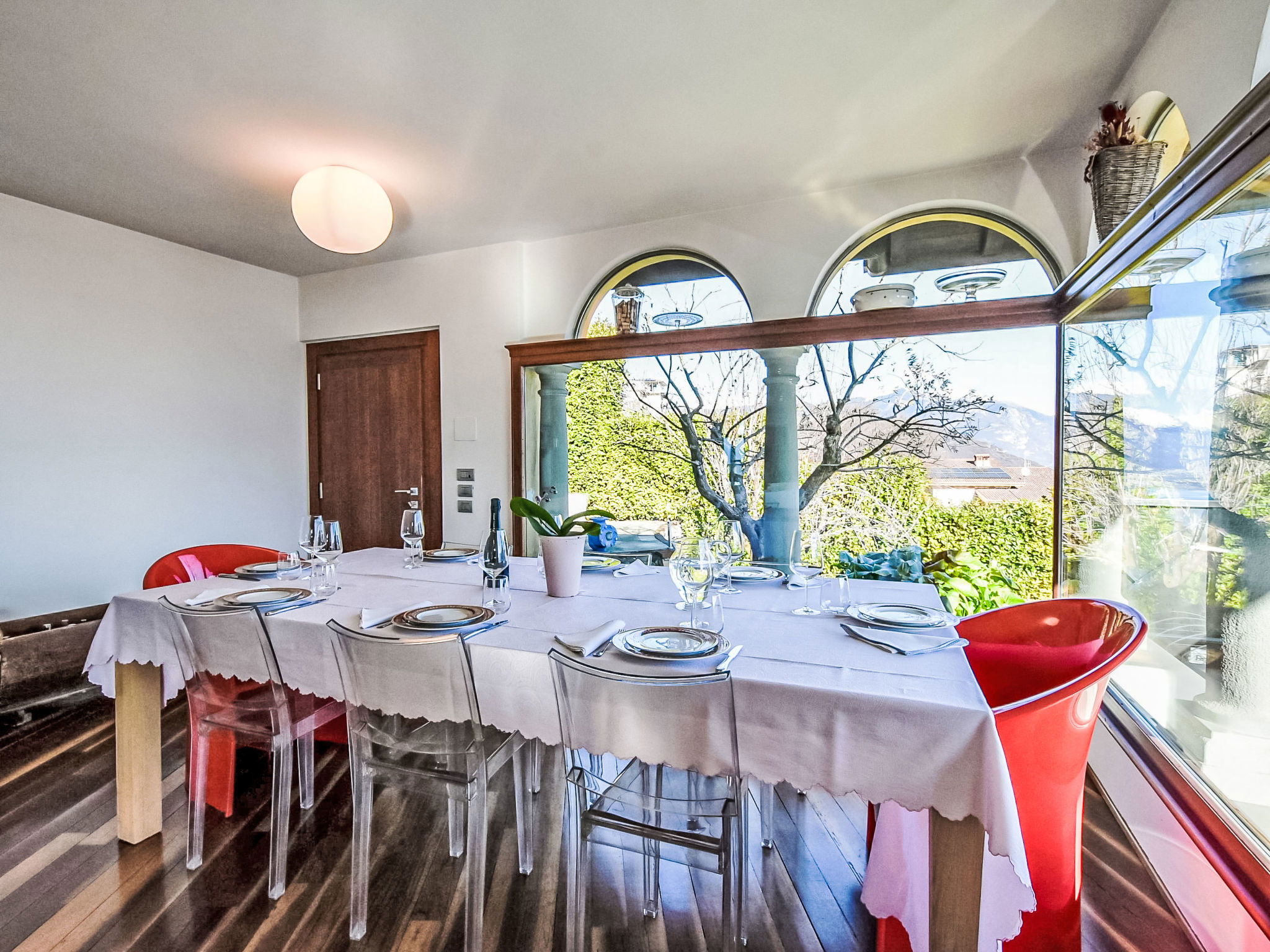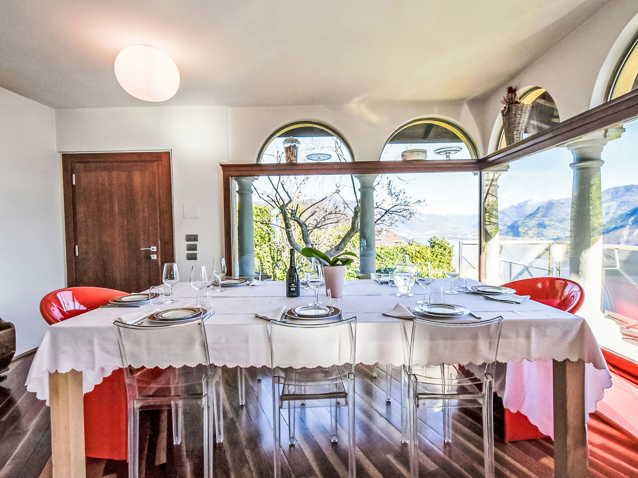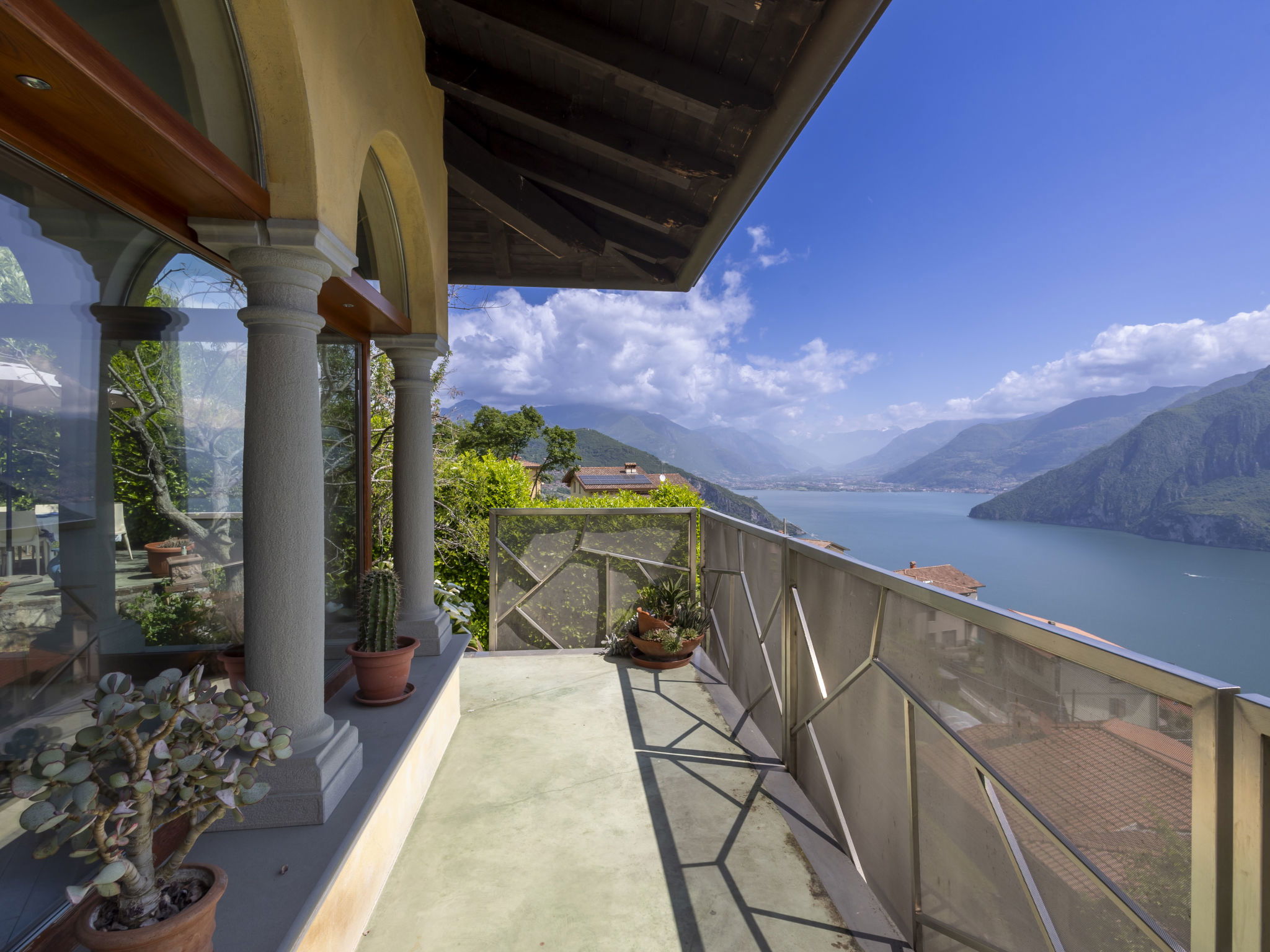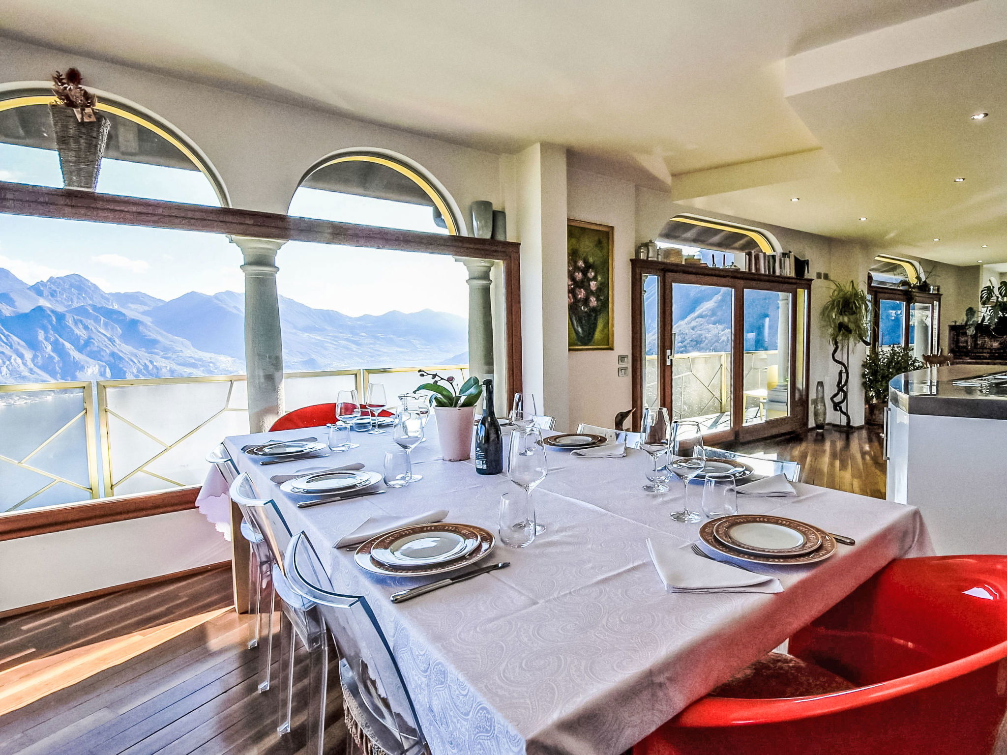 5-room apartment 280 m2 on 1st floor, south-east facing position. Spacious and bright, modern and stylish furnishings: large living/dining room with sliding door, panoramic window with Scandinavian wood stove (only for decoration), dining table and TV. Exit to the terrace. Living/sleeping room with panoramic window with 1 double sofabed (130 cm, length 180 cm). 1 room with 1 bed (80 cm, length 180 cm), 1 double bed (160 cm, length 180 cm), bath/bidet/WC. 1 room with 1 french bed (130 cm, length 190 cm), shower/bidet/WC. 1 large room with panoramic window with 1 french bed (120 cm, length 190 cm), shower/bidet/WC. Large kitchenette (oven, dishwasher, 6 gas rings, toaster, kettle, freezer, electric coffee machine, Capsules for coffee machine (Nespresso) free, cooking island, combination microwave) with double hand-basin. Bathroom. Parquet floors. Large terrace roofed, garden. Terrace furniture. Very beautiful panoramic view of the lake and the mountains. Facilities: washing machine, children's high chair, baby cot, hair dryer. Internet (WiFi, free). Please note: suitable for families. Non-smokers only. Maximum 1 pet/ dog allowed. Private entrance. IT016102C24LDAHOO9