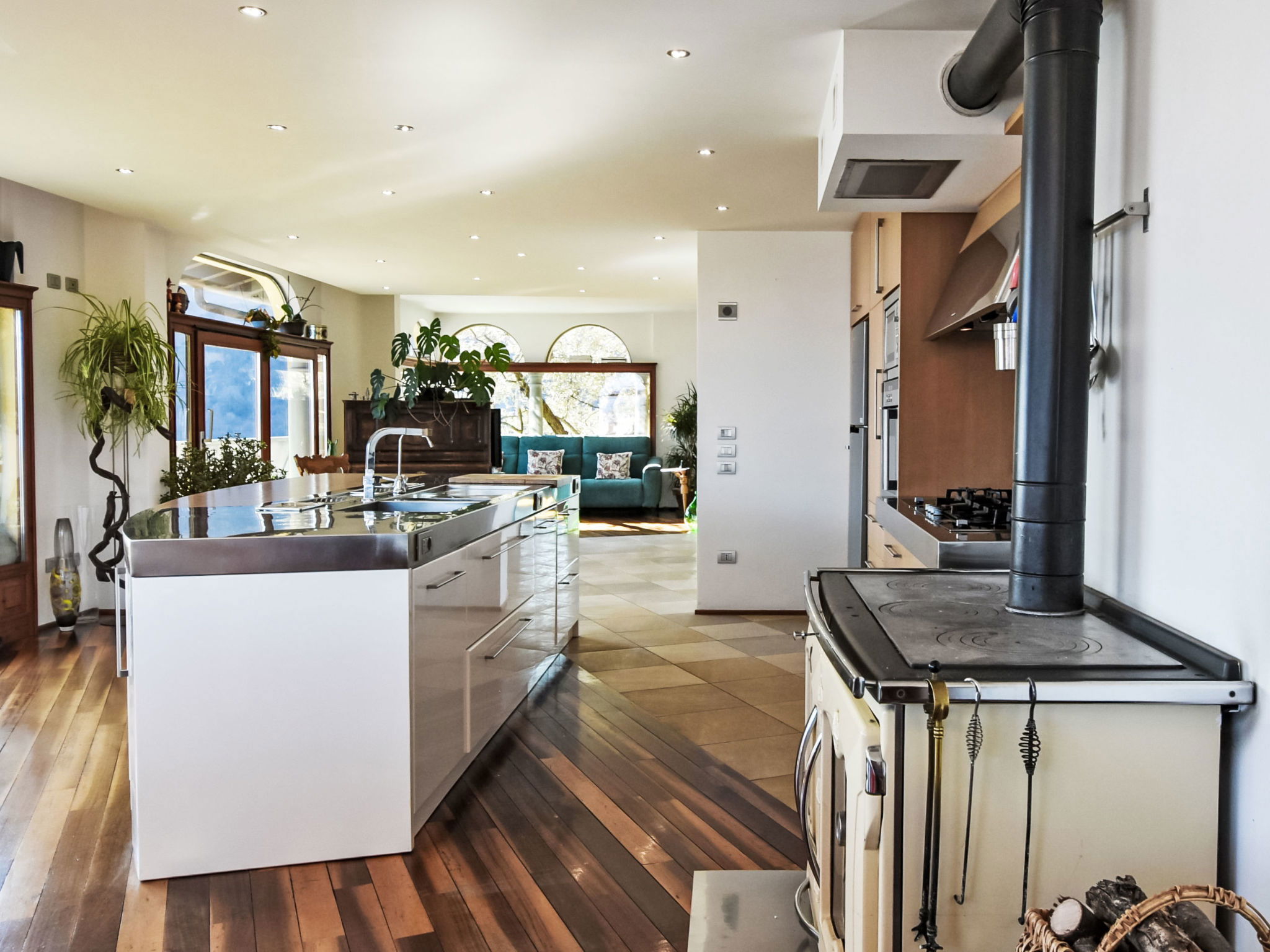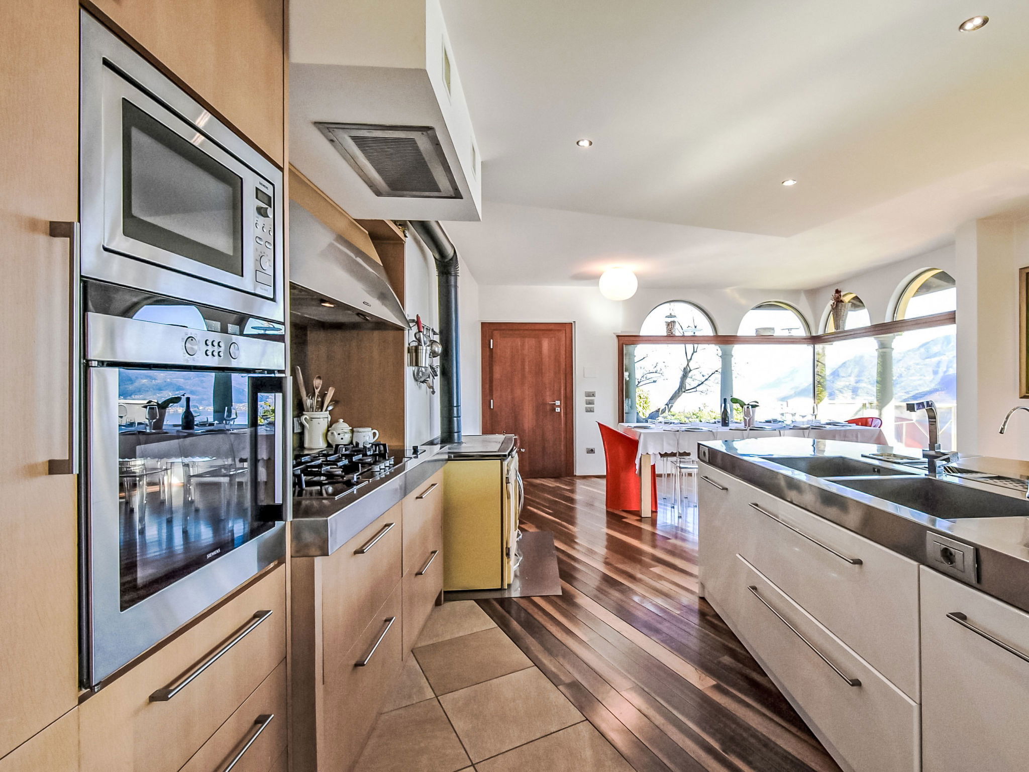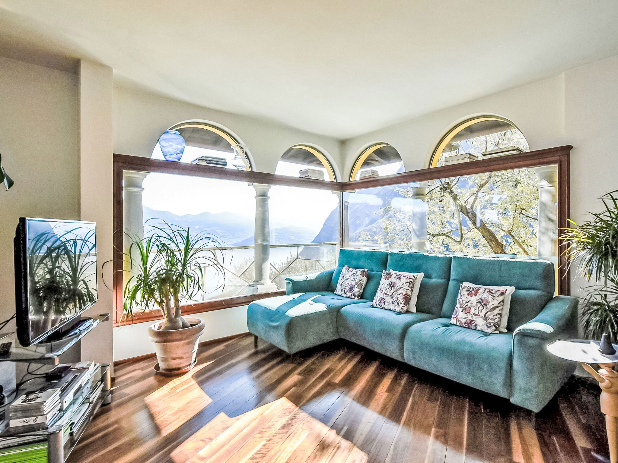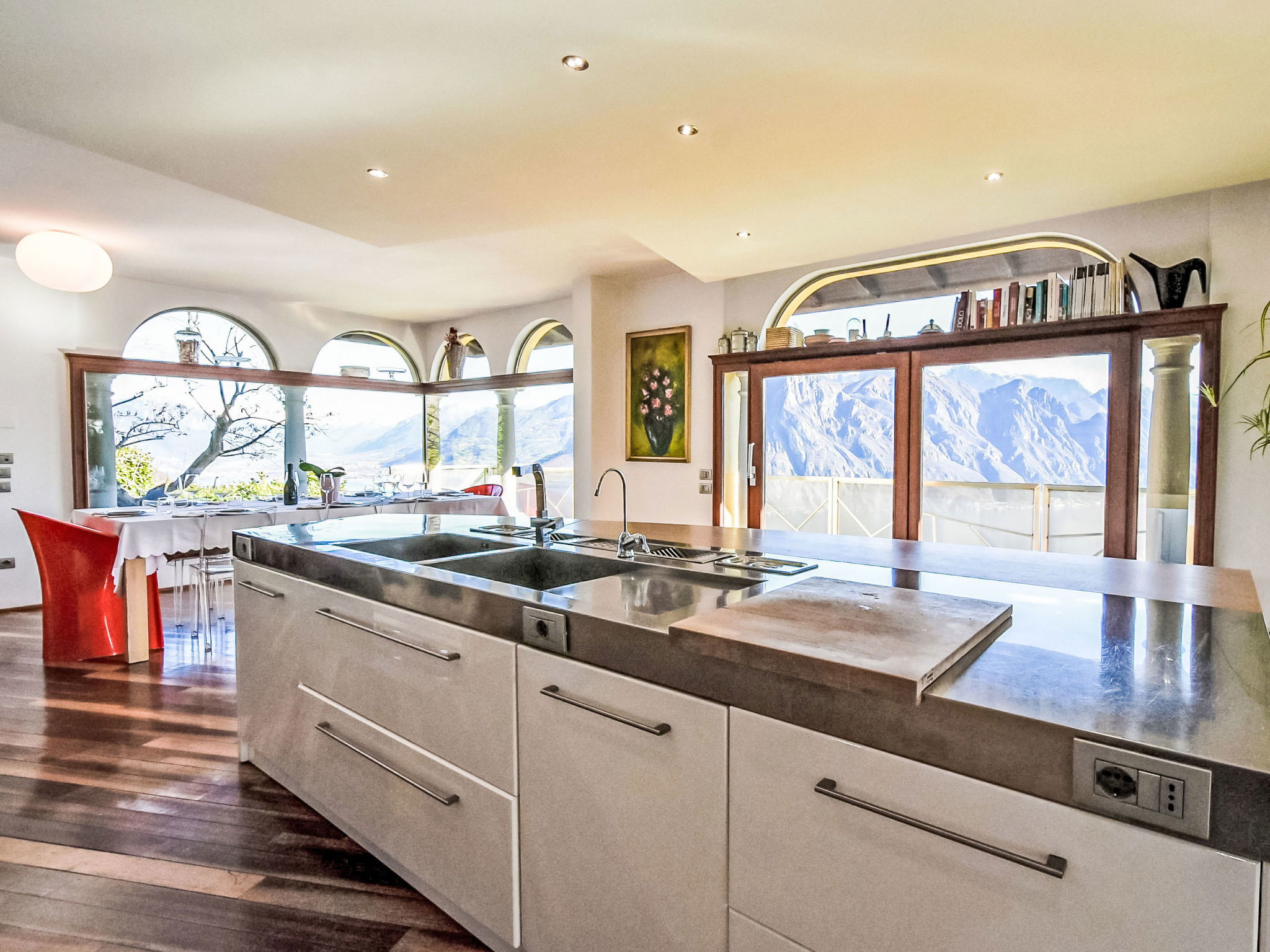 5-room apartment 280 m2 on 1st floor, south-east facing position. Spacious and bright, modern and stylish furnishings: large living/dining room with sliding door, panoramic window with Scandinavian wood stove (only for decoration), dining table and TV. Exit to the terrace. Living/sleeping room with panoramic window with 1 double sofabed (130 cm, length 180 cm). 1 room with 1 bed (80 cm, length 180 cm), 1 double bed (160 cm, length 180 cm), bath/bidet/WC. 1 room with 1 french bed (130 cm, length 190 cm), shower/bidet/WC. 1 large room with panoramic window with 1 french bed (120 cm, length 190 cm), shower/bidet/WC. Large kitchenette (oven, dishwasher, 6 gas rings, toaster, kettle, freezer, electric coffee machine, Capsules for coffee machine (Nespresso) free, cooking island, combination microwave) with double hand-basin. Bathroom. Parquet floors. Large terrace roofed, garden. Terrace furniture. Very beautiful panoramic view of the lake and the mountains. Facilities: washing machine, children's high chair, baby cot, hair dryer. Internet (WiFi, free). Please note: suitable for families. Non-smokers only. Maximum 1 pet/ dog allowed. Private entrance. IT016102C24LDAHOO9