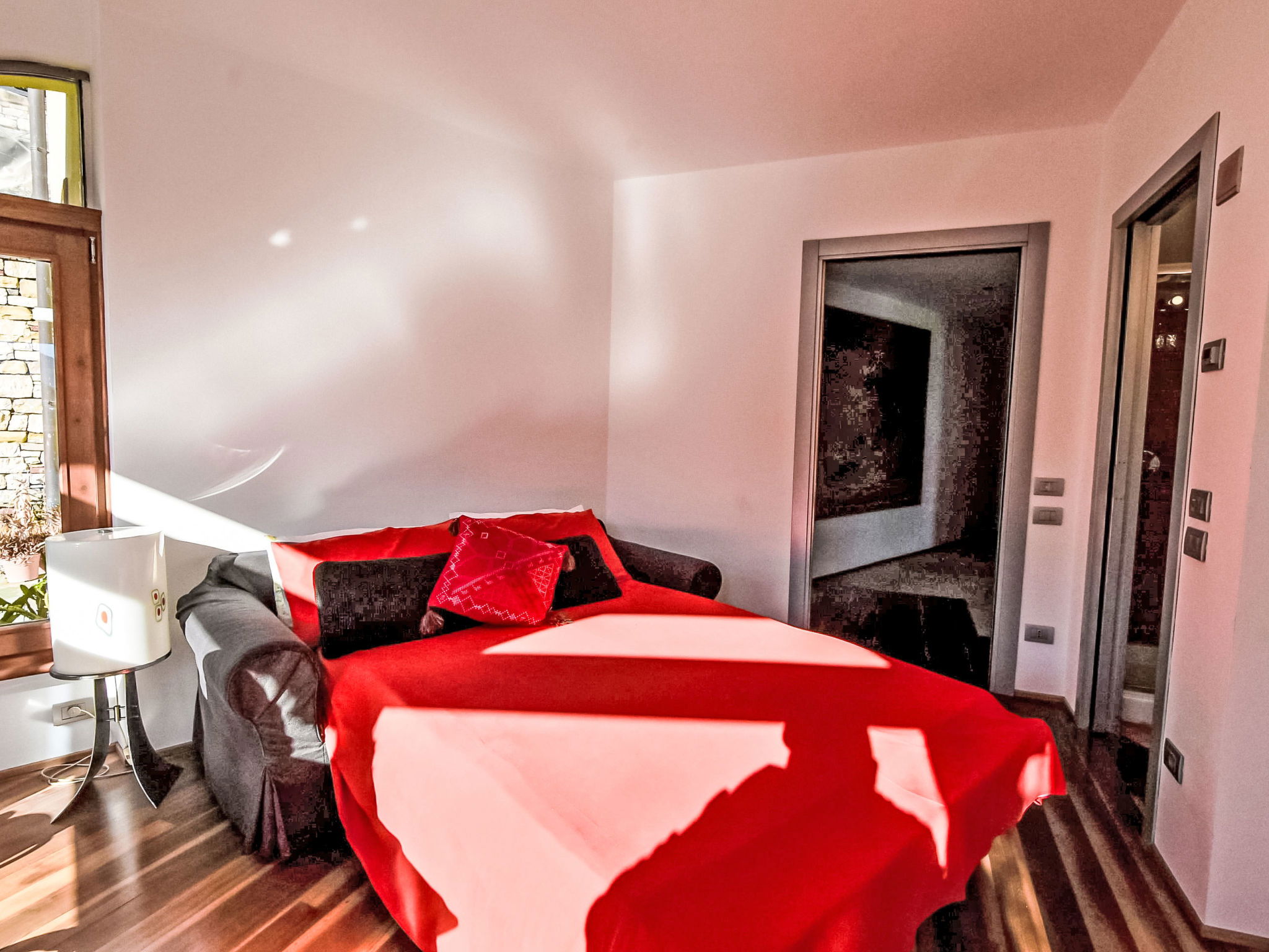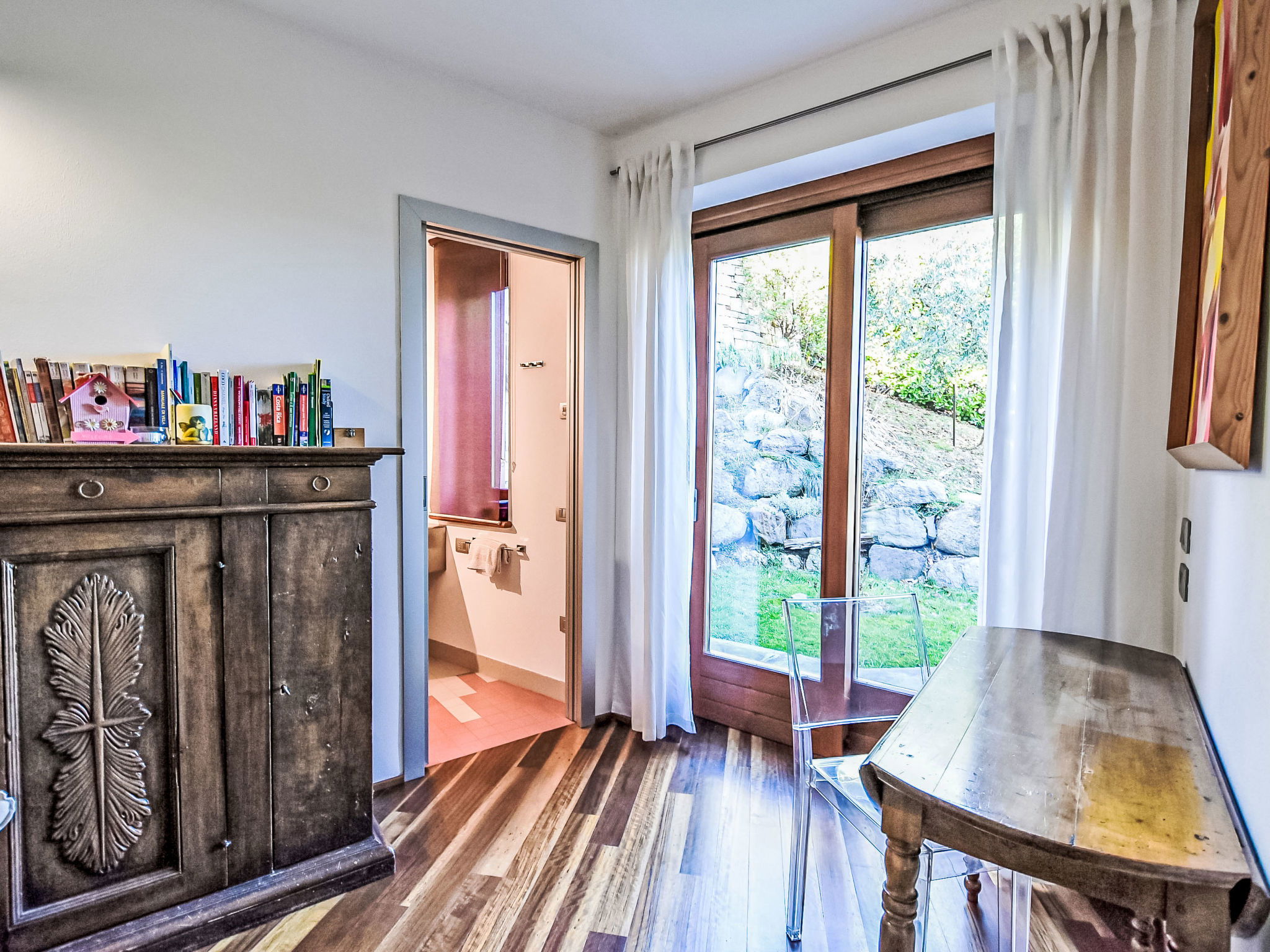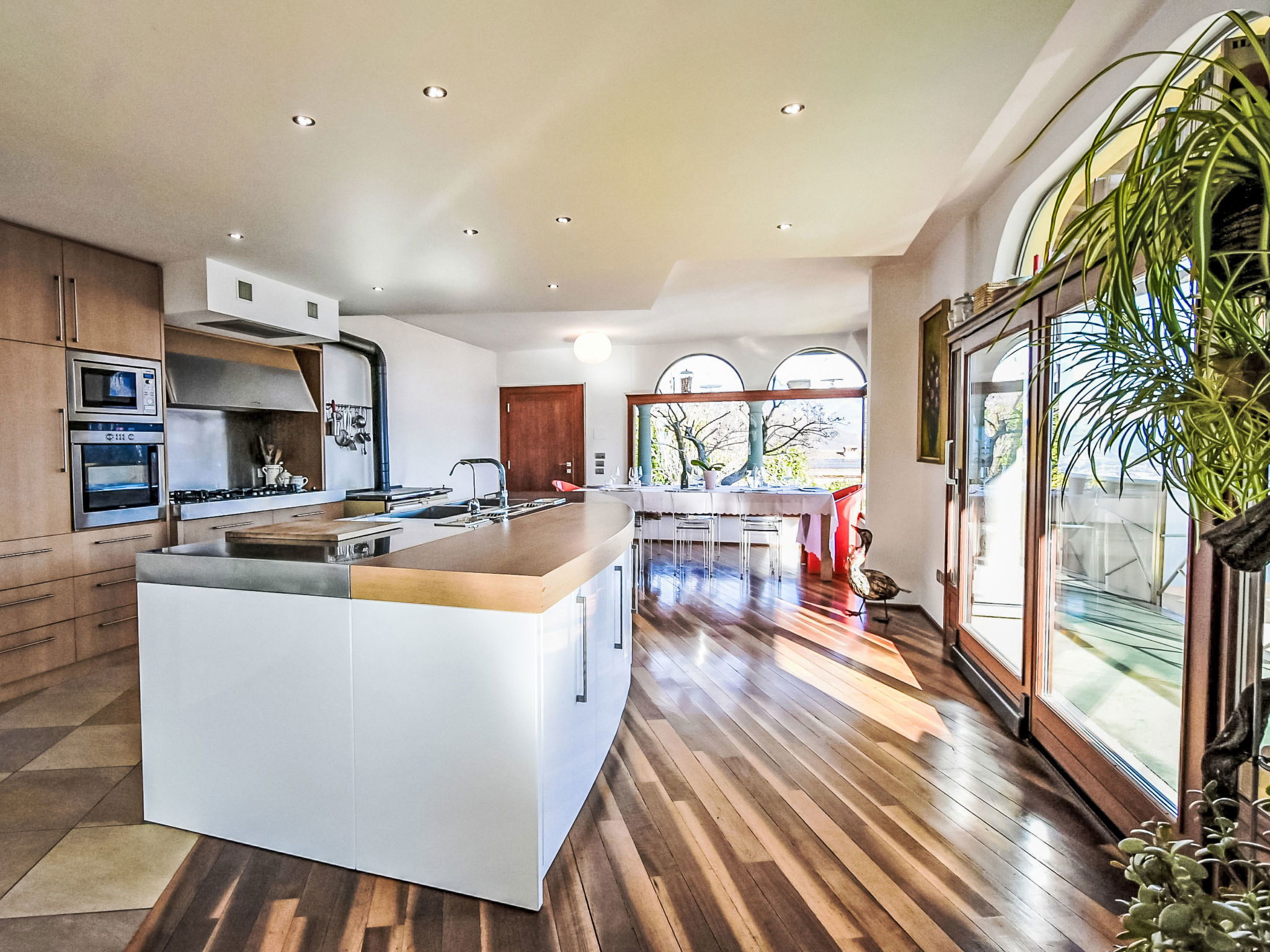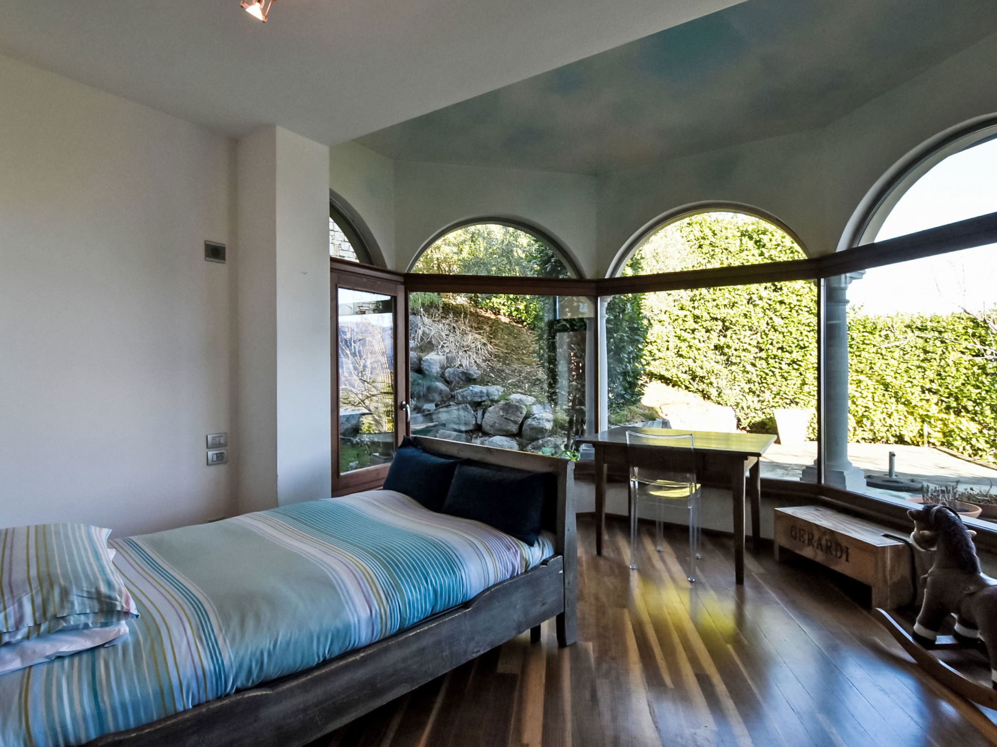 5-room apartment 280 m2 on 1st floor, south-east facing position. Spacious and bright, modern and stylish furnishings: large living/dining room with sliding door, panoramic window with Scandinavian wood stove (only for decoration), dining table and TV. Exit to the terrace. Living/sleeping room with panoramic window with 1 double sofabed (130 cm, length 180 cm). 1 room with 1 bed (80 cm, length 180 cm), 1 double bed (160 cm, length 180 cm), bath/bidet/WC. 1 room with 1 french bed (130 cm, length 190 cm), shower/bidet/WC. 1 large room with panoramic window with 1 french bed (120 cm, length 190 cm), shower/bidet/WC. Large kitchenette (oven, dishwasher, 6 gas rings, toaster, kettle, freezer, electric coffee machine, Capsules for coffee machine (Nespresso) free, cooking island, combination microwave) with double hand-basin. Bathroom. Parquet floors. Large terrace roofed, garden. Terrace furniture. Very beautiful panoramic view of the lake and the mountains. Facilities: washing machine, children's high chair, baby cot, hair dryer. Internet (WiFi, free). Please note: suitable for families. Non-smokers only. Maximum 1 pet/ dog allowed. Private entrance. IT016102C24LDAHOO9