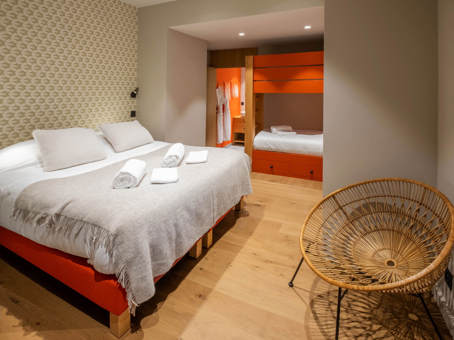 - Bedroom 1 (family suite): 1 king-size bed (180 cm), 1 bunk bed (2 beds), ensuite bathroom (bathtub, shower, WC), terrace access.