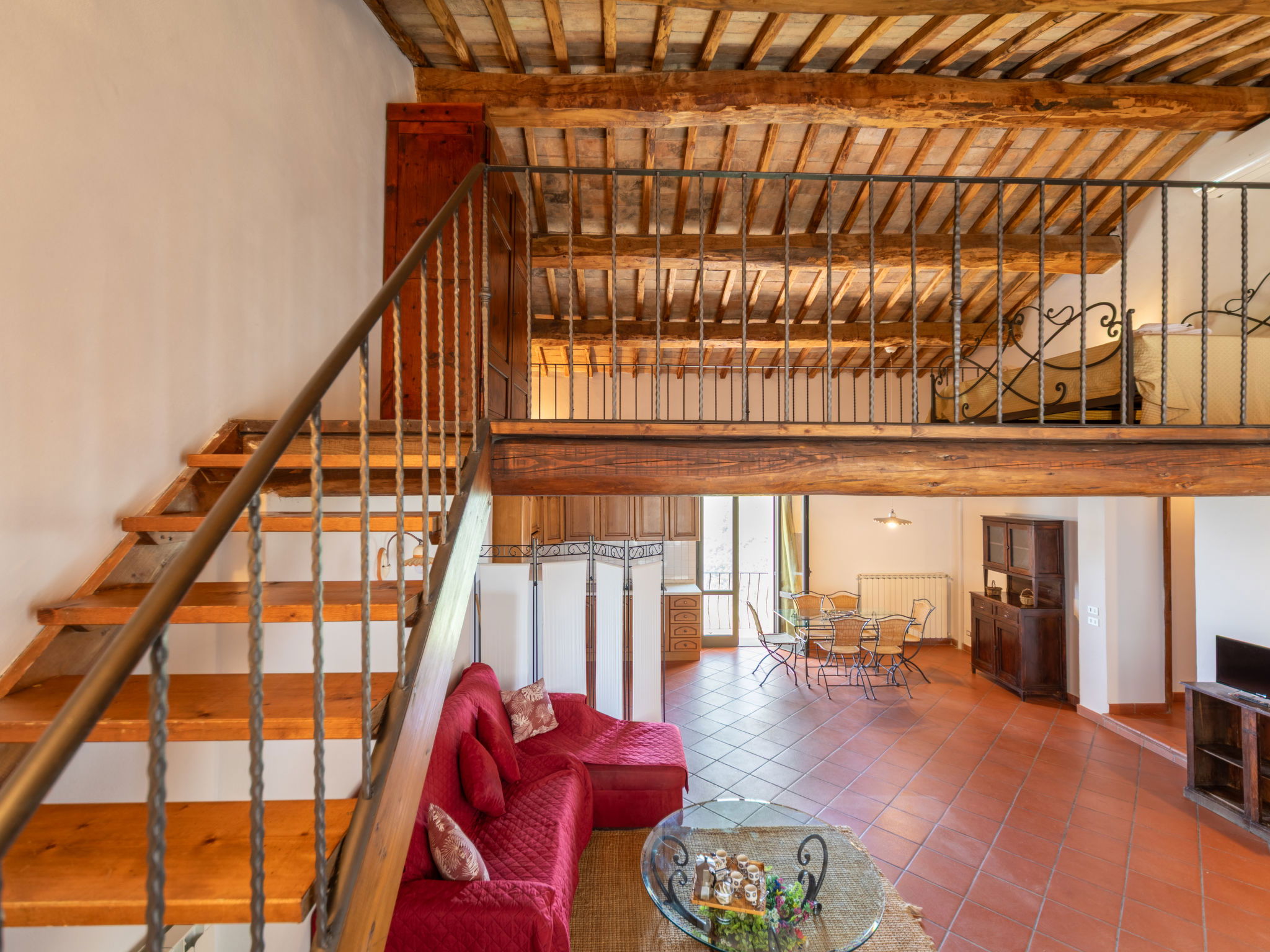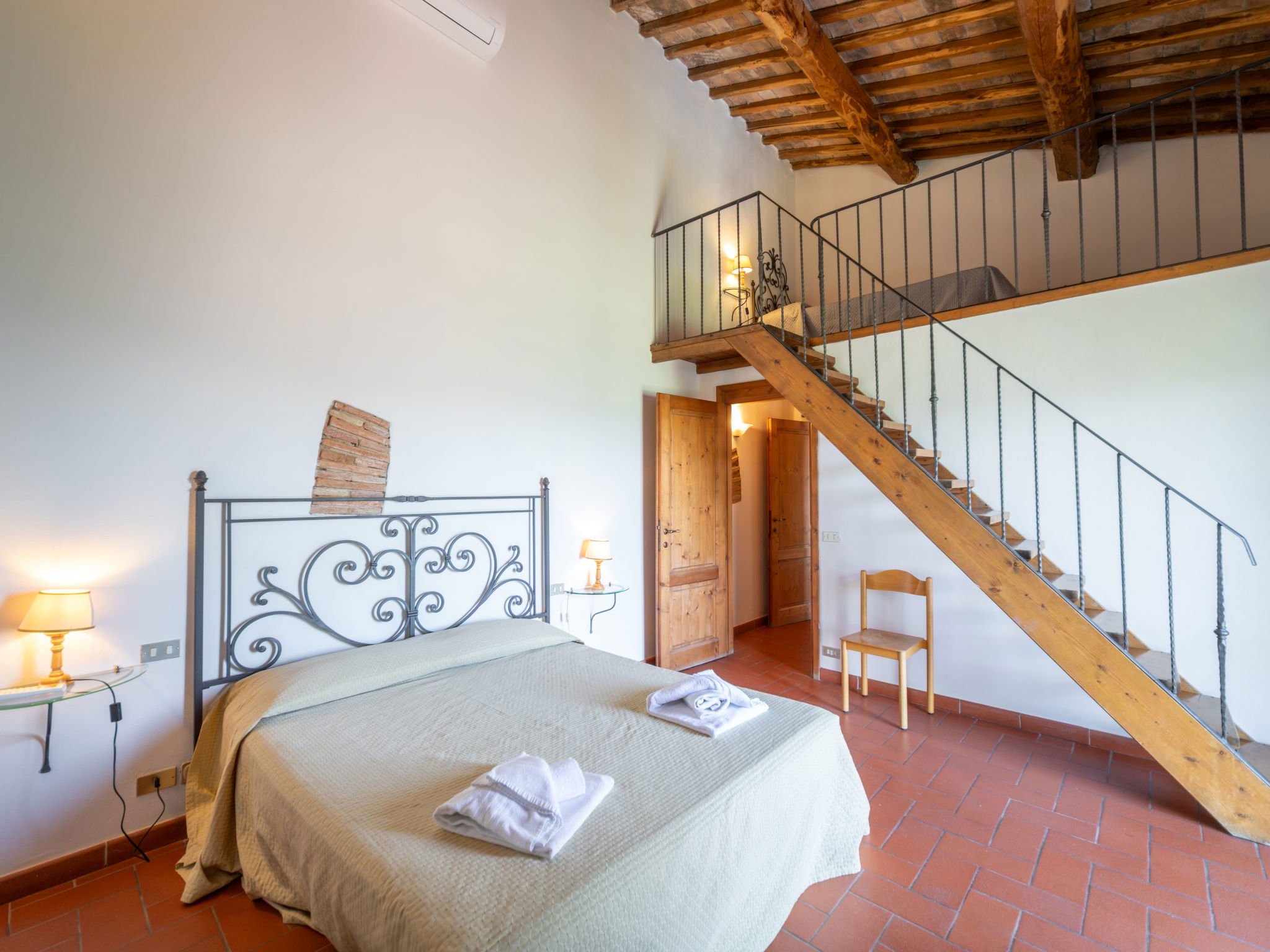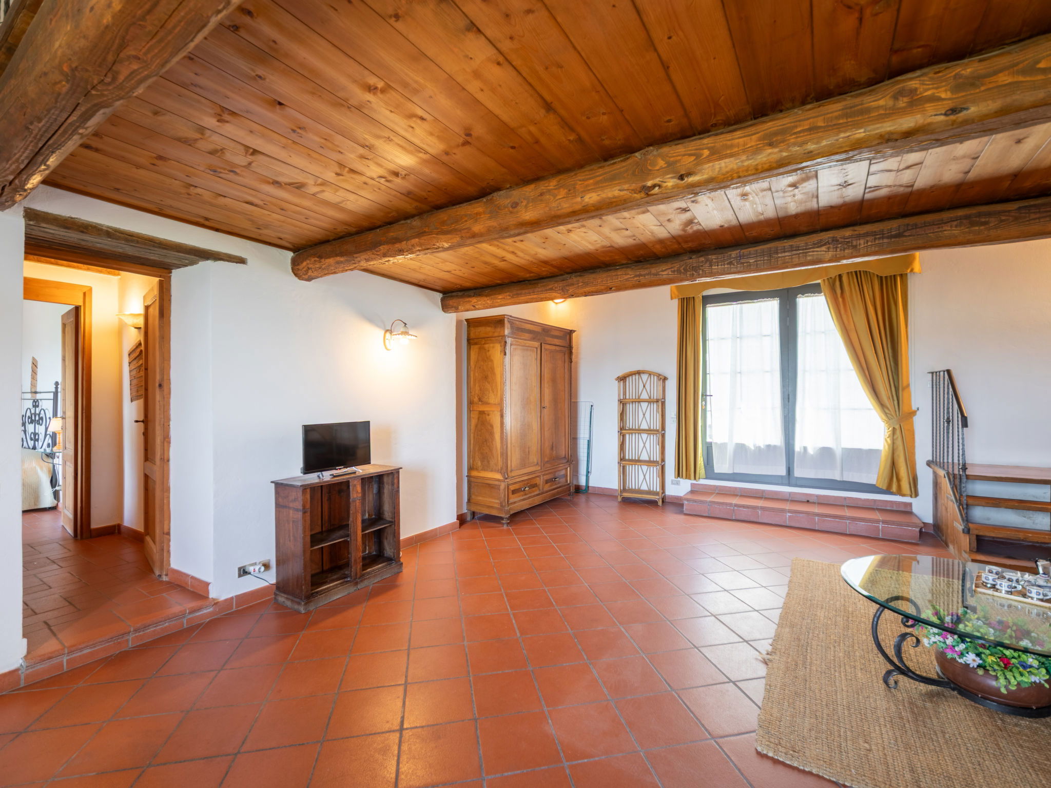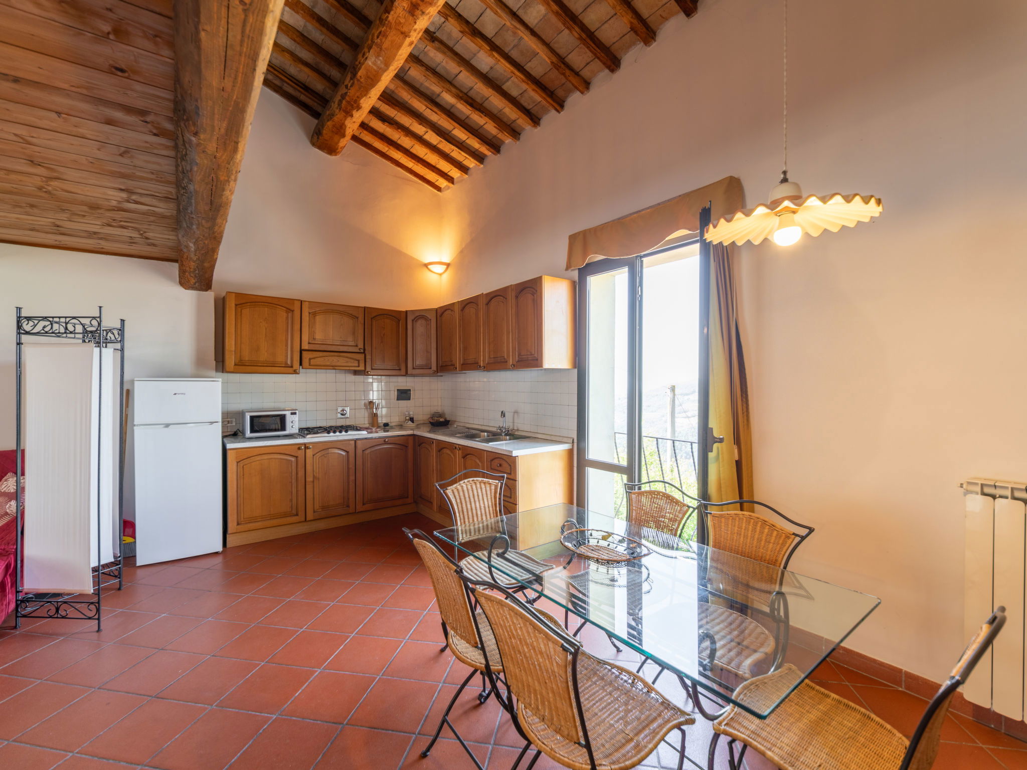 "Fienile", 3-room apartment 95 m2 on 2 levels, on the ground floor. Comfortable and rustic furnishings: living/dining room with 1 double sofabed and TV. 1 double bedroom with air conditioning. Open gallery with 1 double bed. Kitchenette (4 hot plates, dishwasher, toaster, kettle, microwave, freezer). Shower/bidet/WC. Terrace furniture. Very beautiful, of the countryside. Facilities: baby cot for up to 2 year olds (extra), hair dryer. Internet (WiFi, free). Suitable for families. Maximum 1 pet/ dog allowed. IT048033B5S2NHKPIG
