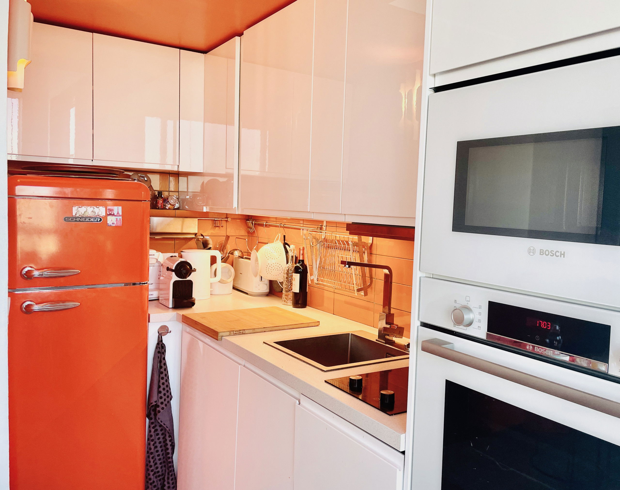 The open plan kitchen, of induction, is equipped with refrigerator, microwave, oven, freezer, dishwasher, dishes/cutlery, kitchen utensils, coffee machine, toaster and kettle.