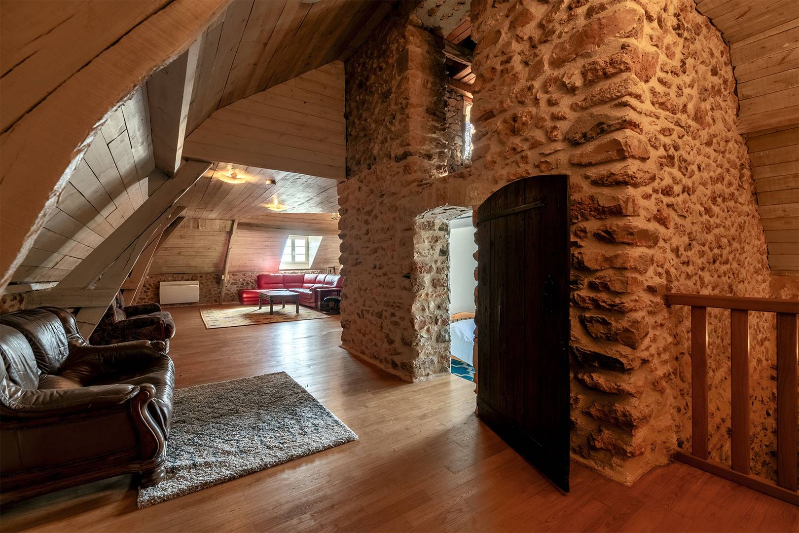 From here, a staircase leads to the floor, where there is a lounge area and a double bedroom in the pigeonnier. A long corridor leads to 3 double bedrooms and two bathrooms.