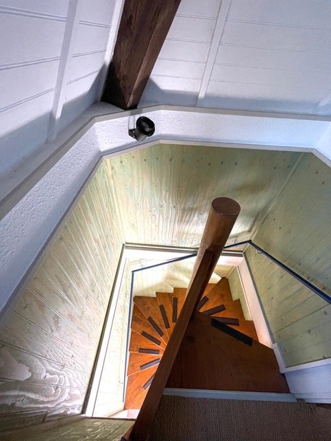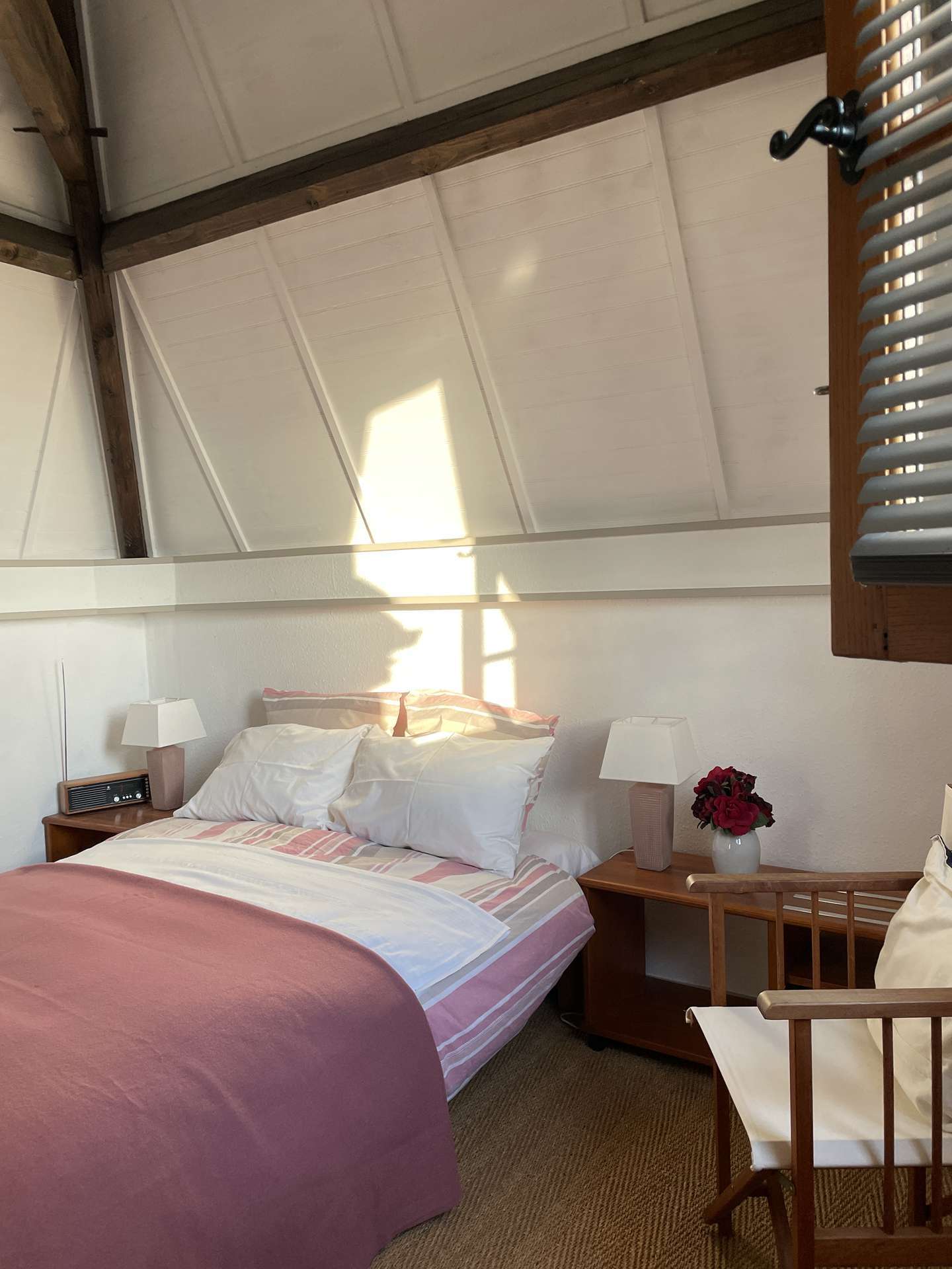 The spiral staircase leads to the floor of the "pigeonnier" where you will find a pretty double bedroom and shower room.