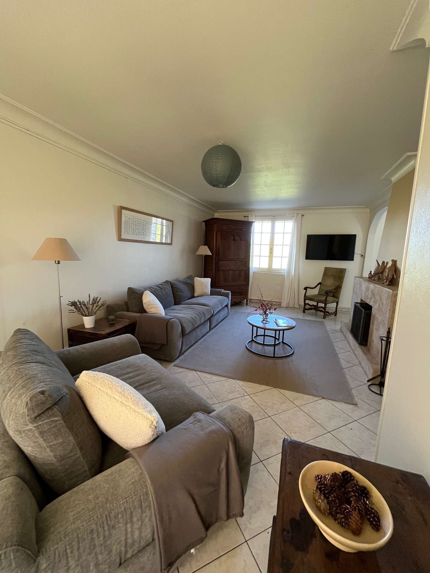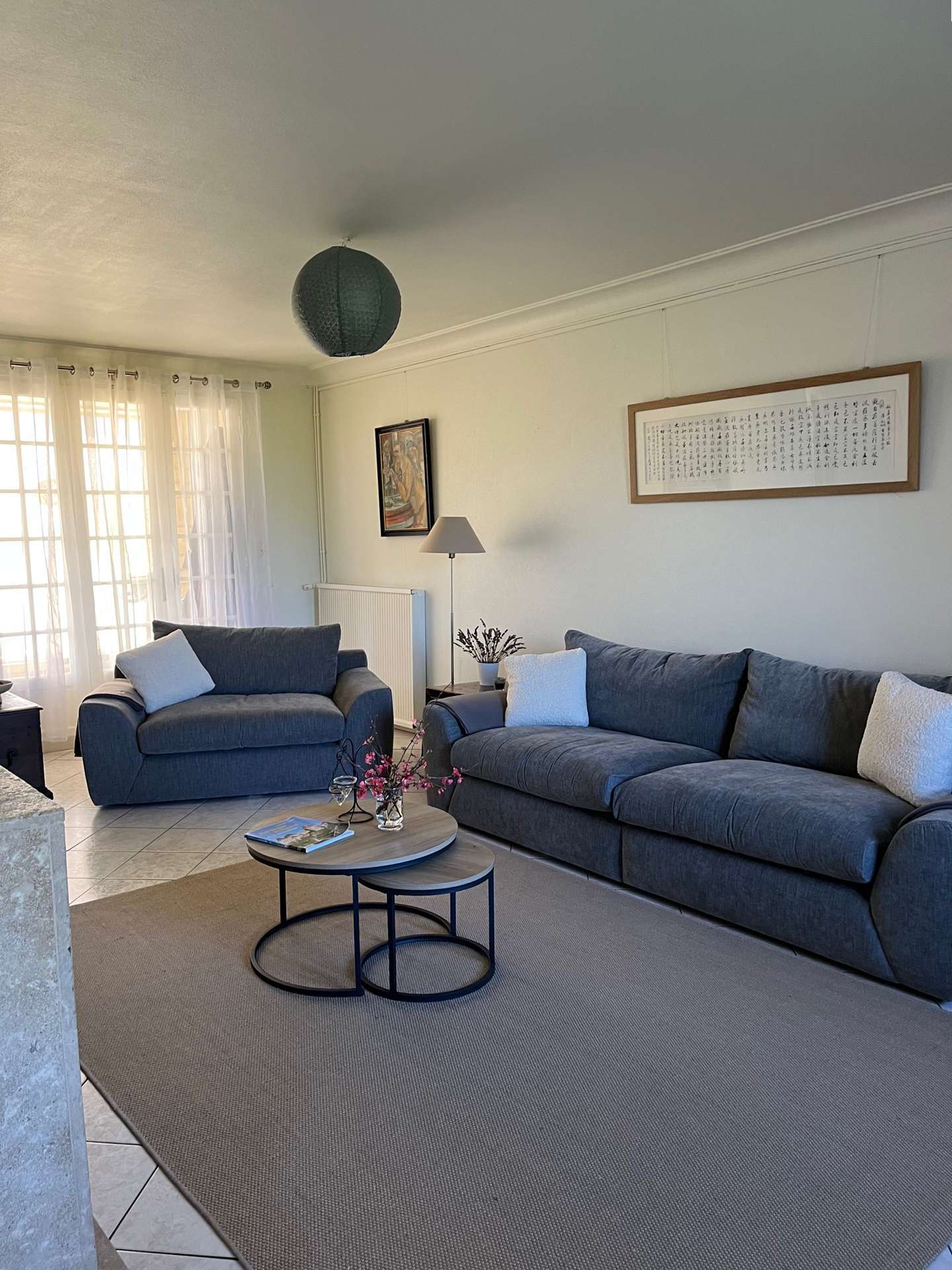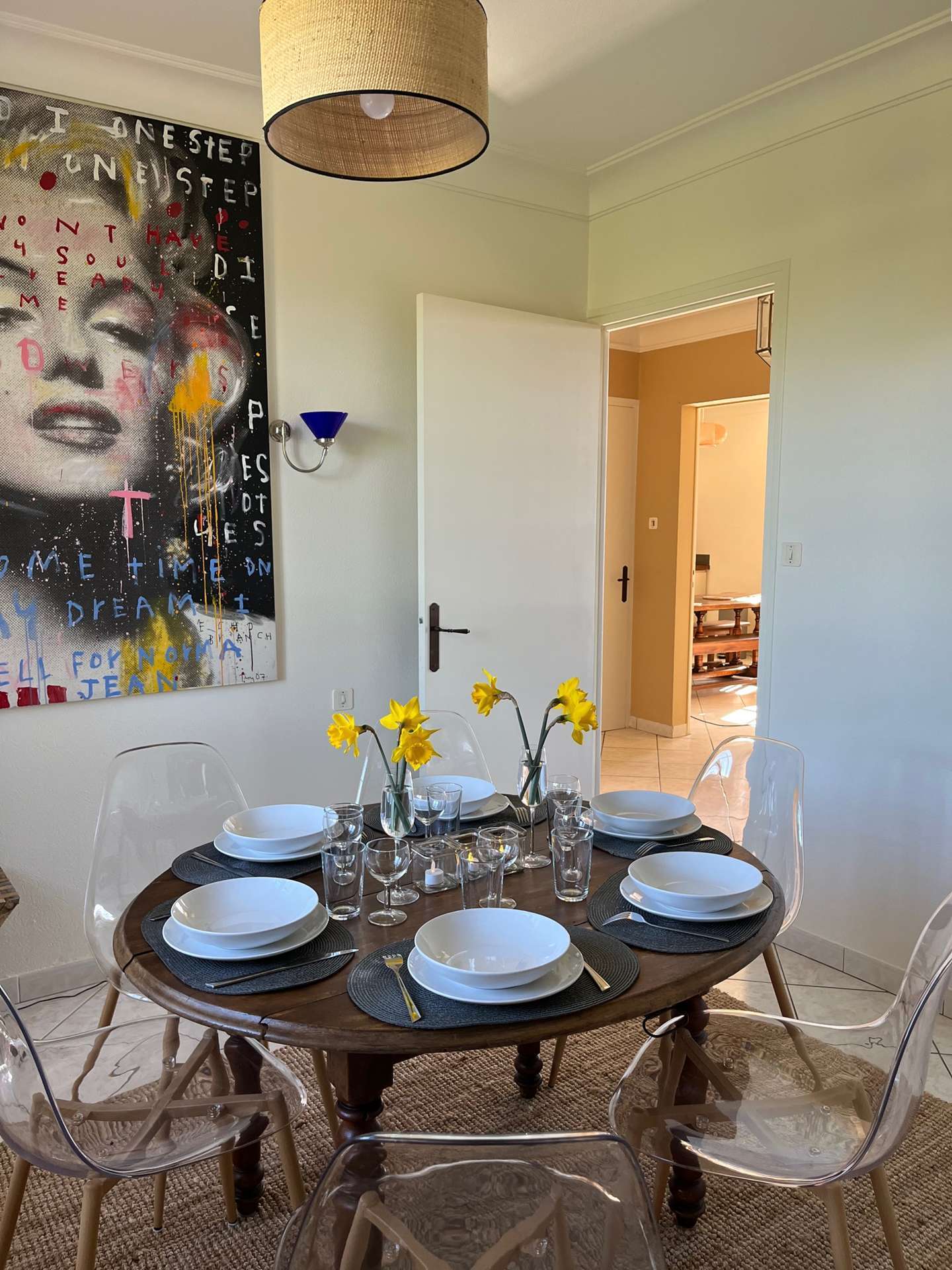 A bright living room with comfortable sofas. A fully equipped kitchen opening onto the garden. Three bedrooms — including a master suite with private bathroom. Two bathrooms in total. Art on the walls, character everywhere.