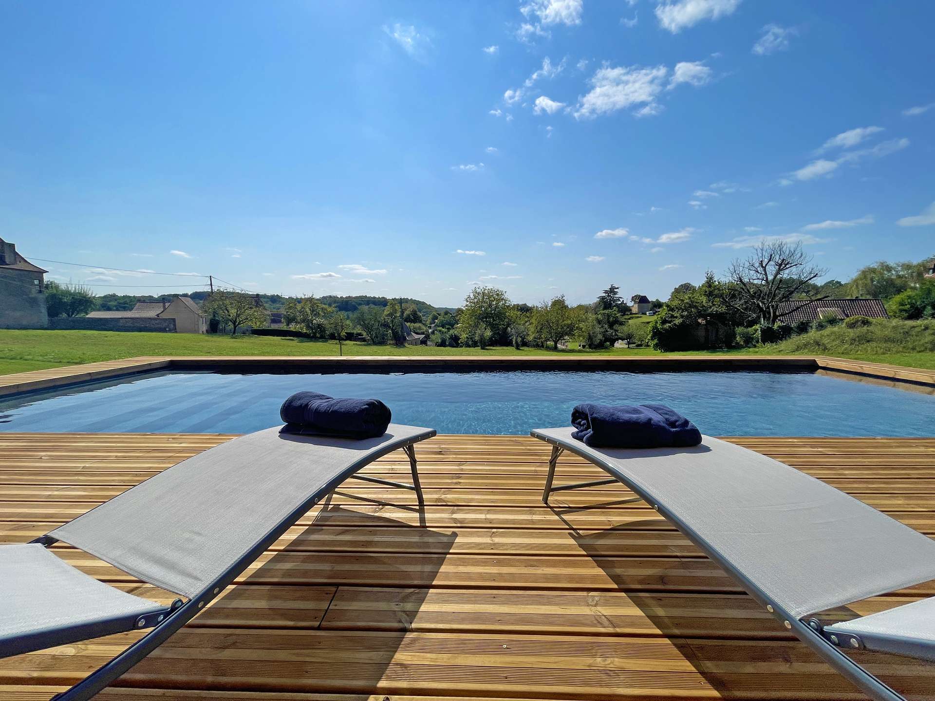 The pool is surrounded by a wooden deck and bordered by stone gabions — a blend of modern and authentic. It is protected by a safety roller cover. Sun loungers, large views over the fields and the village of Calès. Under the old tree, a wrought-iron table awaits your summer dinners. The grounds are spacious, with complete privacy.