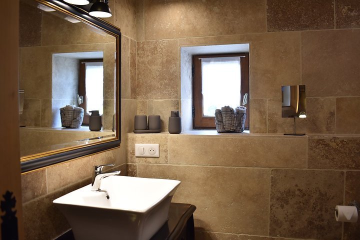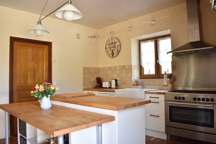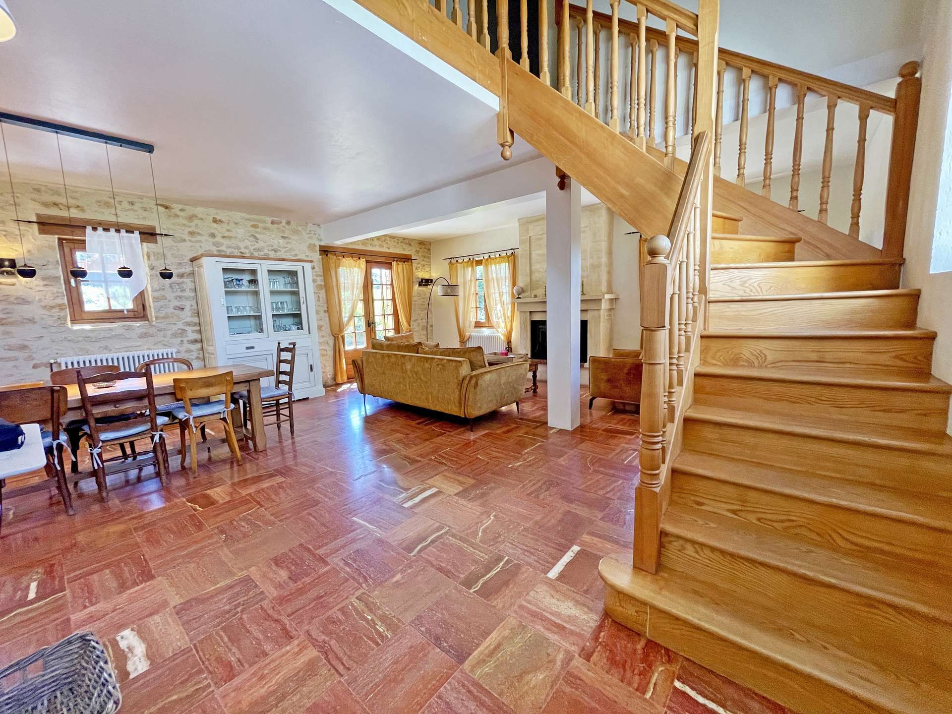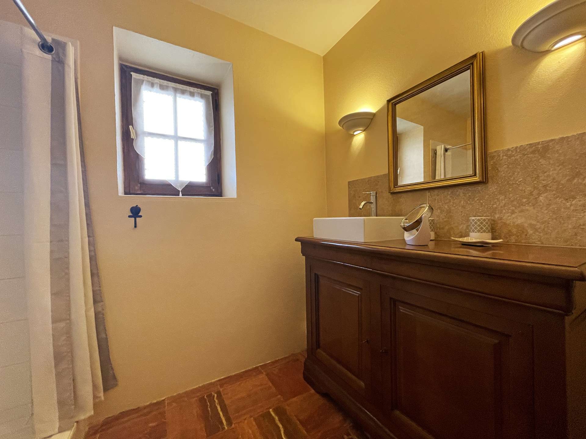 On the ground floor, the solid wood entrance door opens onto the dining/living room and open kitchen with French windows leading onto the terrace and swimming pool furnished with sun loungers and parasols.