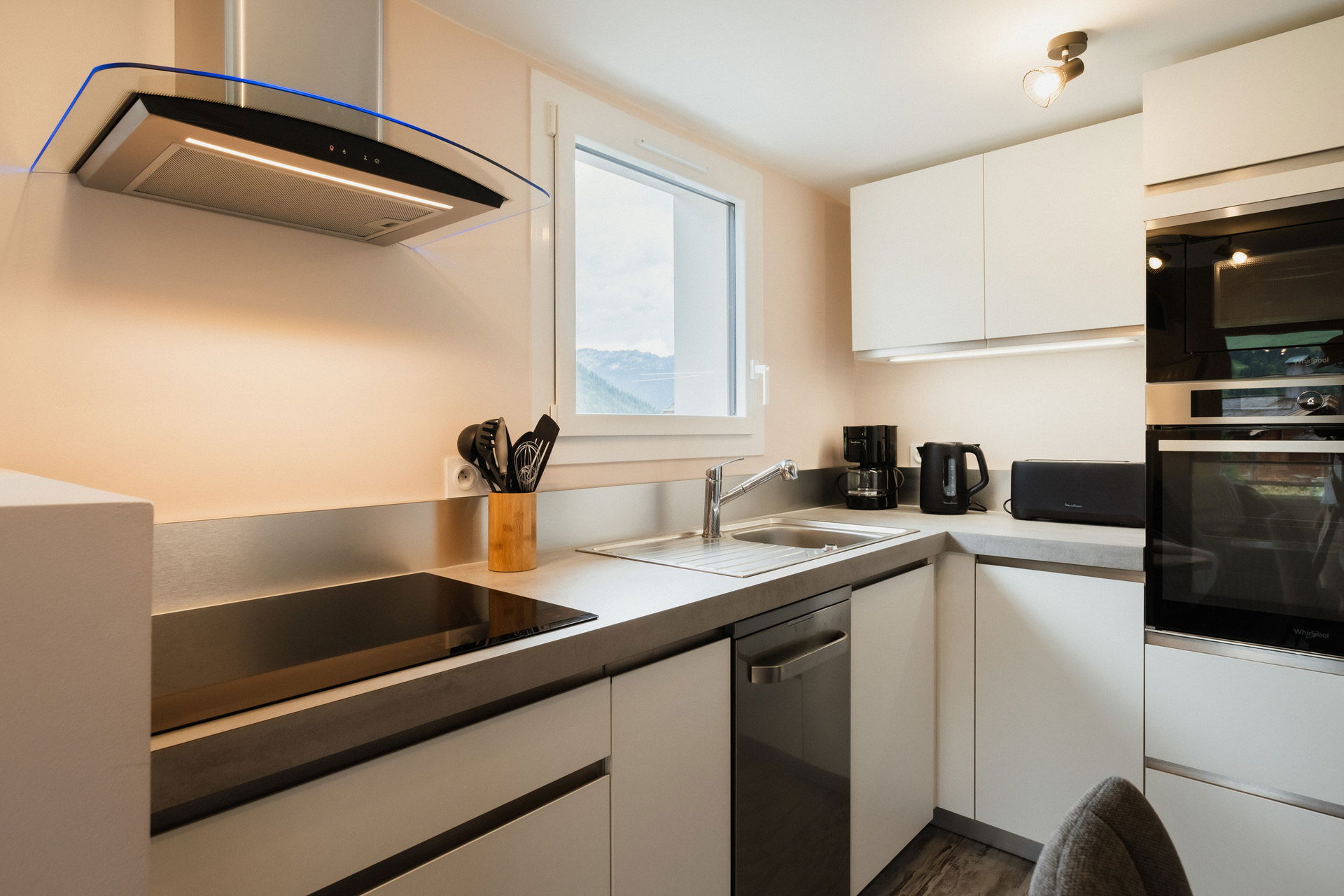 KITCHEN: fridge-freezer (214L), Oven, INDUCTION STOVE, MICROWAVES, DISHWASHER, west facing window, nextdoor residences / mountains view