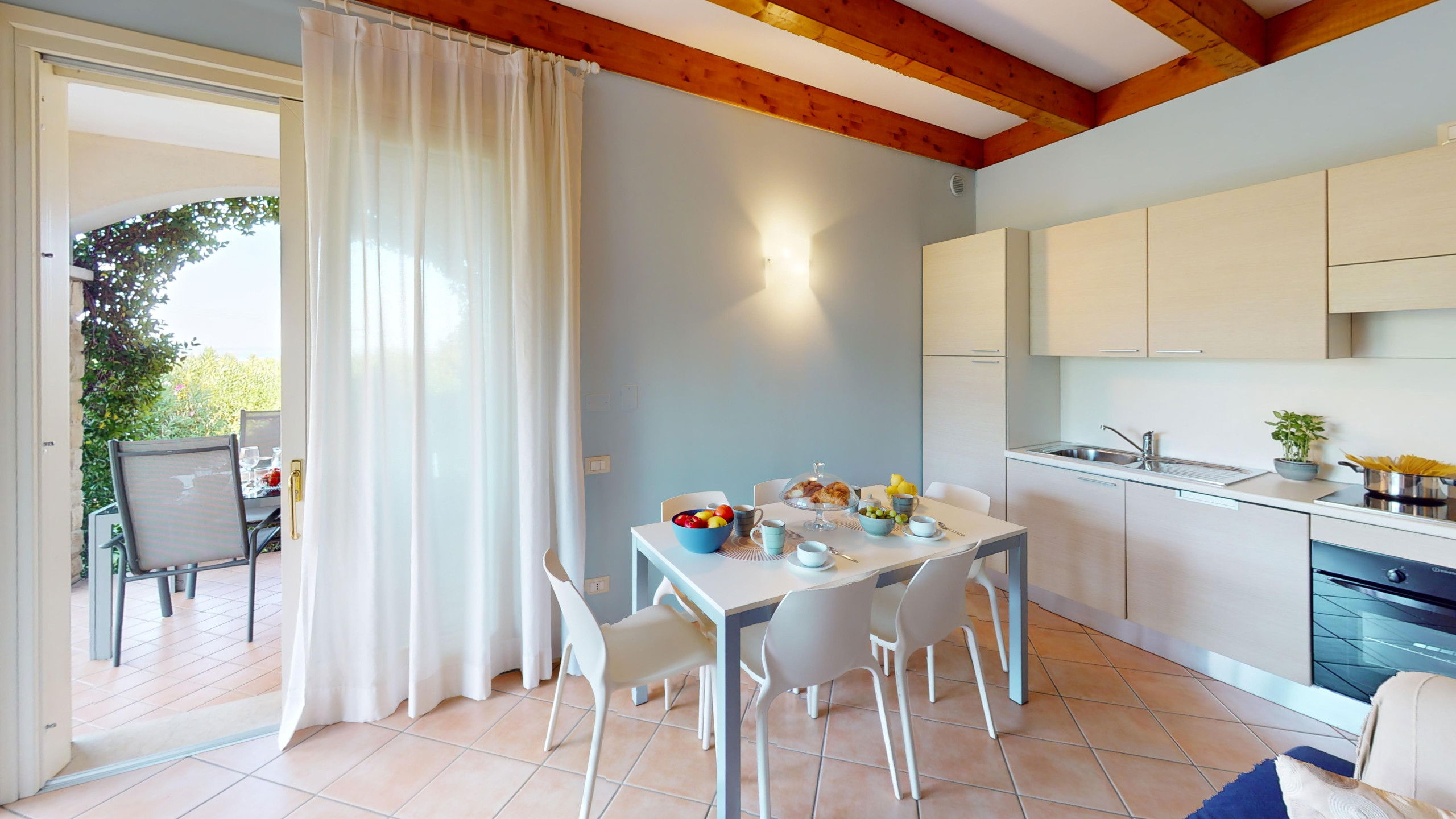 The apartment, bright and functional, is the ideal refuge after a day spent exploring Lake Garda: the fully equipped American kitchen will make you feel at home, whether you want to cook comfortably or enjoy a morning coffee, comfortable sofa bed in the living area, double bedroom, second room with bunk beds, both overlooking the garden.