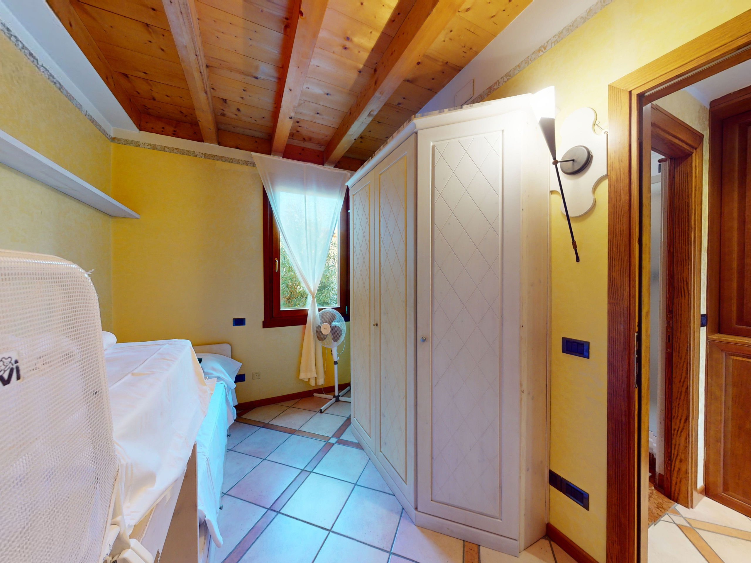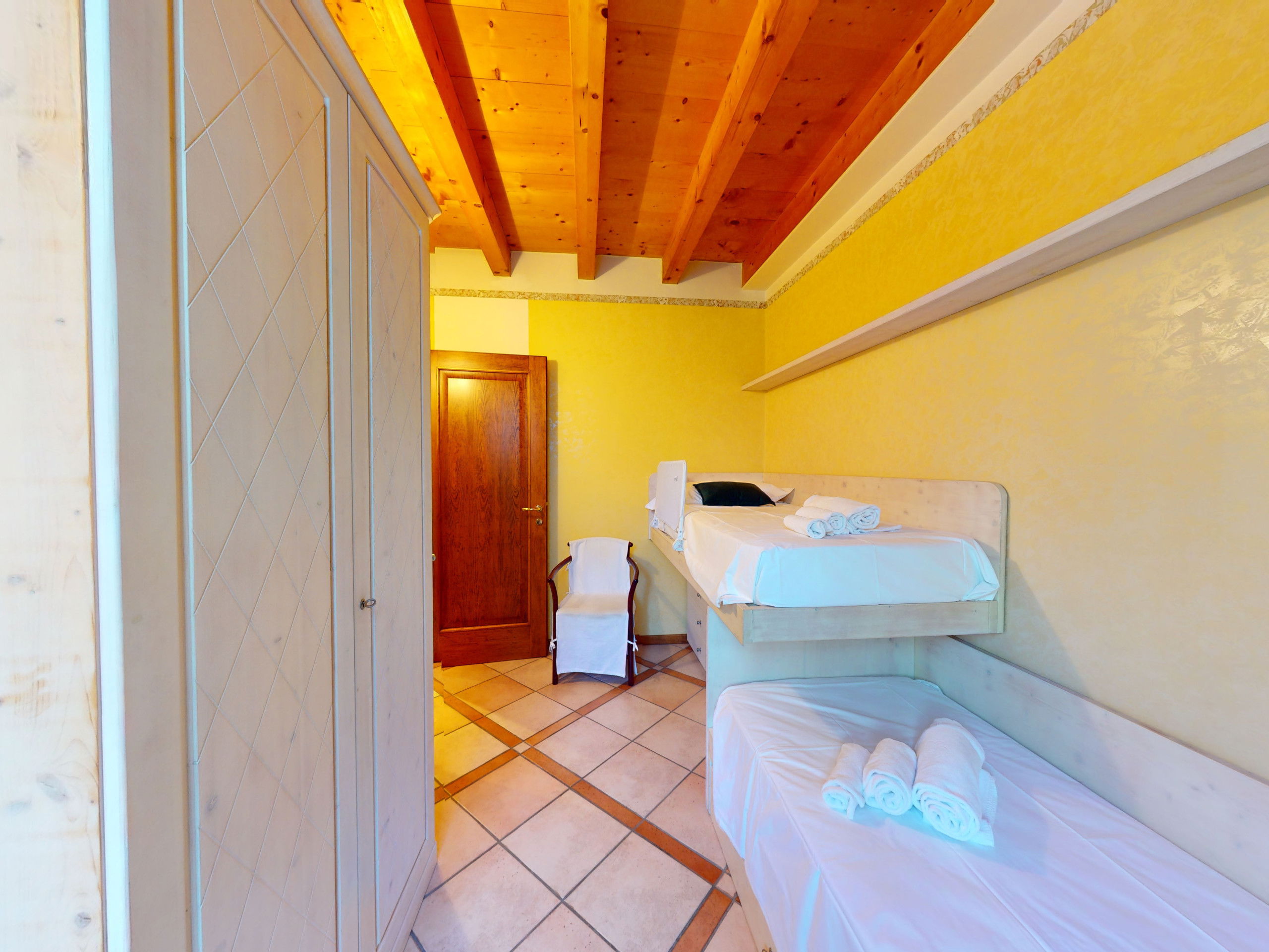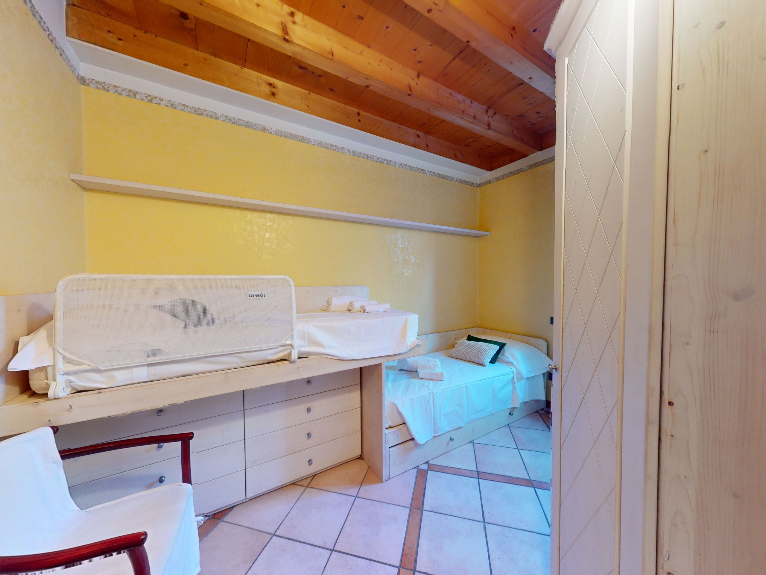 Garda Pleasure can accommodate up to 5 people thanks to two carefully furnished bedrooms: one with a double bed and the other with a bunk bed, a third single bed and a study corner for a PC workstation, ideal for ensuring functional and private spaces for each guest with access to the rear garden.