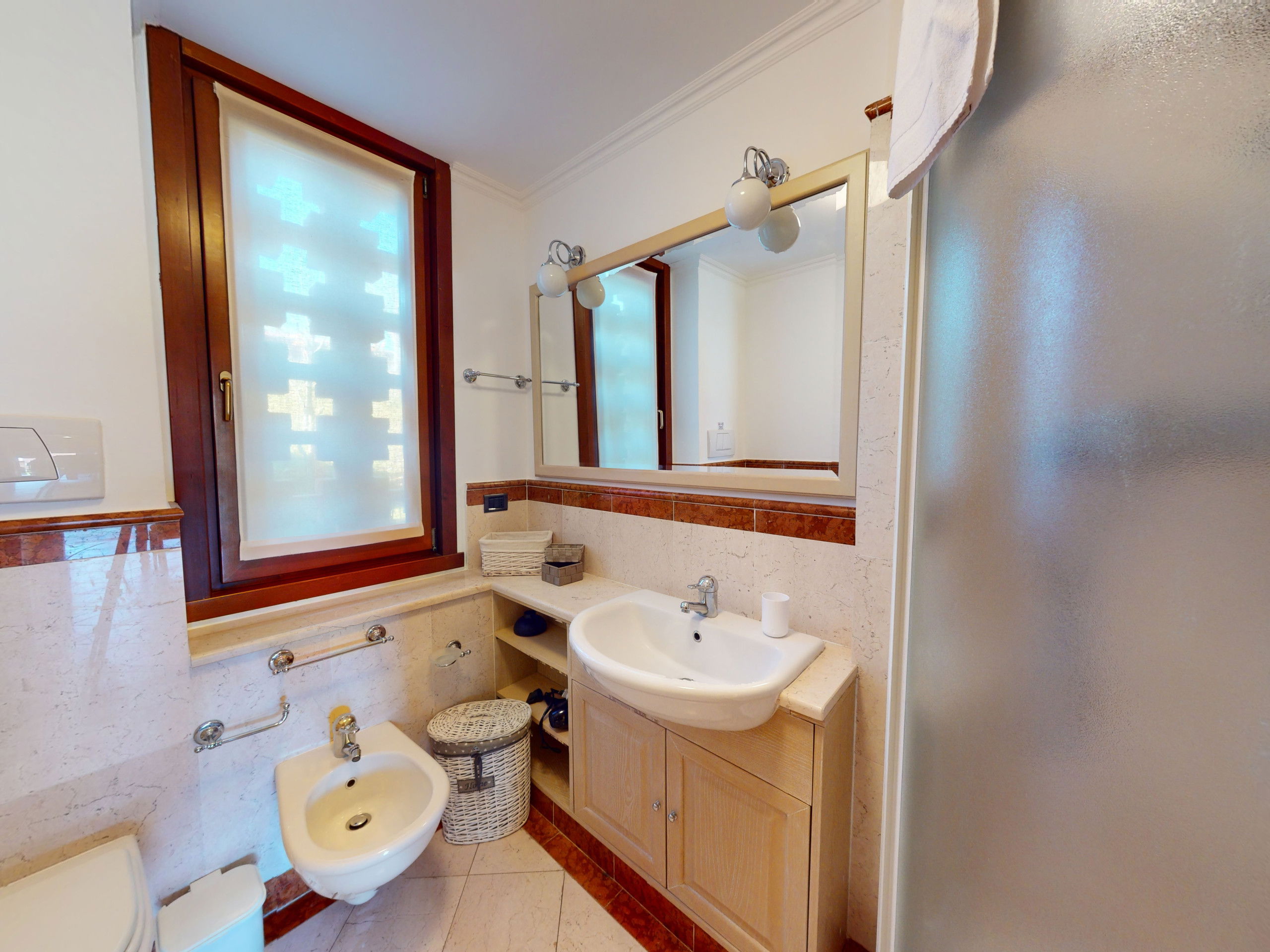 A windowed bathroom with a shower and equipped with a convenient wardrobe for the washing machine, optimising space and keeping the environment tidy.