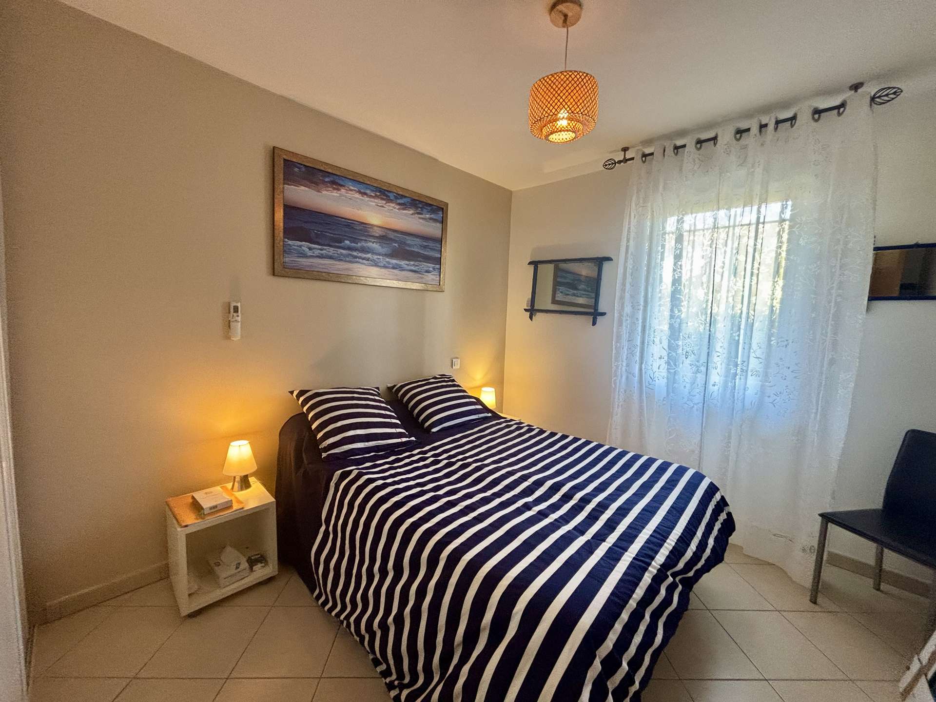 This beautiful apartment is located on the ground floor and is composed of an equipped kitchen, a living room with a convertible sofa, a bathroom with WC, a bedroom with a double bed (140).