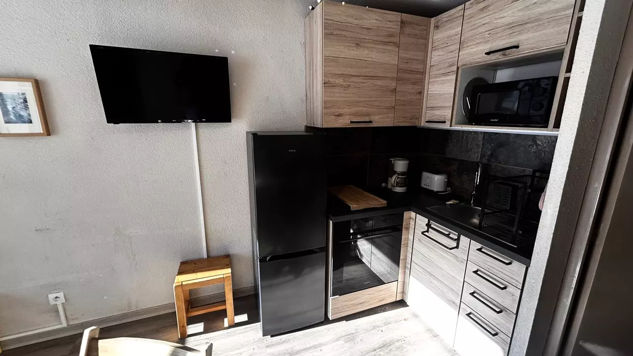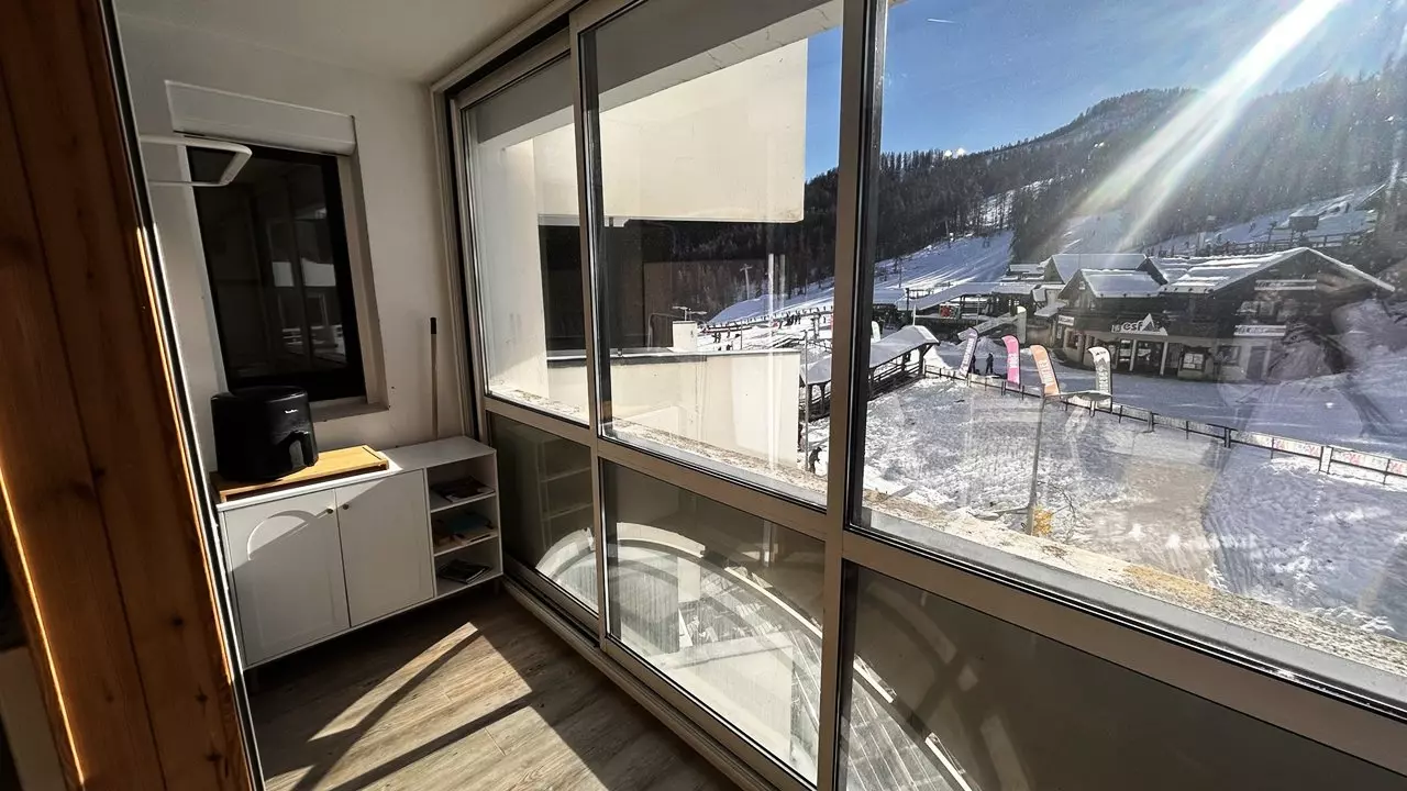 - A dividing door opens onto the kitchenette and the living room with a south-facing loggia, with a beautiful view of the slopes and the snow front.