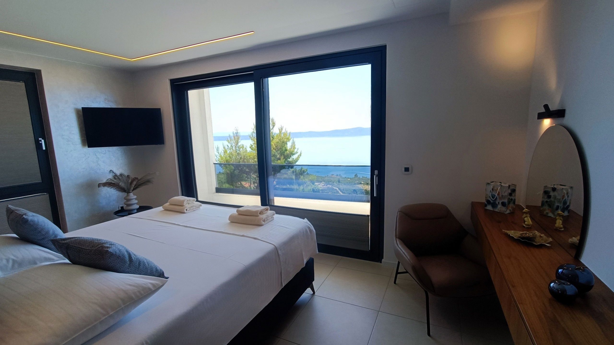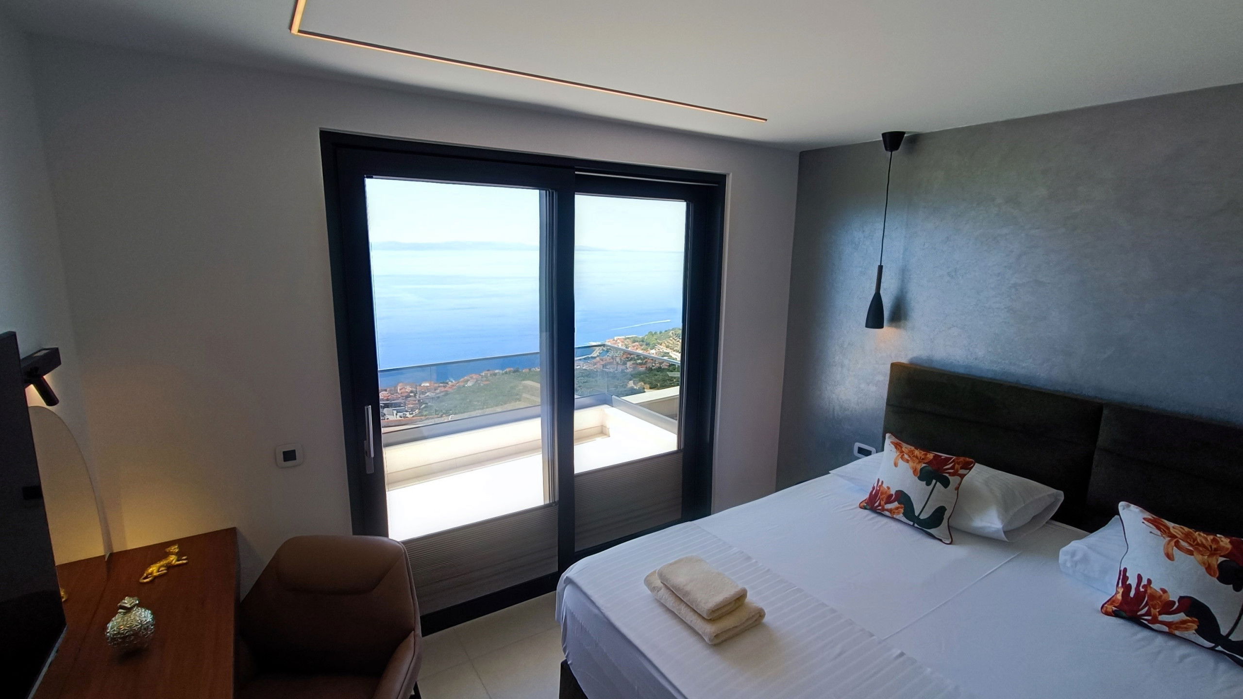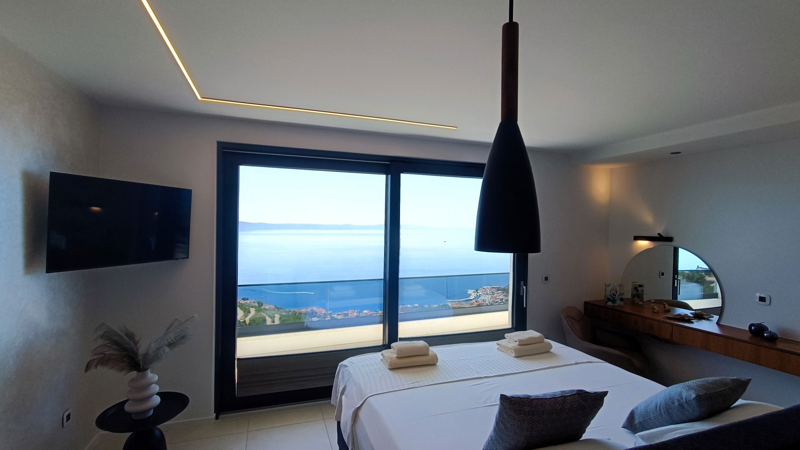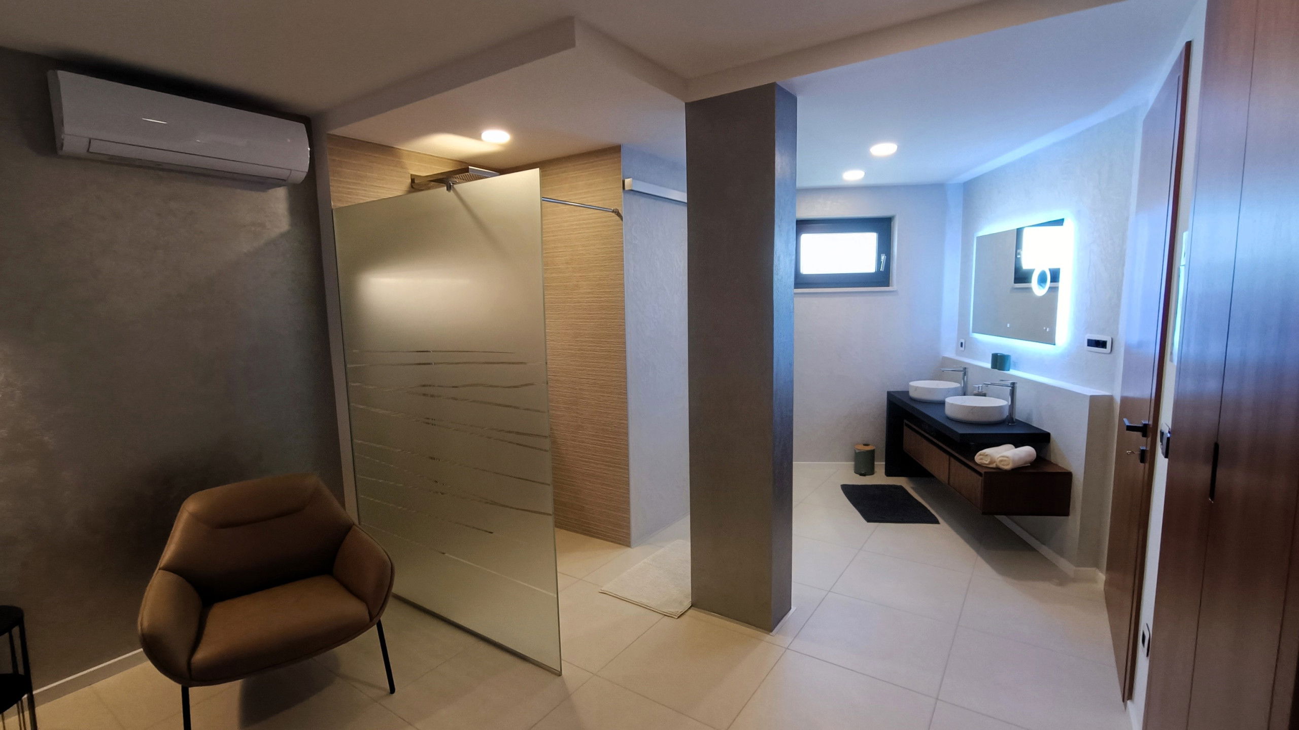 On the floor, you will find two spacious bedrooms with box spring beds (king-size) and integrated bathrooms, each equipped with a shower (and bathtub), double washbasin, LED mirror, and separate toilet. All bedrooms are air-conditioned and feature a flat-screen TV, a wardrobe, and an elegant dressing table. From here, you have access to the terrace and can enjoy the fantastic view of the sea and the surrounding mountains. Each bedroom has a sea view and is equipped with blackout blinds.
