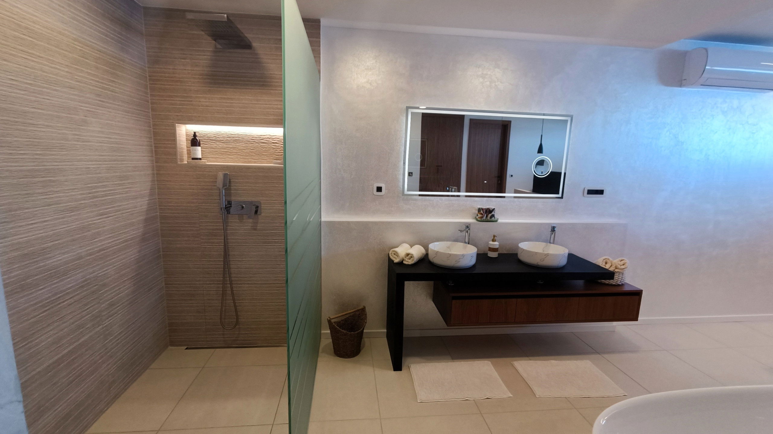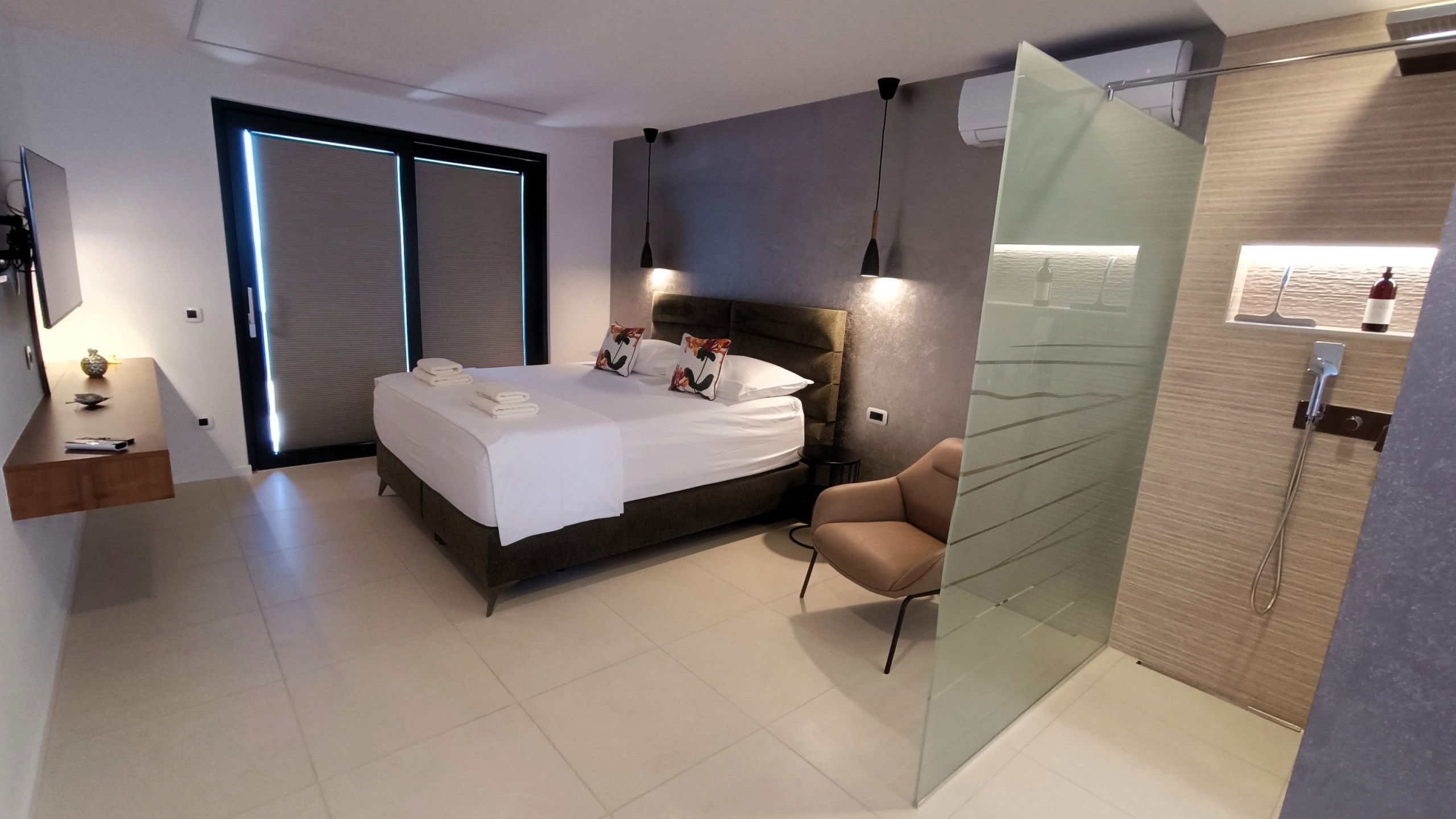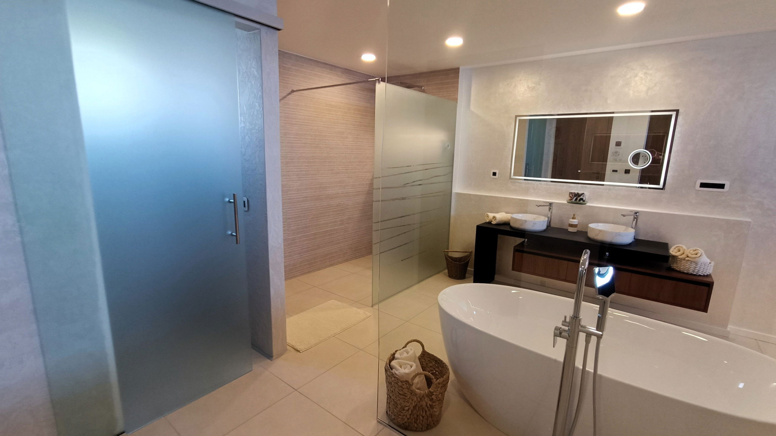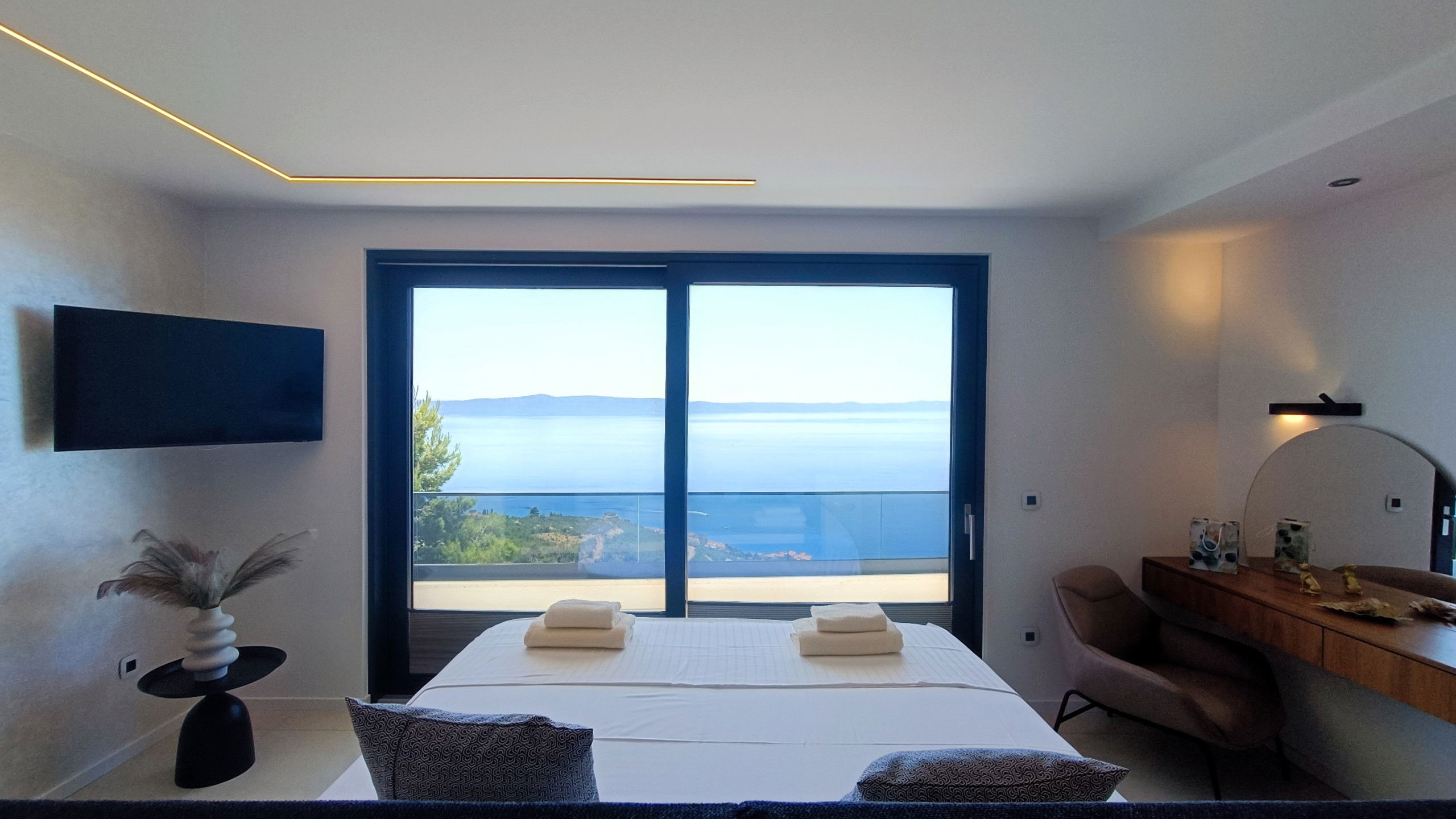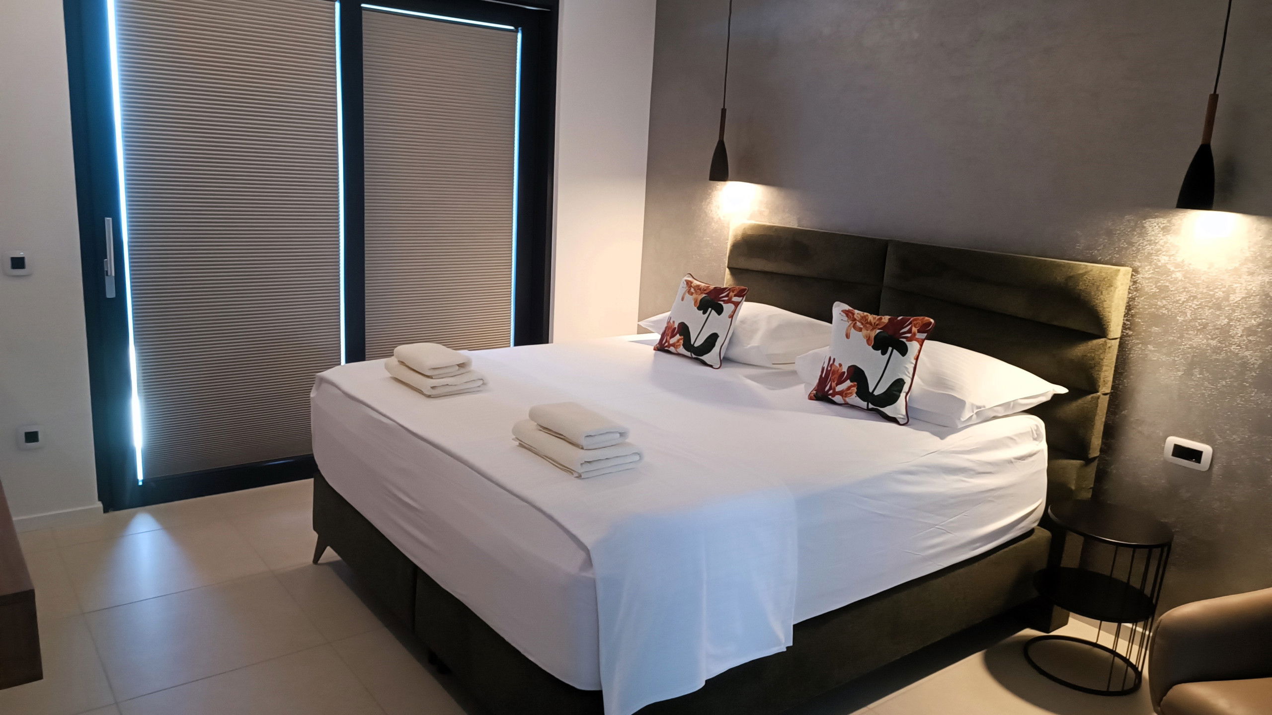 On the floor, you will find two spacious bedrooms with box spring beds (king-size) and integrated bathrooms, each equipped with a shower (and bathtub), double washbasin, LED mirror, and separate toilet. All bedrooms are air-conditioned and feature a flat-screen TV, a wardrobe, and an elegant dressing table. From here, you have access to the terrace and can enjoy the fantastic view of the sea and the surrounding mountains. Each bedroom has a sea view and is equipped with blackout blinds.