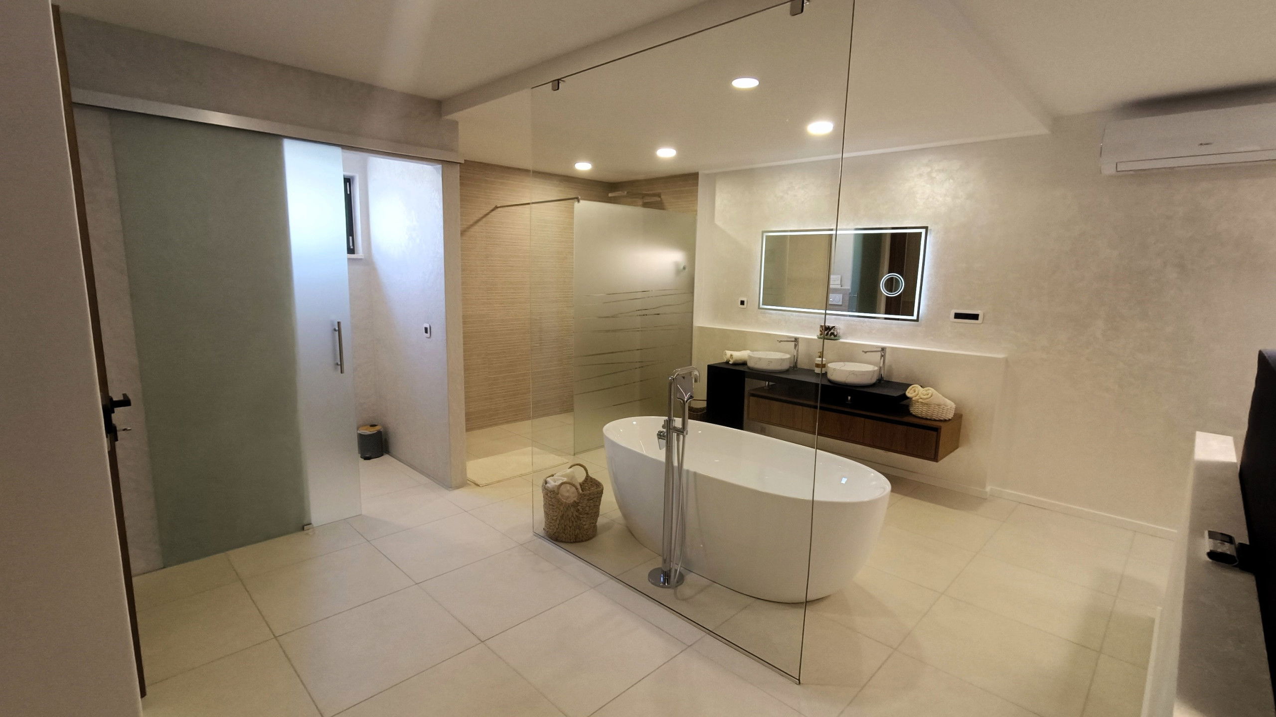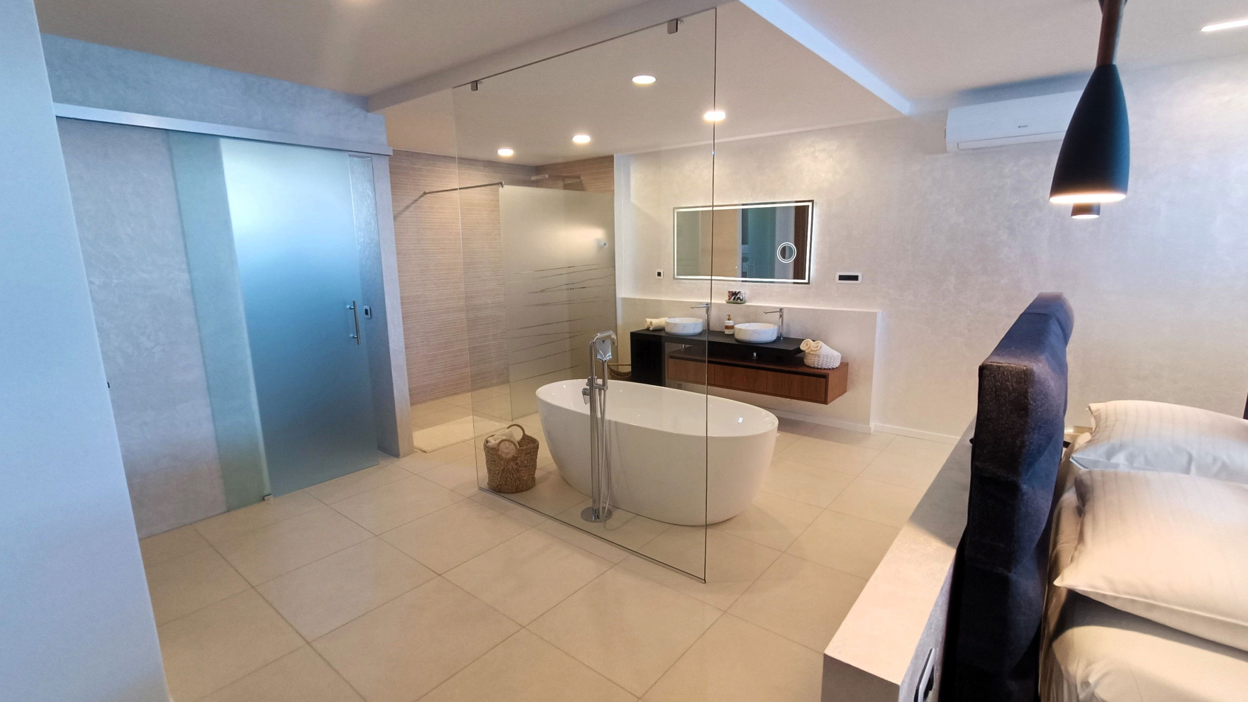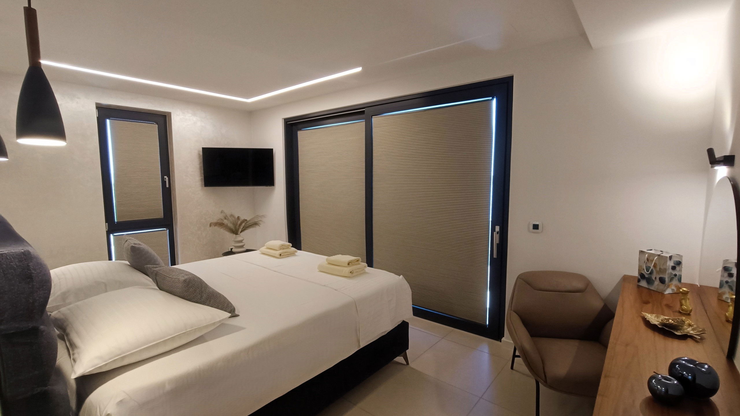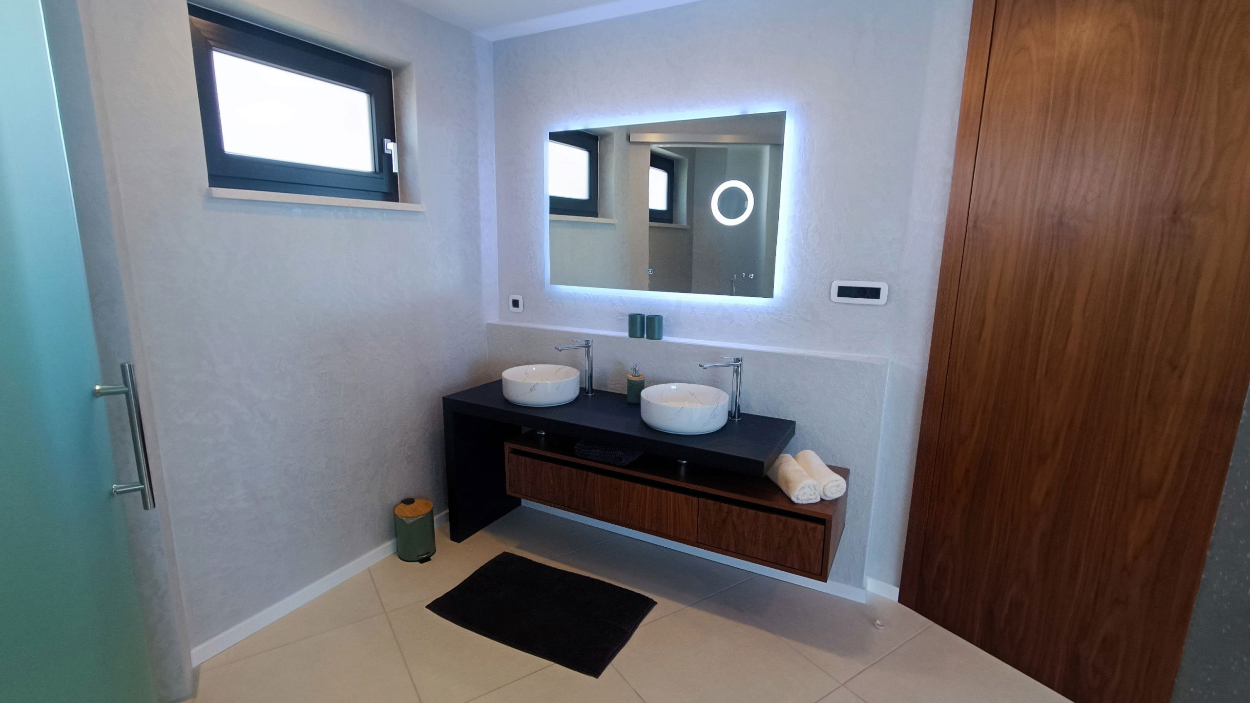 On the floor, you will find two spacious bedrooms with box spring beds (king-size) and integrated bathrooms, each equipped with a shower (and bathtub), double washbasin, LED mirror, and separate toilet. All bedrooms are air-conditioned and feature a flat-screen TV, a wardrobe, and an elegant dressing table. From here, you have access to the terrace and can enjoy the fantastic view of the sea and the surrounding mountains. Each bedroom has a sea view and is equipped with blackout blinds.