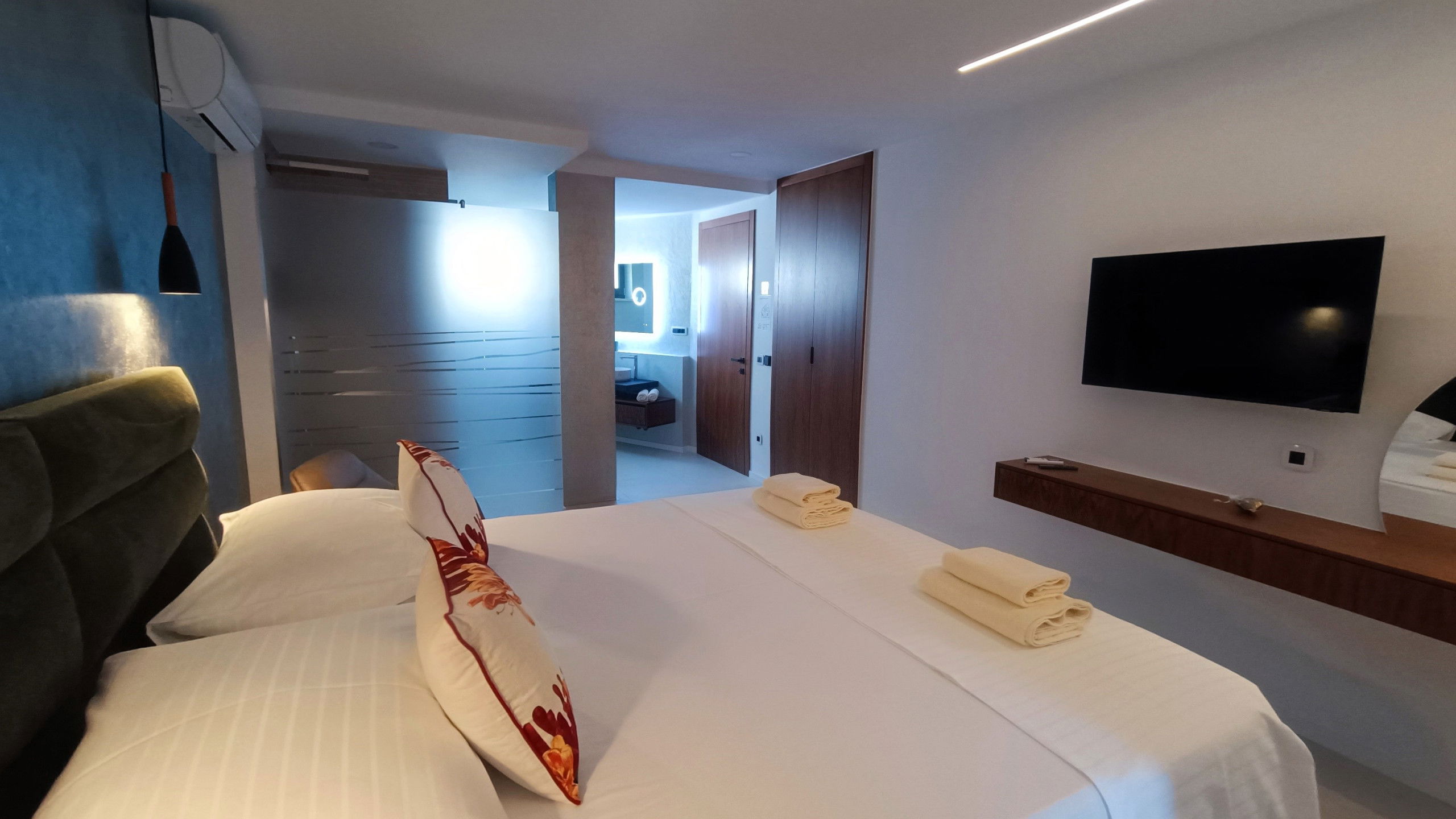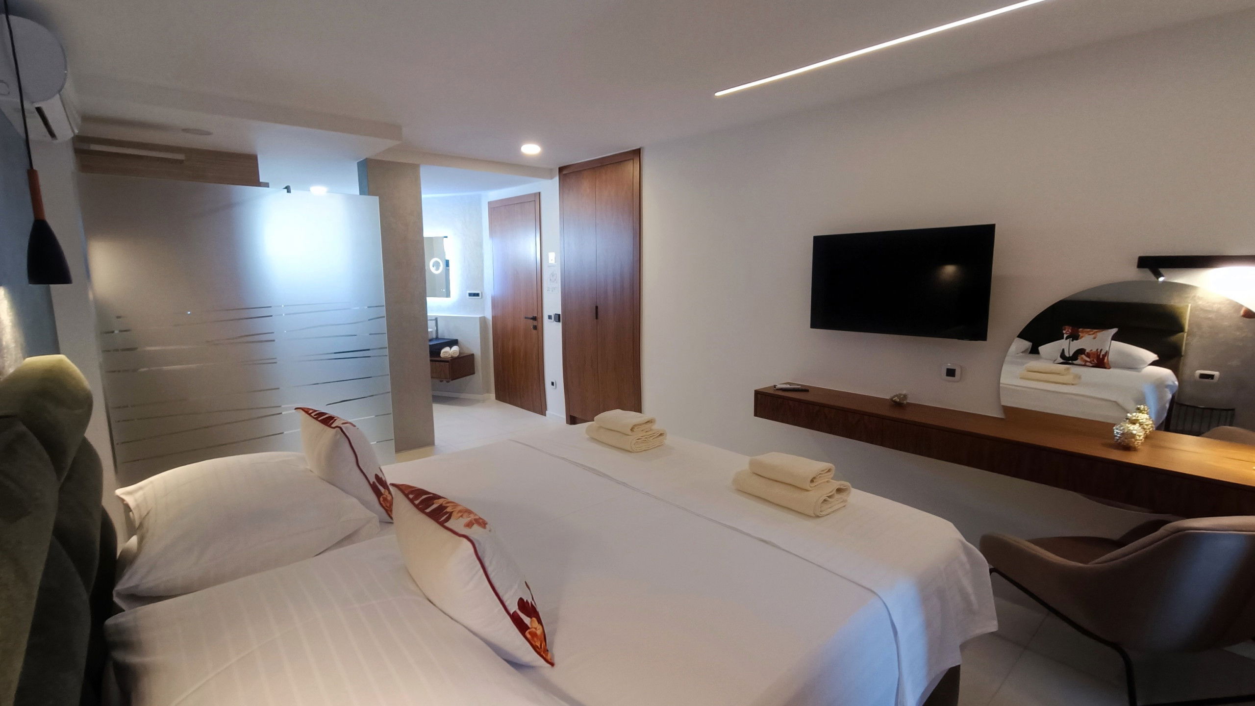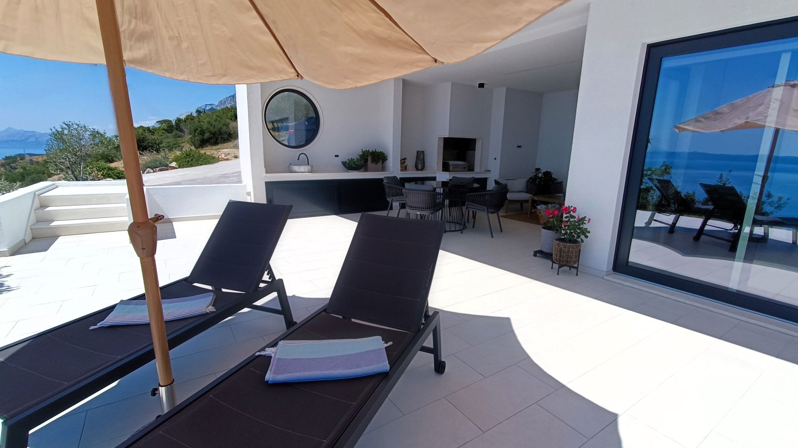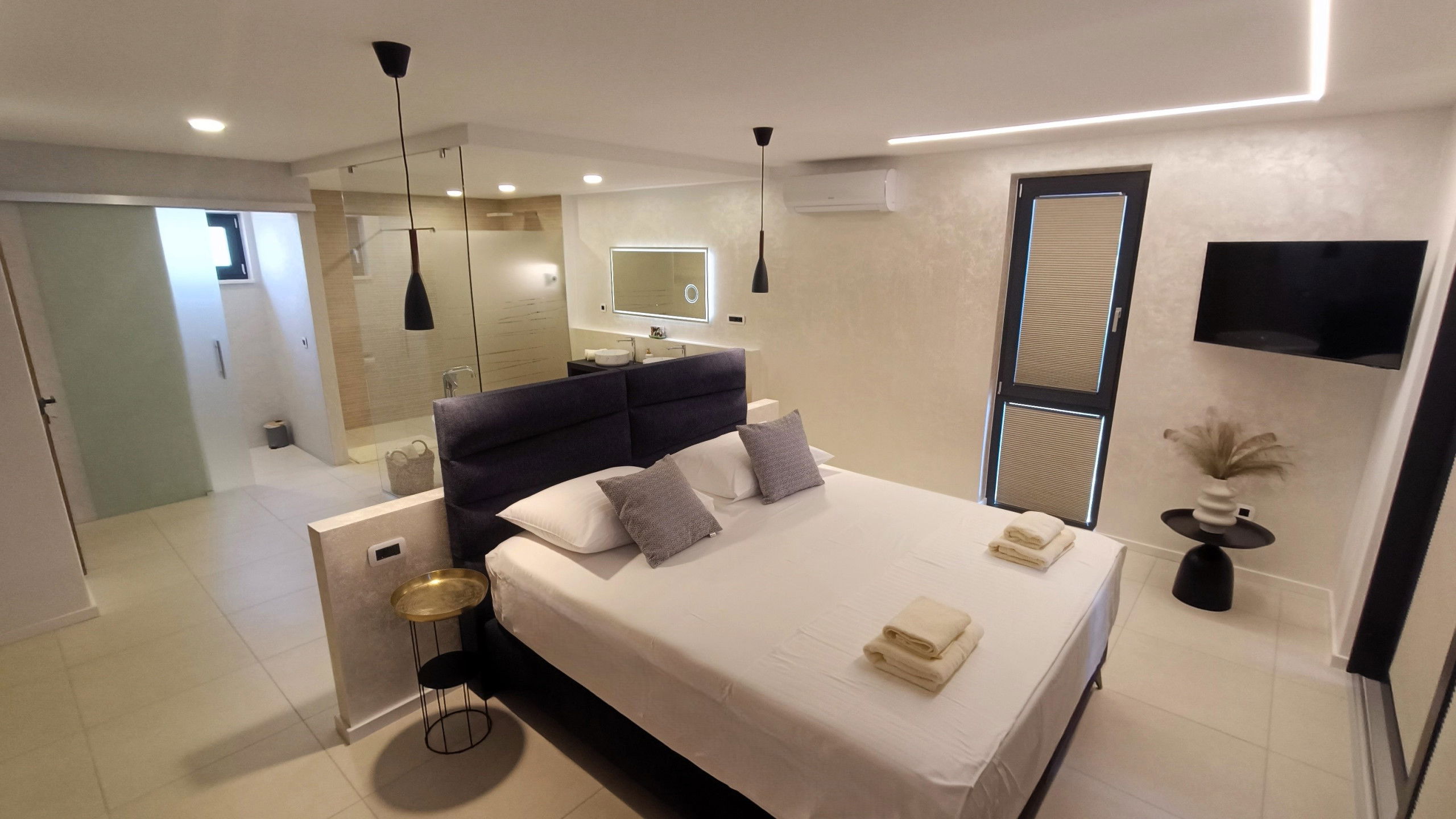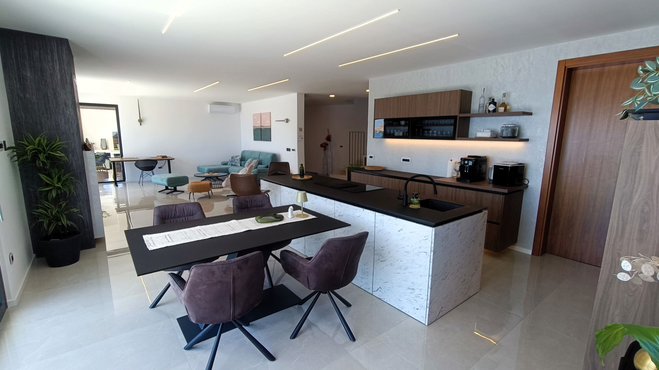 On the floor, you will find two spacious bedrooms with box spring beds (king-size) and integrated bathrooms, each equipped with a shower (and bathtub), double washbasin, LED mirror, and separate toilet. All bedrooms are air-conditioned and feature a flat-screen TV, a wardrobe, and an elegant dressing table. From here, you have access to the terrace and can enjoy the fantastic view of the sea and the surrounding mountains. Each bedroom has a sea view and is equipped with blackout blinds.