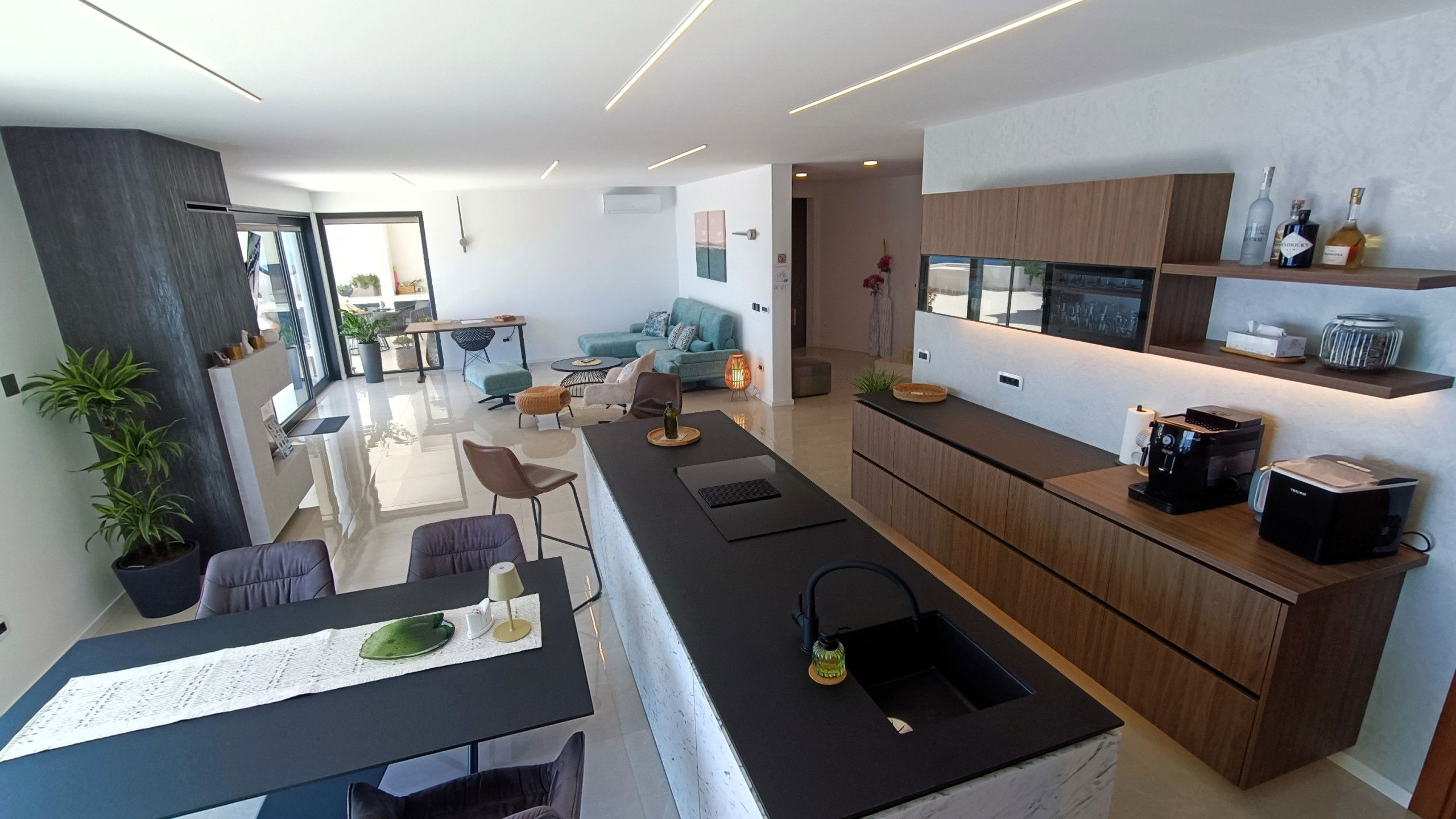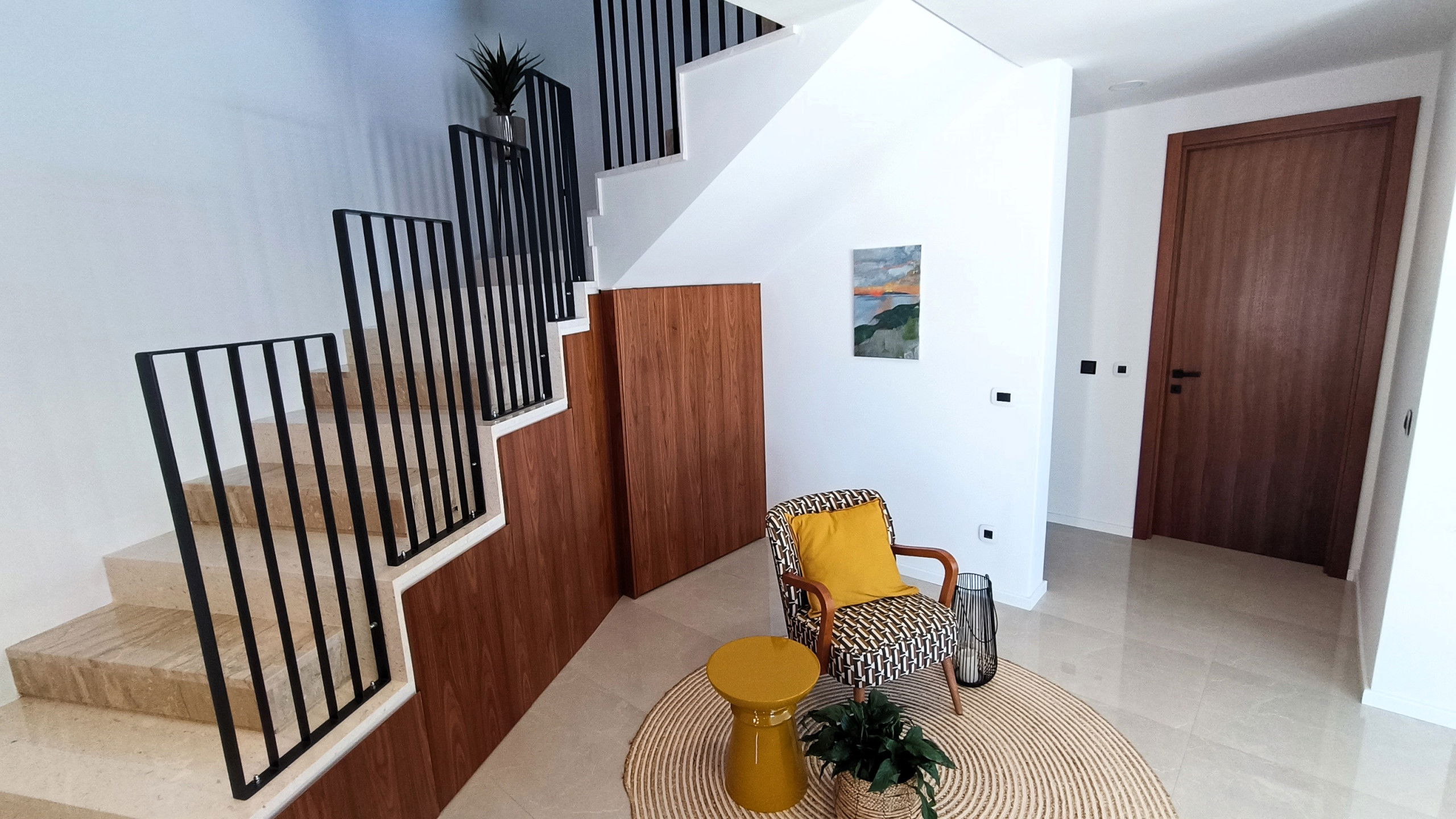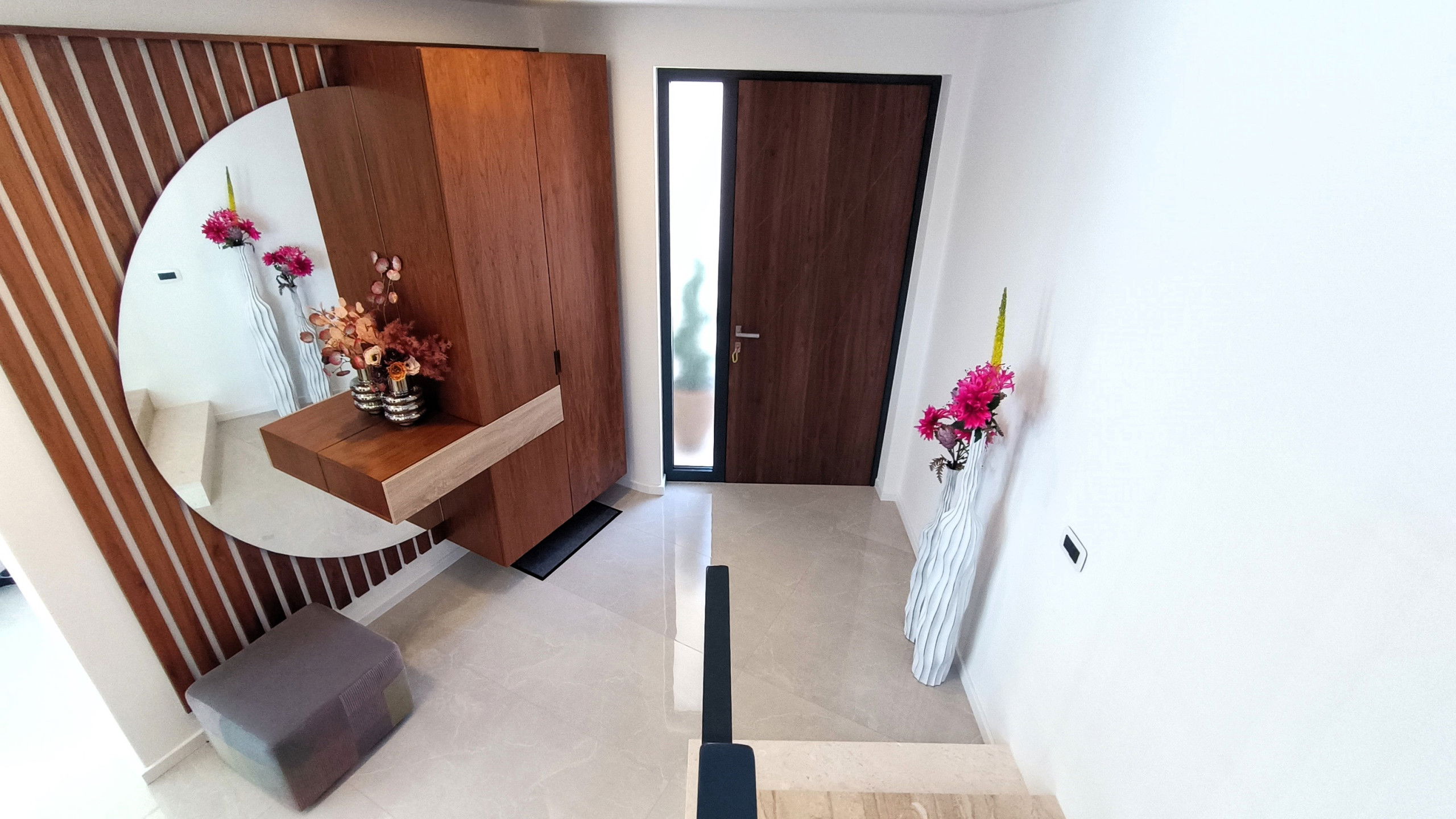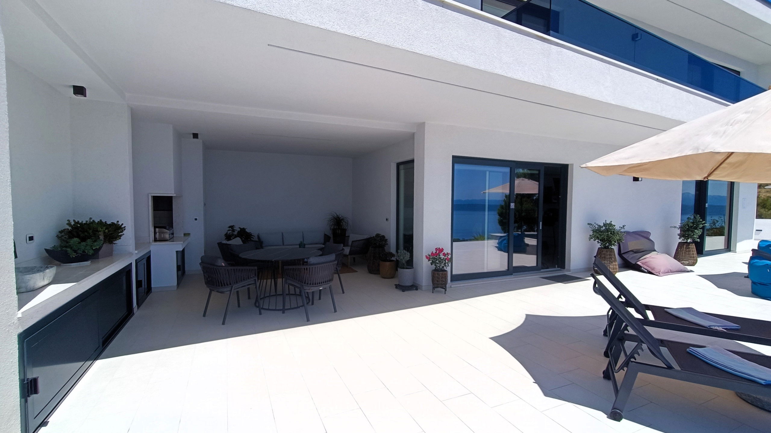 On the floor, you will find two spacious bedrooms with box spring beds (king-size) and integrated bathrooms, each equipped with a shower (and bathtub), double washbasin, LED mirror, and separate toilet. All bedrooms are air-conditioned and feature a flat-screen TV, a wardrobe, and an elegant dressing table. From here, you have access to the terrace and can enjoy the fantastic view of the sea and the surrounding mountains. Each bedroom has a sea view and is equipped with blackout blinds.