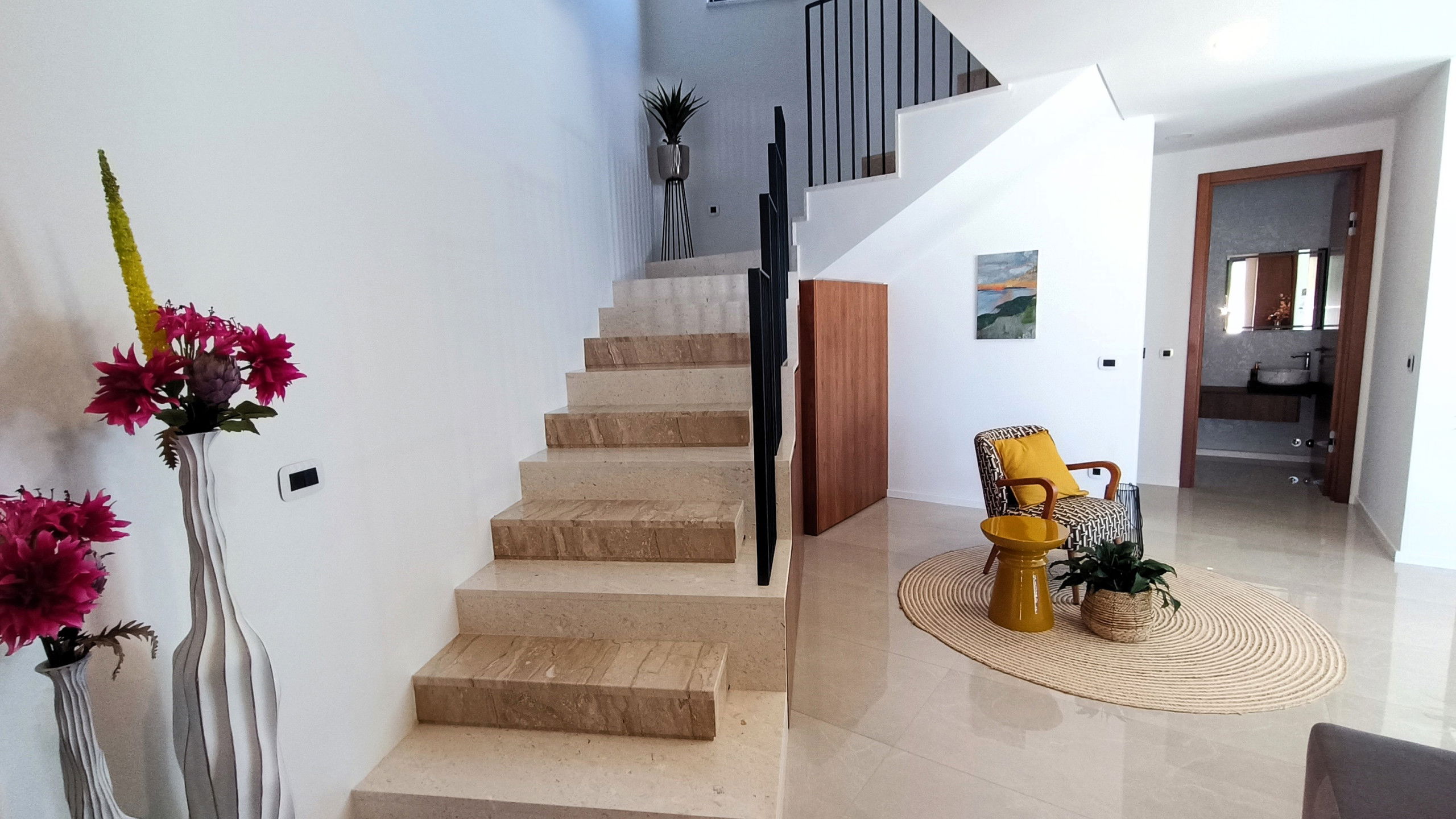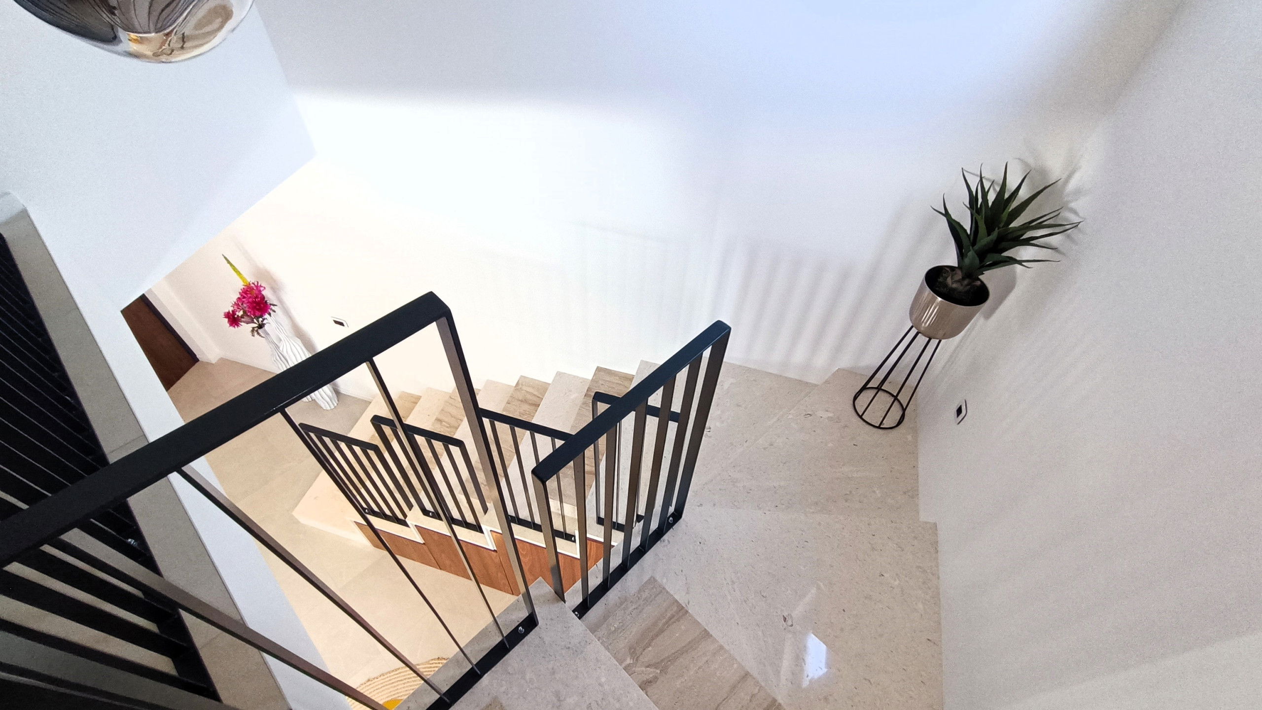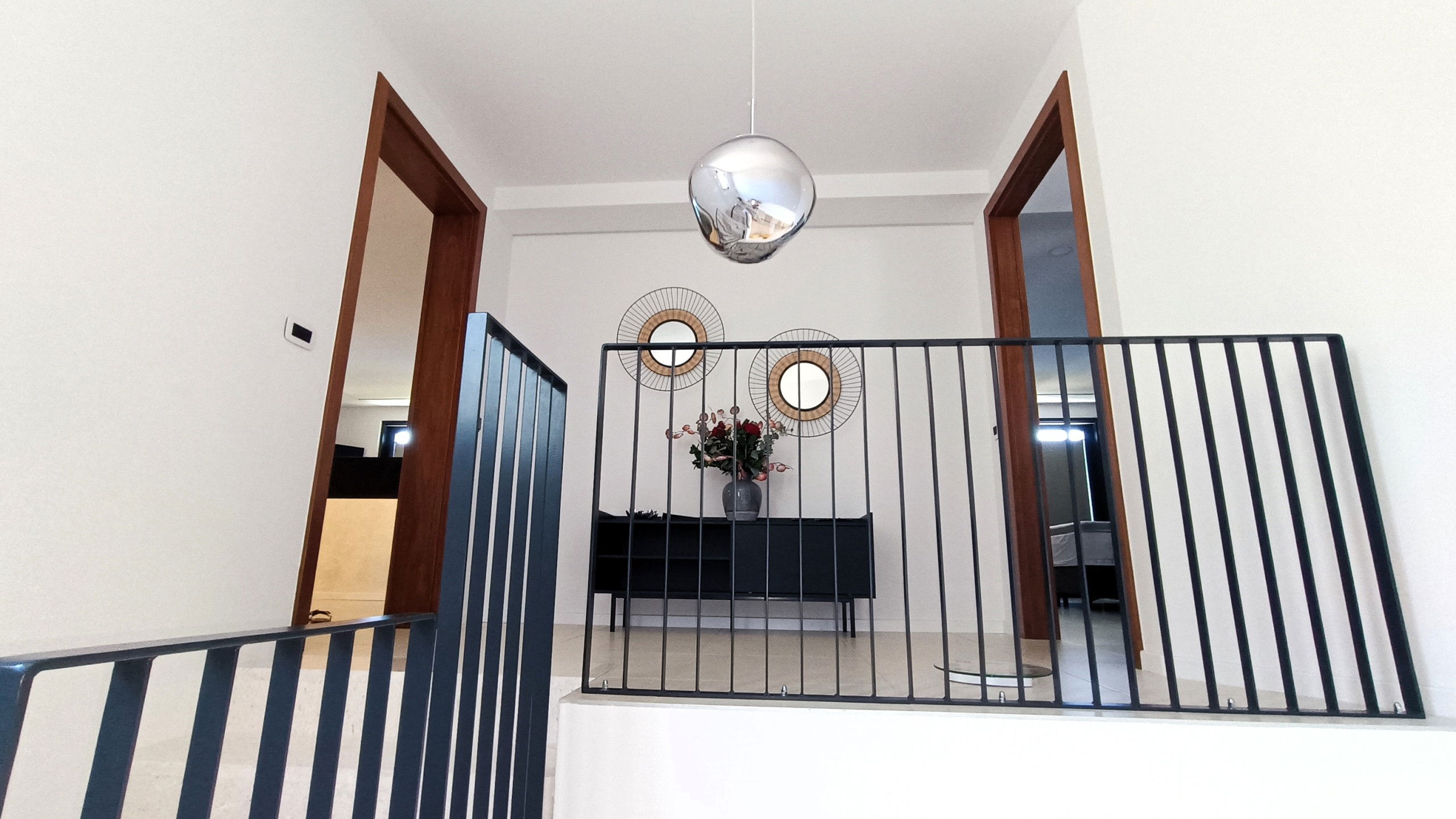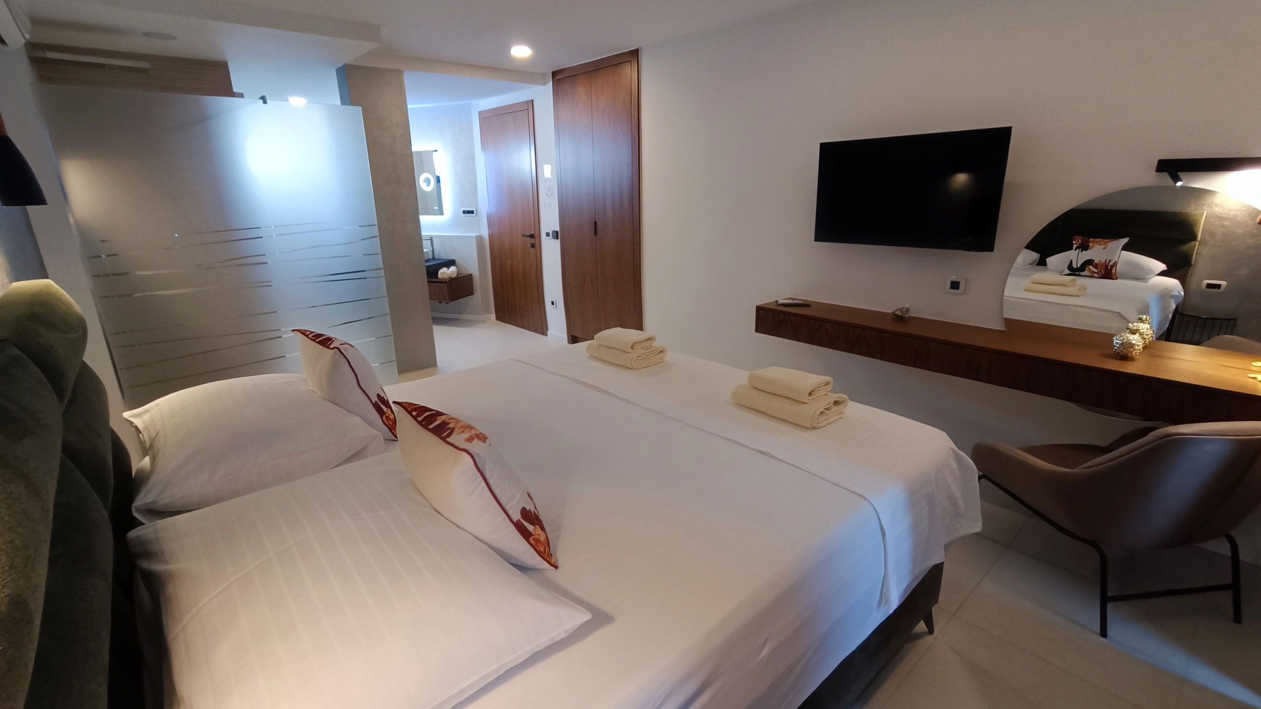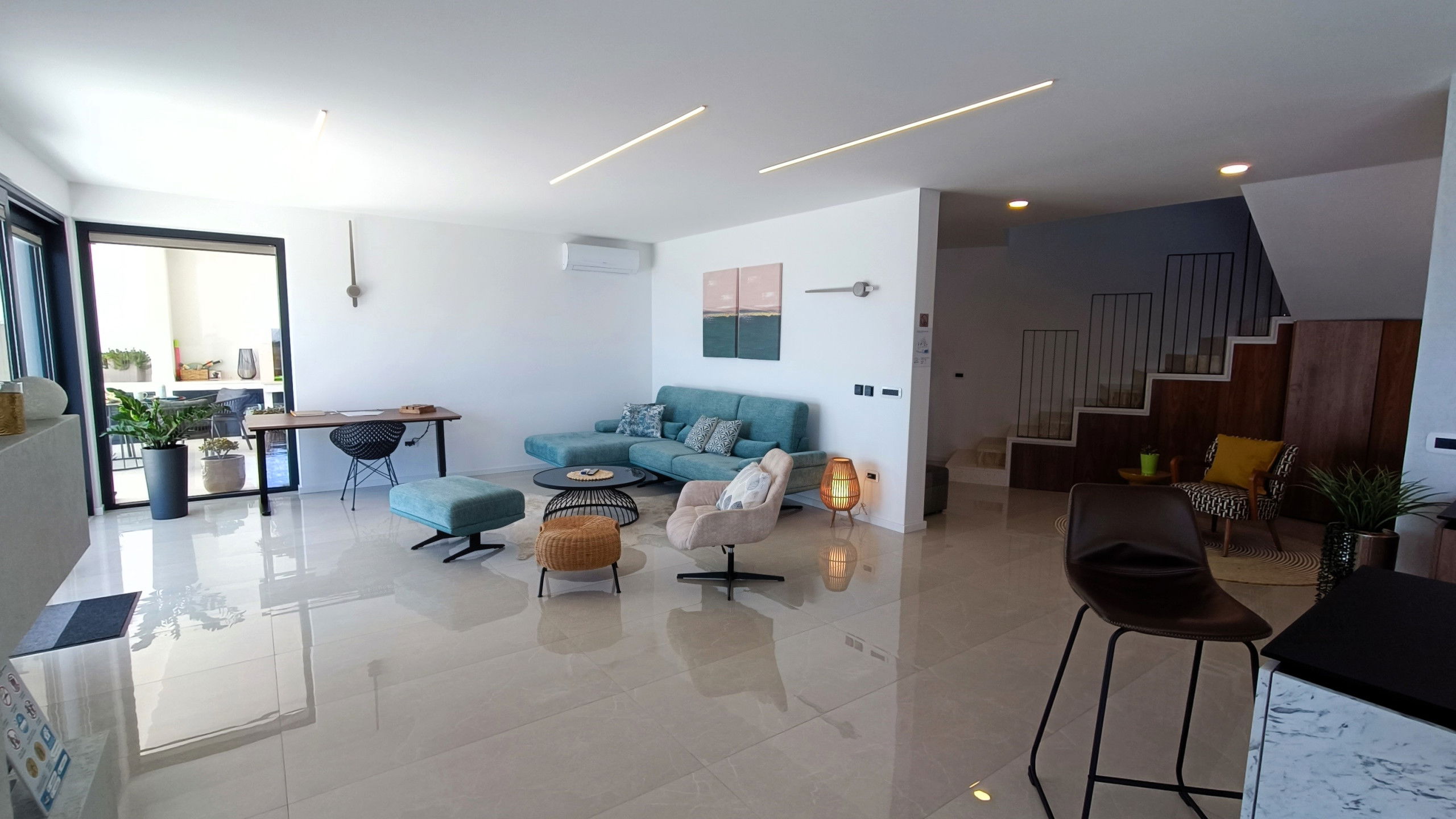On the floor, you will find two spacious bedrooms with box spring beds (king-size) and integrated bathrooms, each equipped with a shower (and bathtub), double washbasin, LED mirror, and separate toilet. All bedrooms are air-conditioned and feature a flat-screen TV, a wardrobe, and an elegant dressing table. From here, you have access to the terrace and can enjoy the fantastic view of the sea and the surrounding mountains. Each bedroom has a sea view and is equipped with blackout blinds.