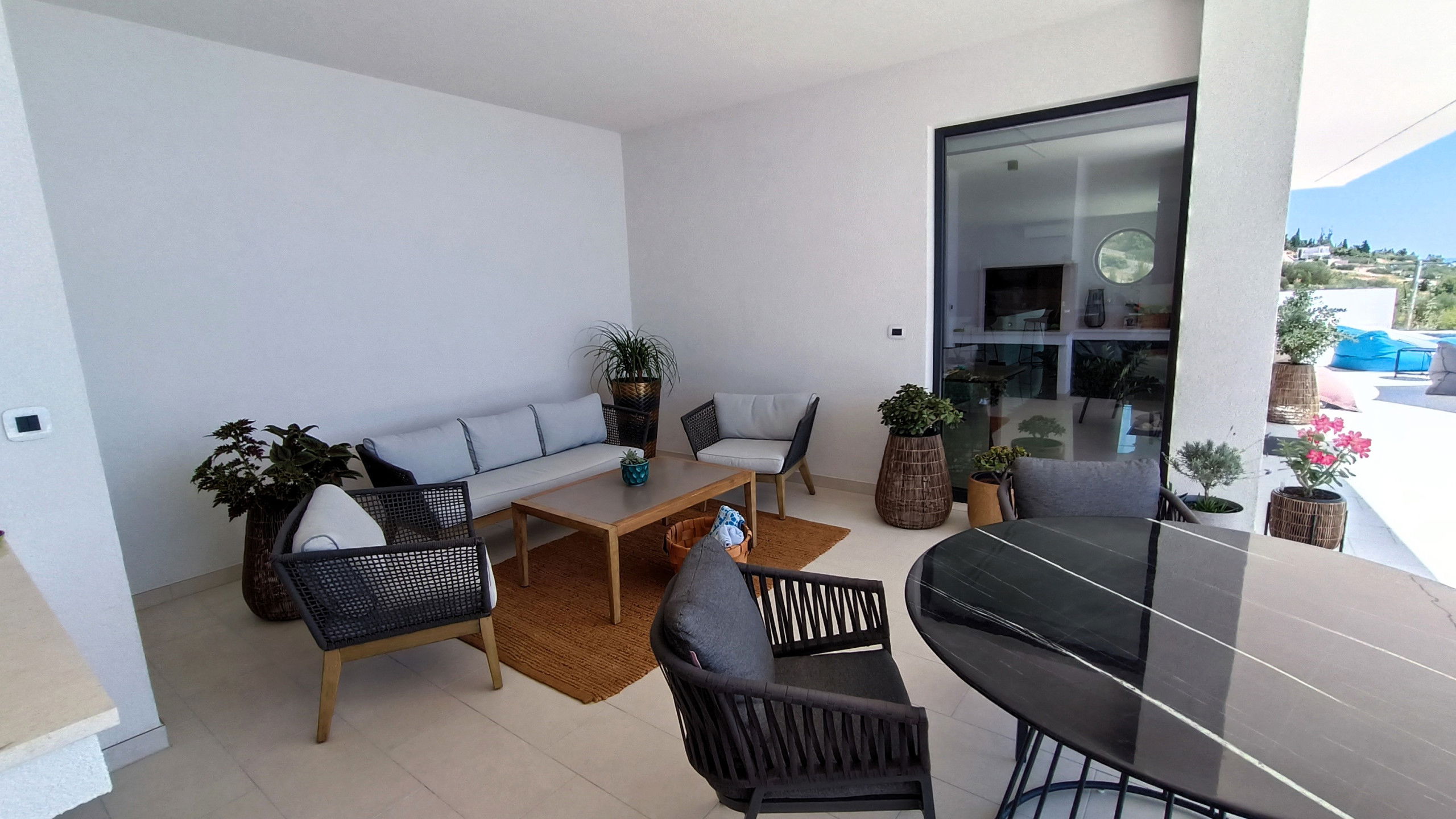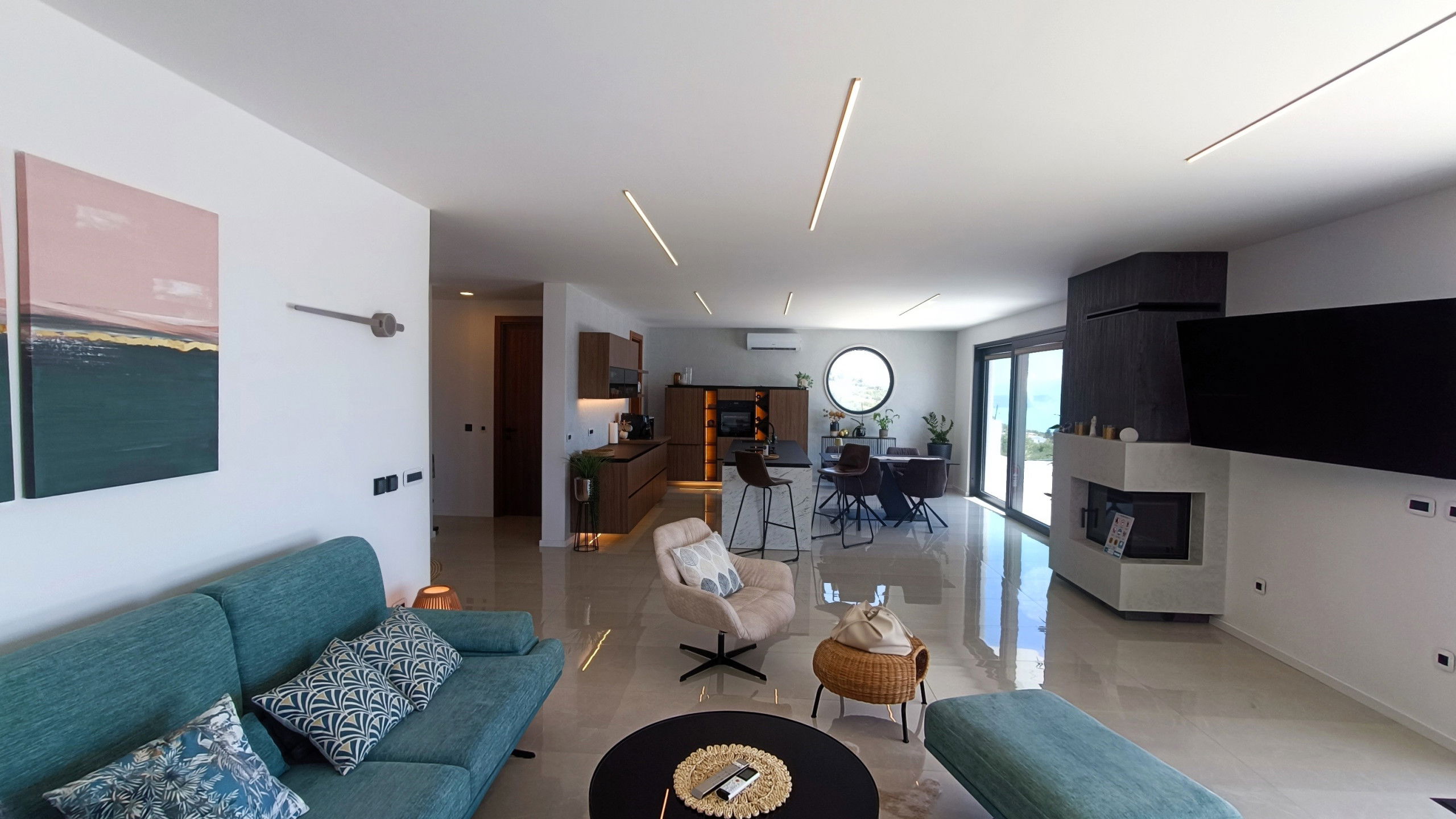 Design Villa SkyBlue impresses with spaciously designed bedrooms, each featuring integrated bathrooms, as well as an impressive large, heated swimming pool and a panoramic terrace with modern loungers and lounge furniture that offer a breathtaking view of the sea - a real highlight.