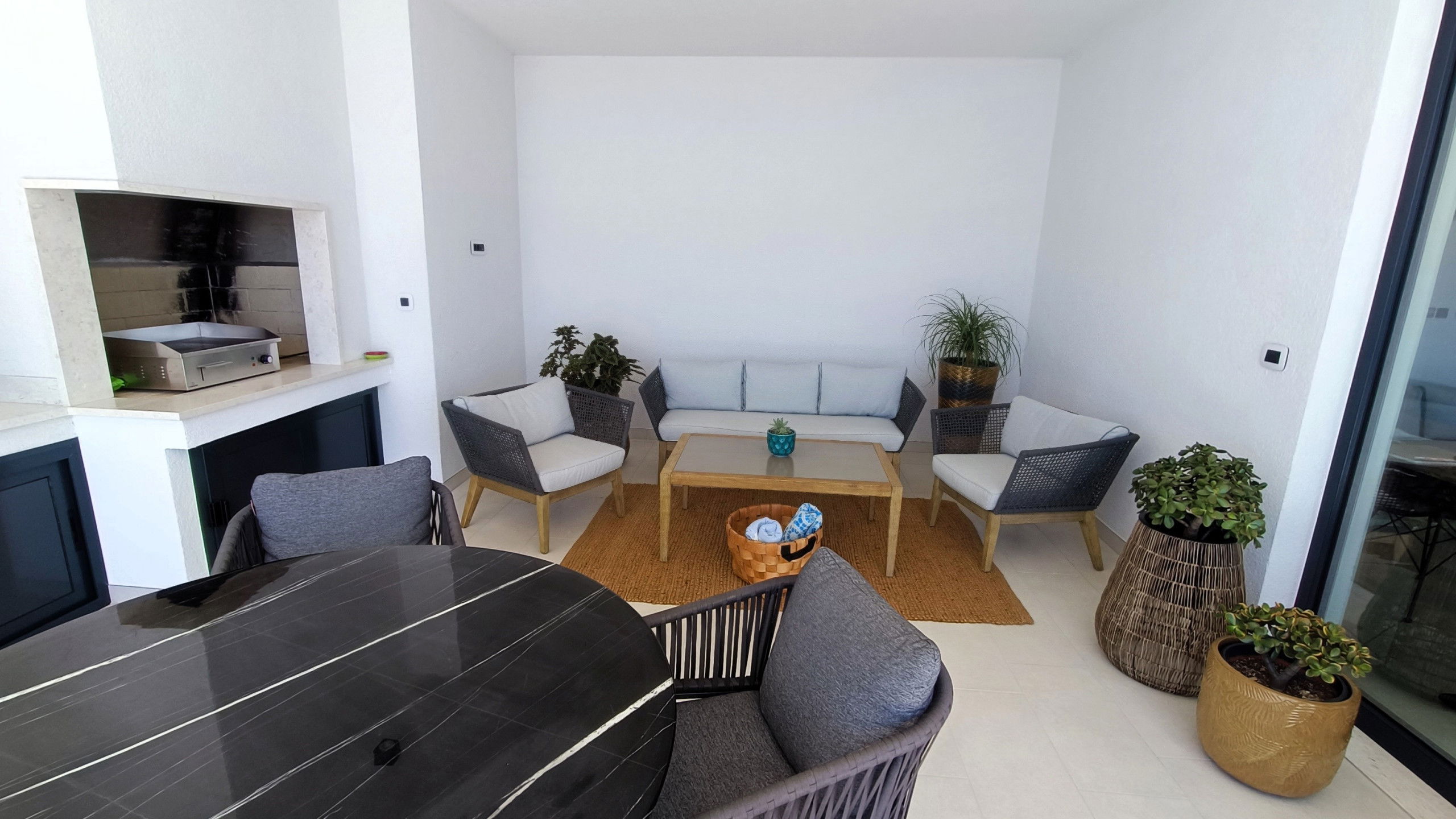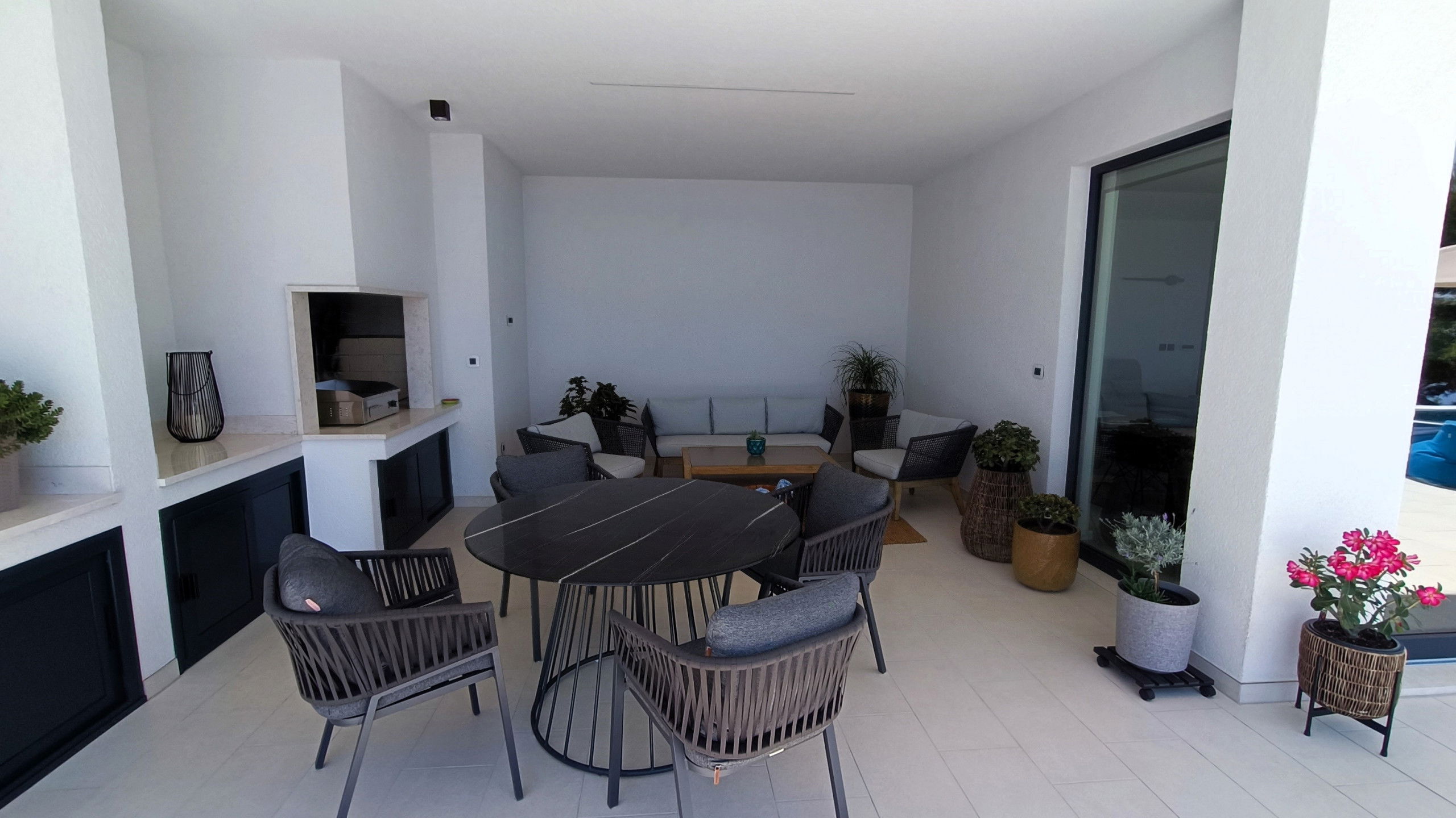 The main terrace with the 43m² heated swimming pool, sun loungers, and an outdoor shower invites you to relax and enjoy. A large covered outdoor terrace offers a shady retreat that also serves as an outdoor dining area with sea view.