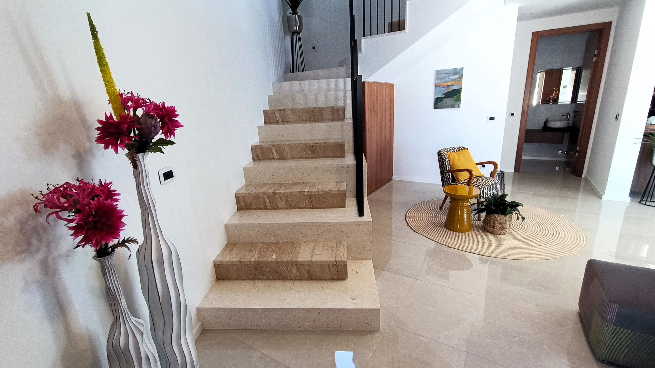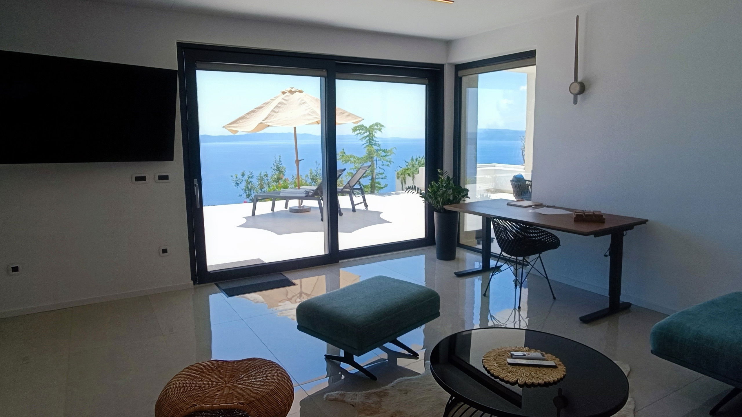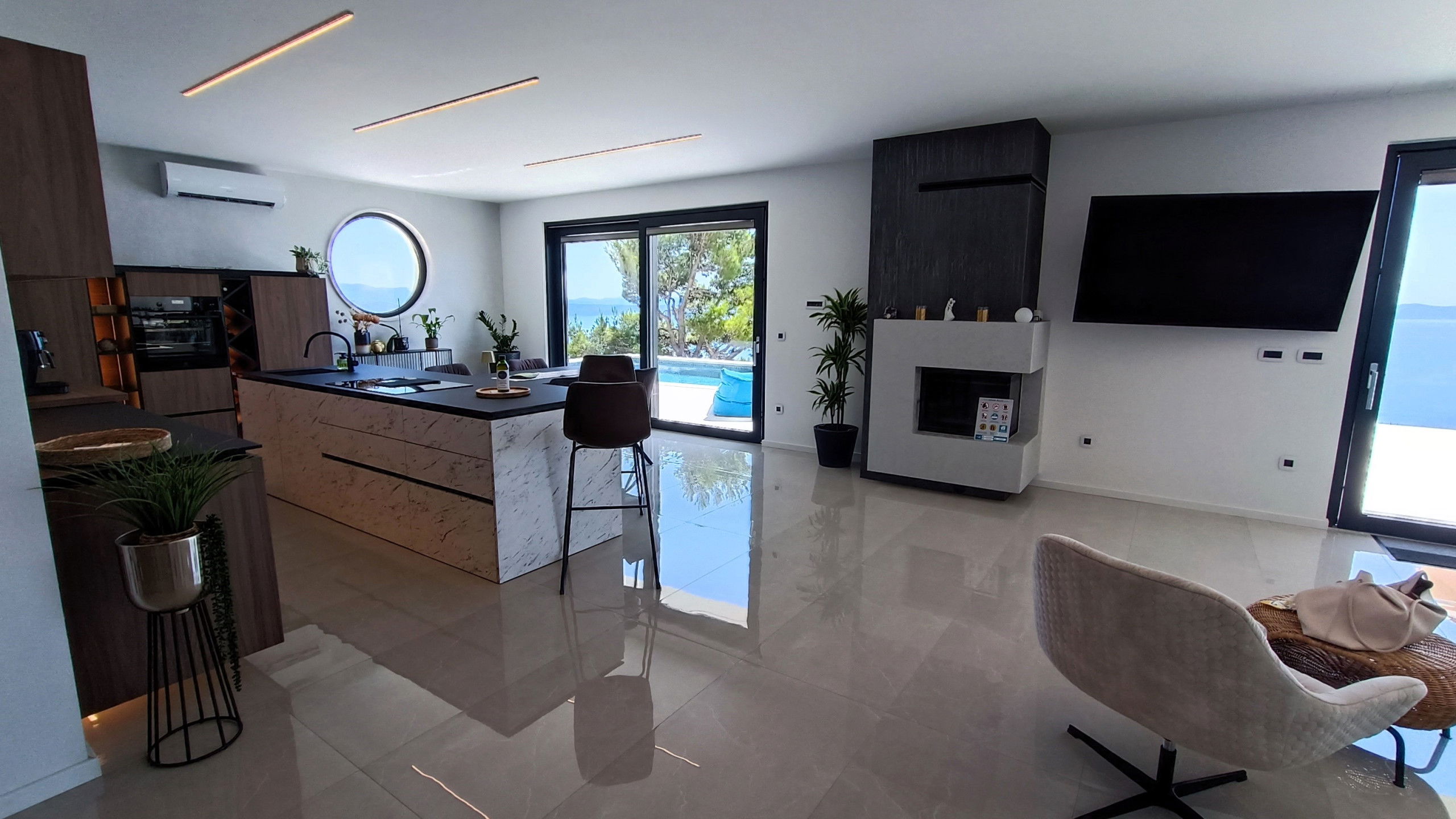 On the ground floor, you will find the fully equipped kitchen, a dining area for 4 people, and an inviting living room with access to the pool terrace, from which you can enjoy the majestic view of the Adriatic Sea. The open living room is furnished with a cozy sofa, an OLED flat TV, and a fireplace. A desk is also available here.