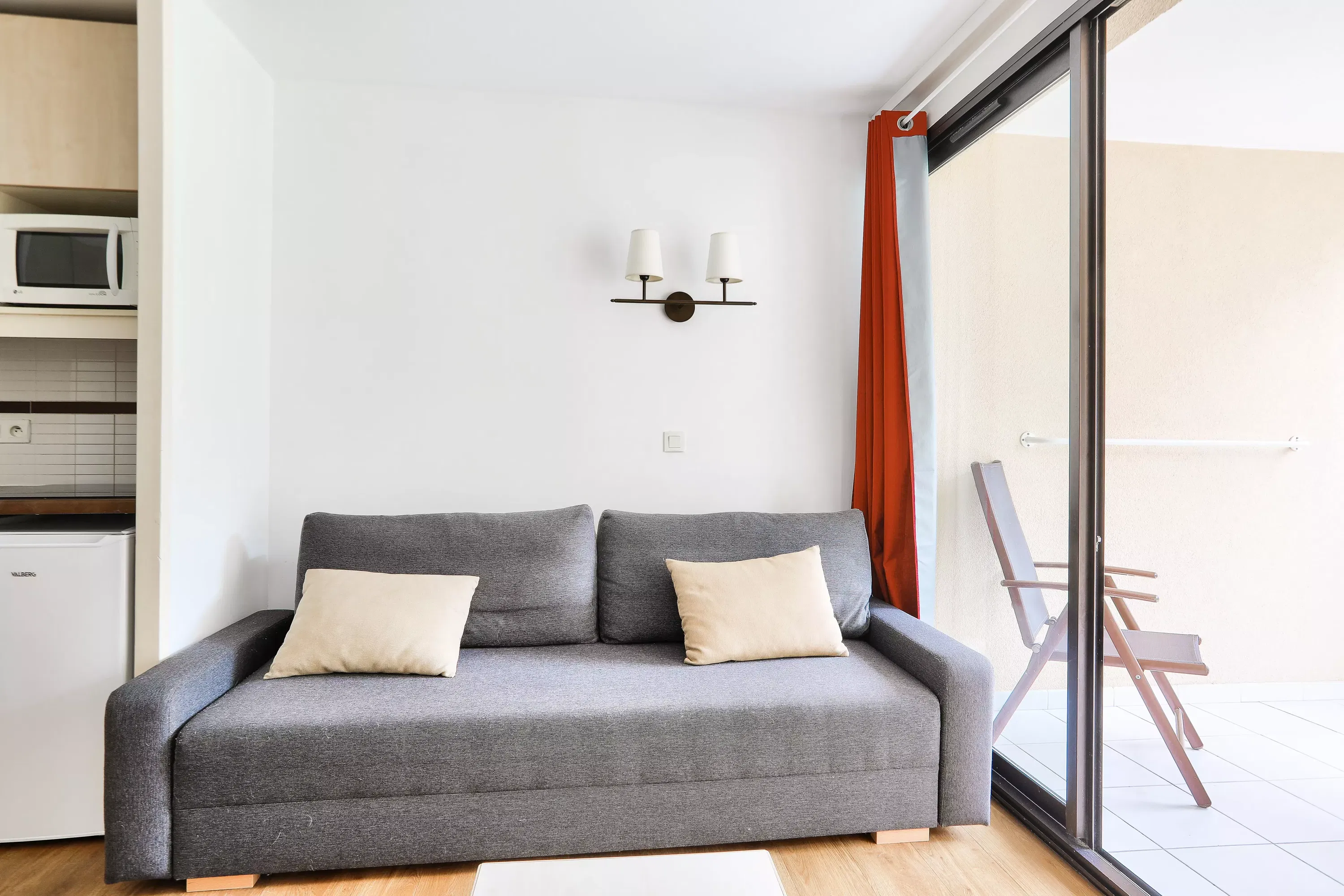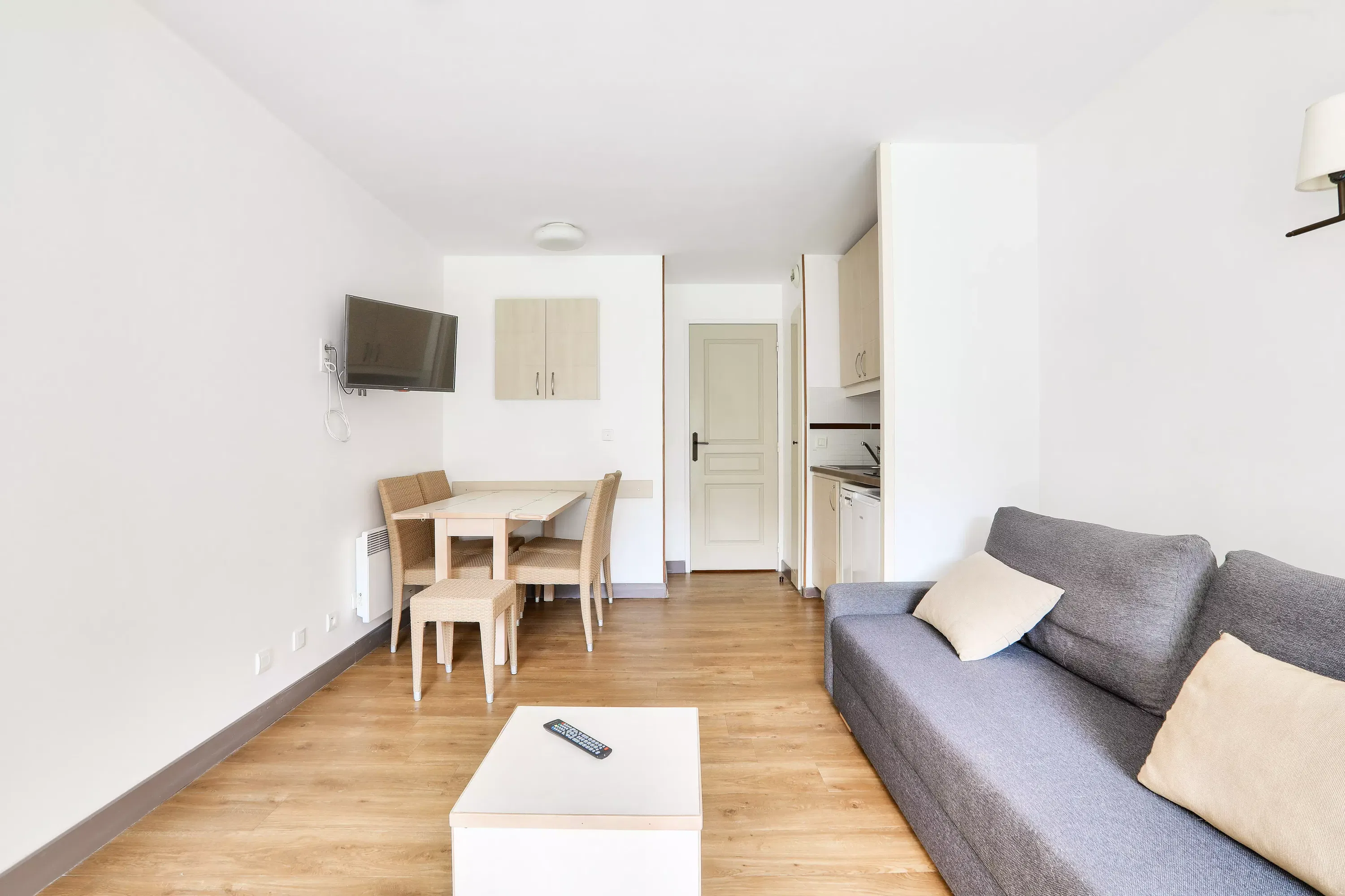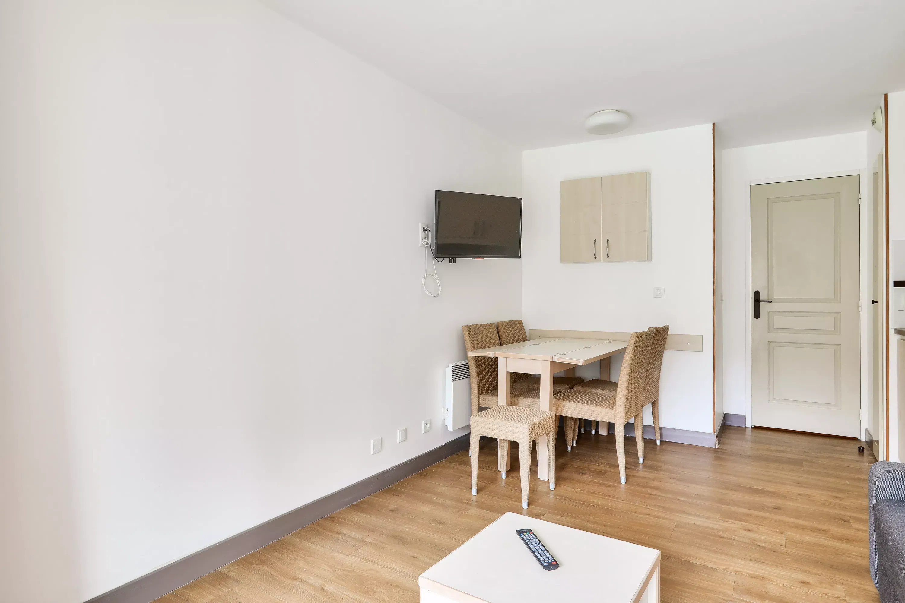 Living room composition: 1 new sofa bed (sleeps 2). Dining area: 1 table with 4 chairs.