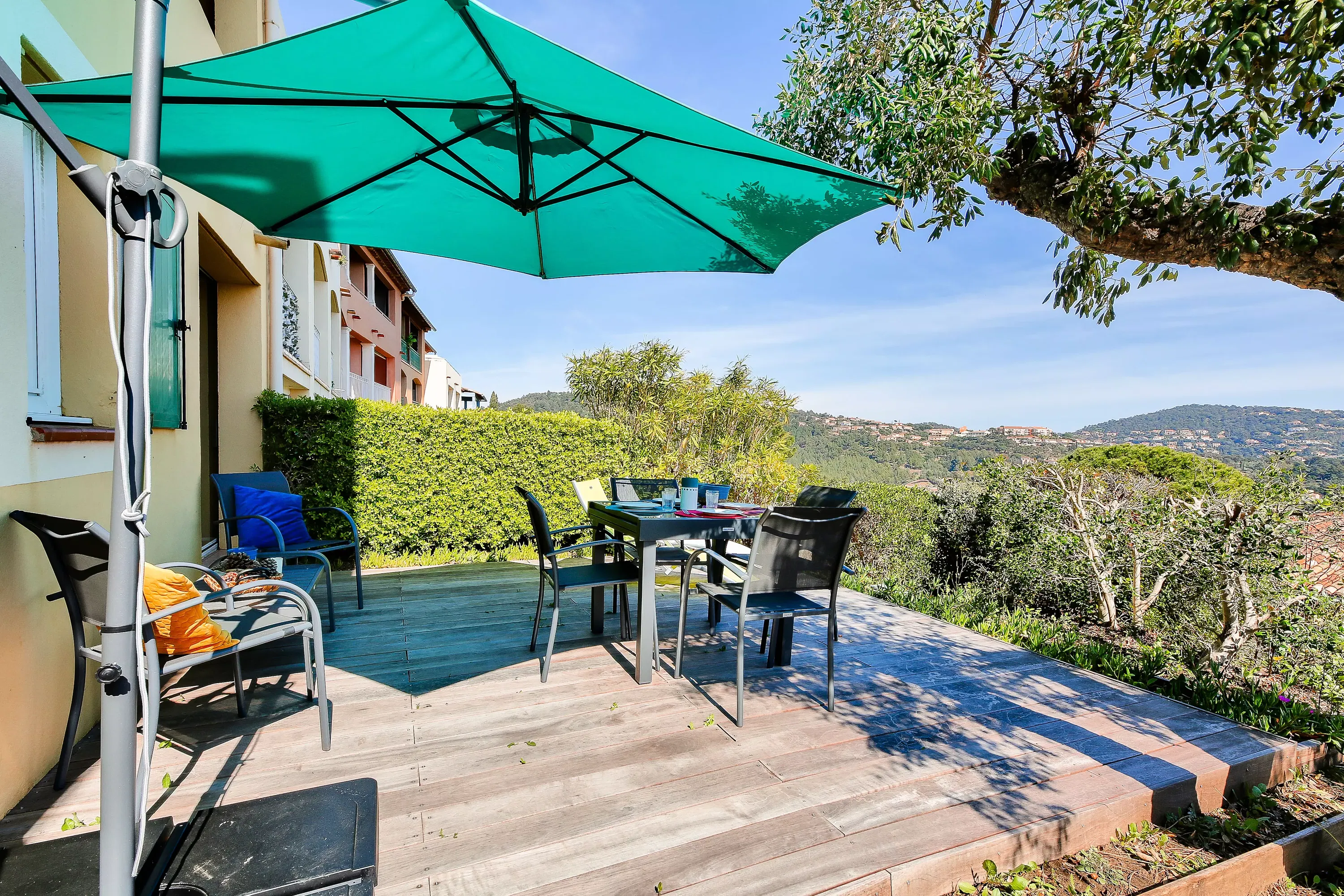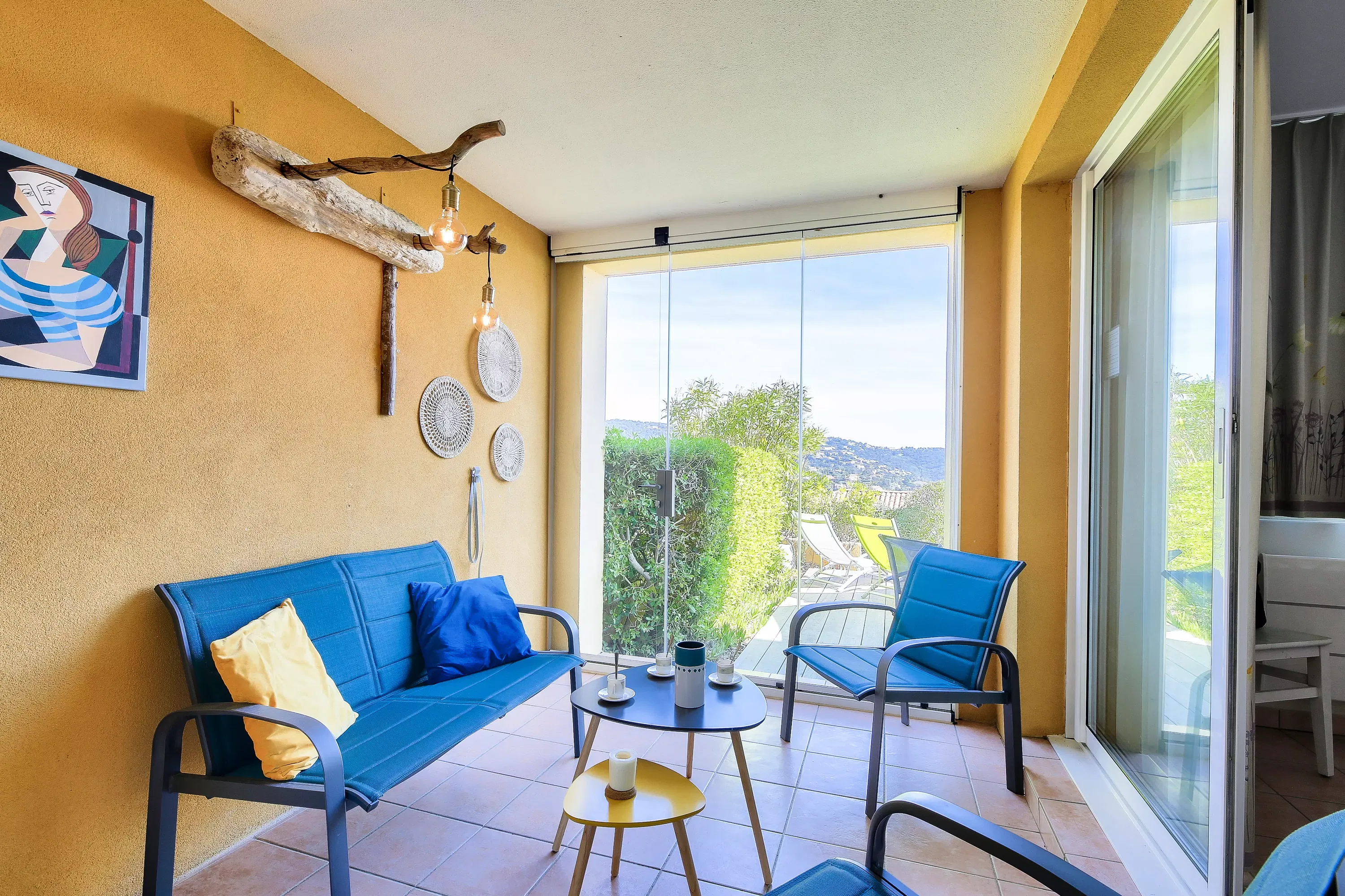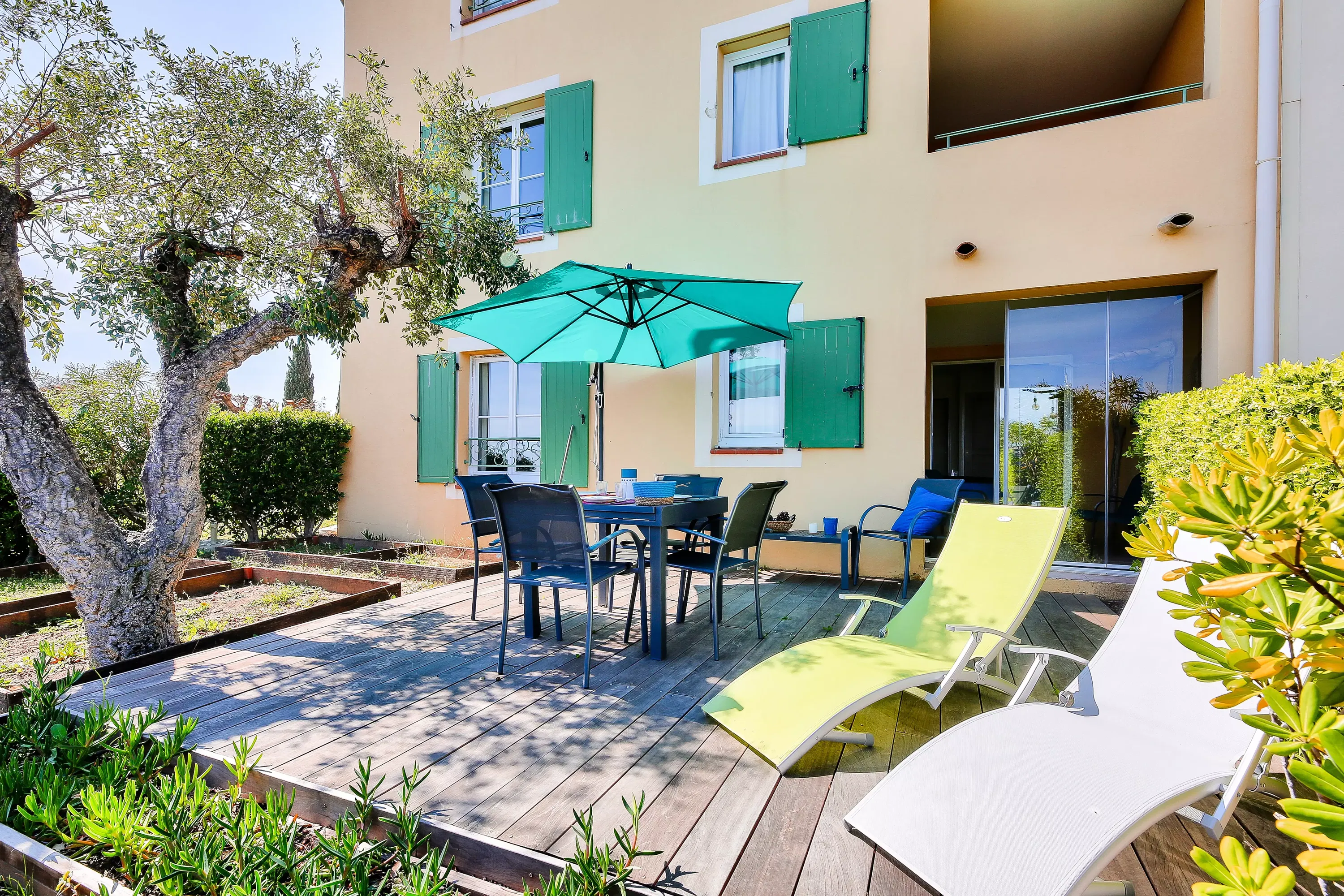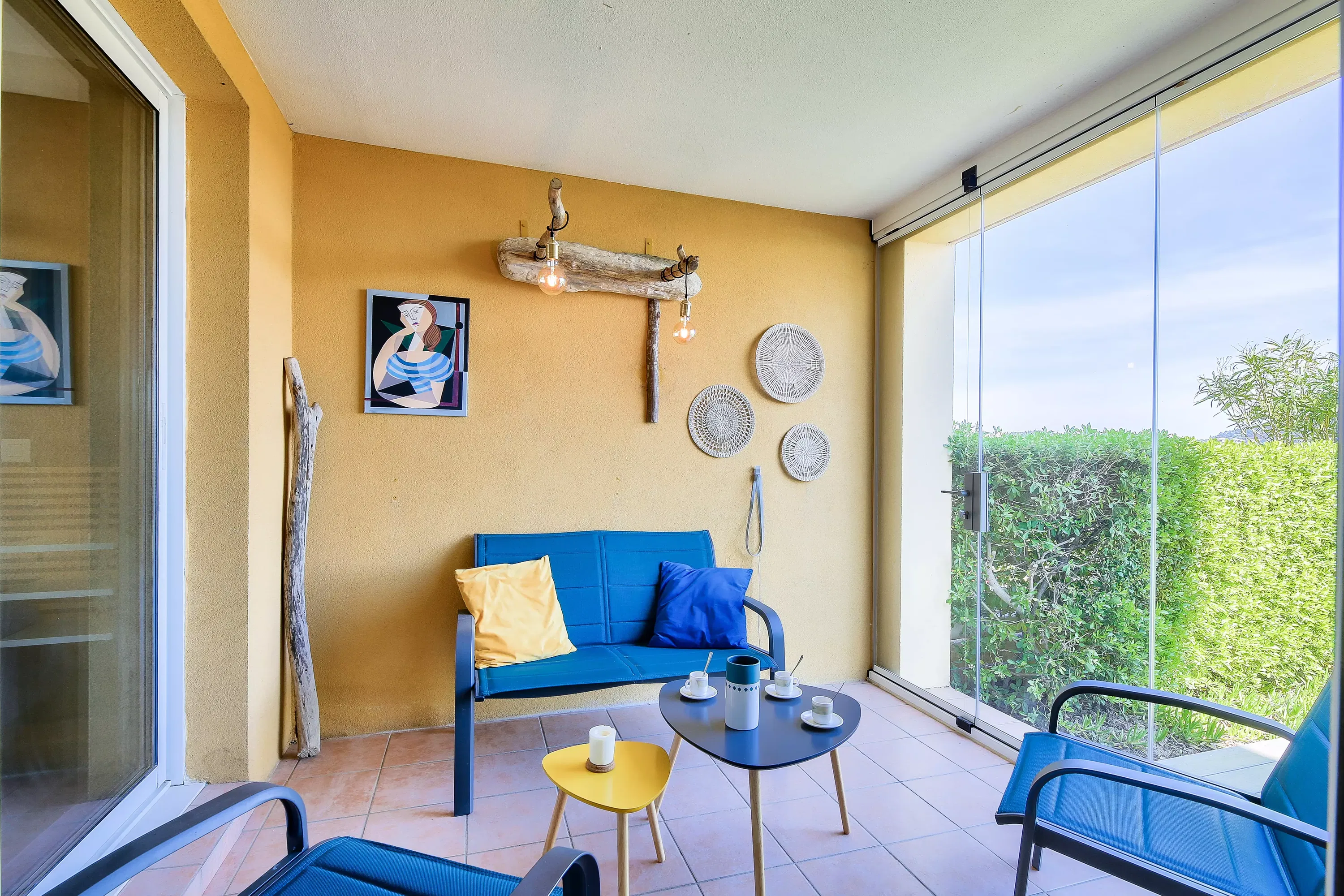 The advantages of this accommodation: air-conditioned ground floor apartment, small garden, covered furnished terrace, sea and garden view, reserved parking space, storage, TV.