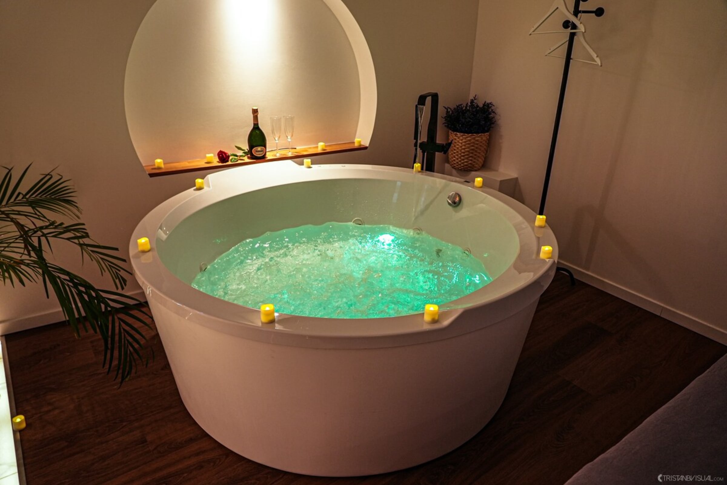 Opposite, an elegant round whirlpool bath invites you to relax, in a completely private space and included in the nightly rate.